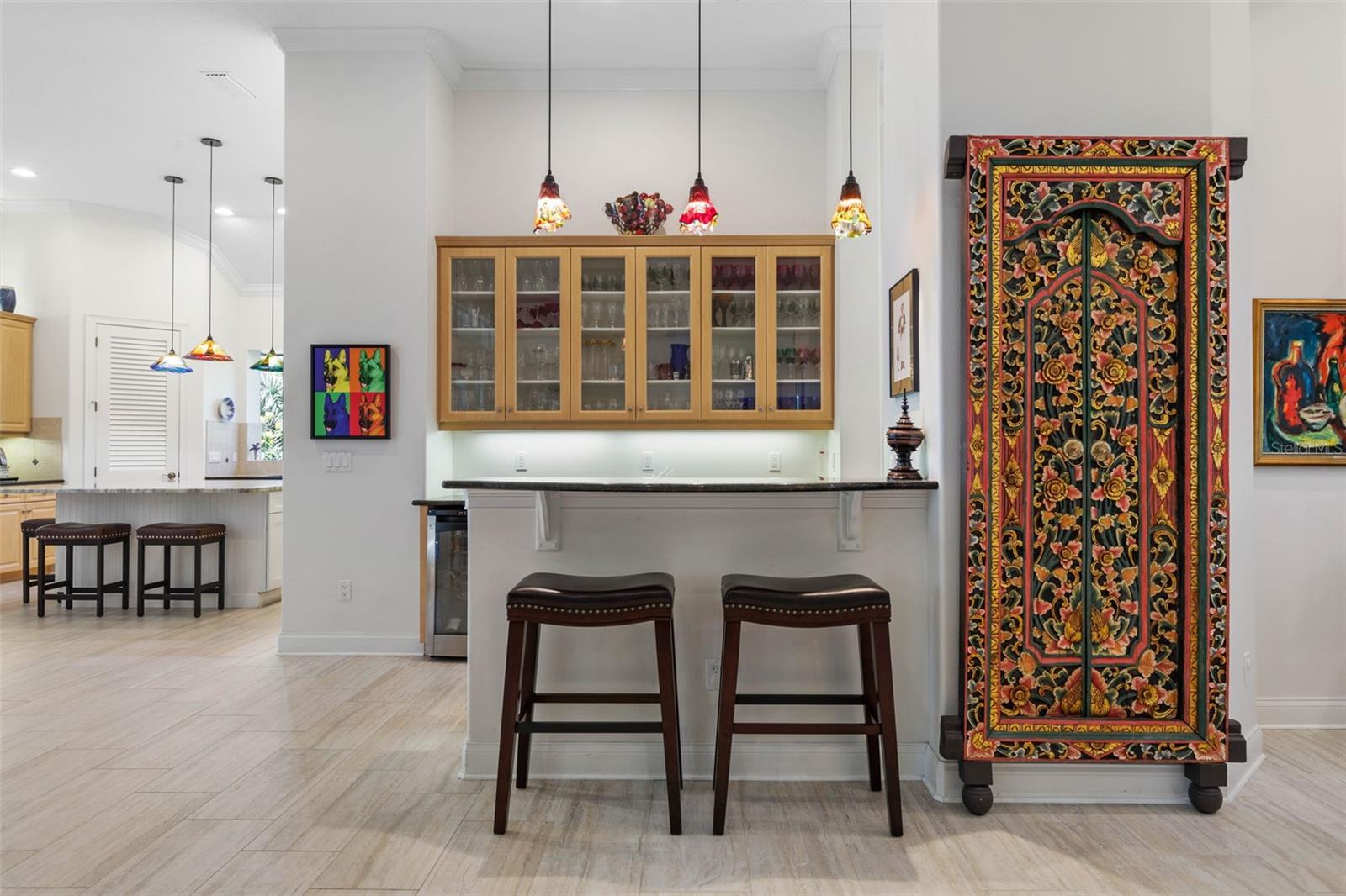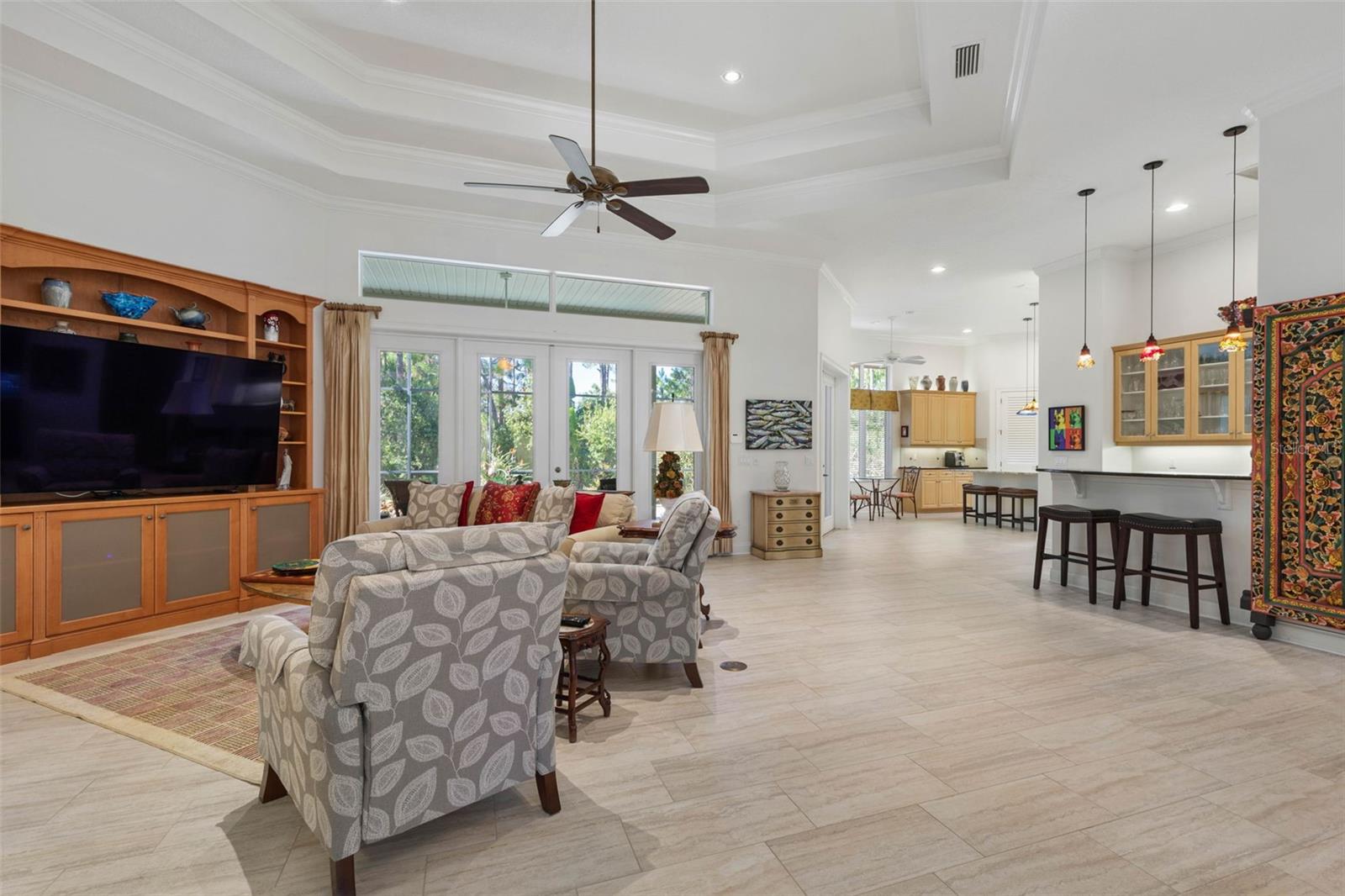 Built-in Features, Dry Bar, Eat-in Kitchen, High Ceilings, Kitchen/Family Room Combo, Open Floorplan, Primary Bedroom Main Floor, Solid Surface Counters, Solid Wood Cabinets, Split Bedroom, Tray Ceiling(s), Walk-In Closet(s), Window Treatments