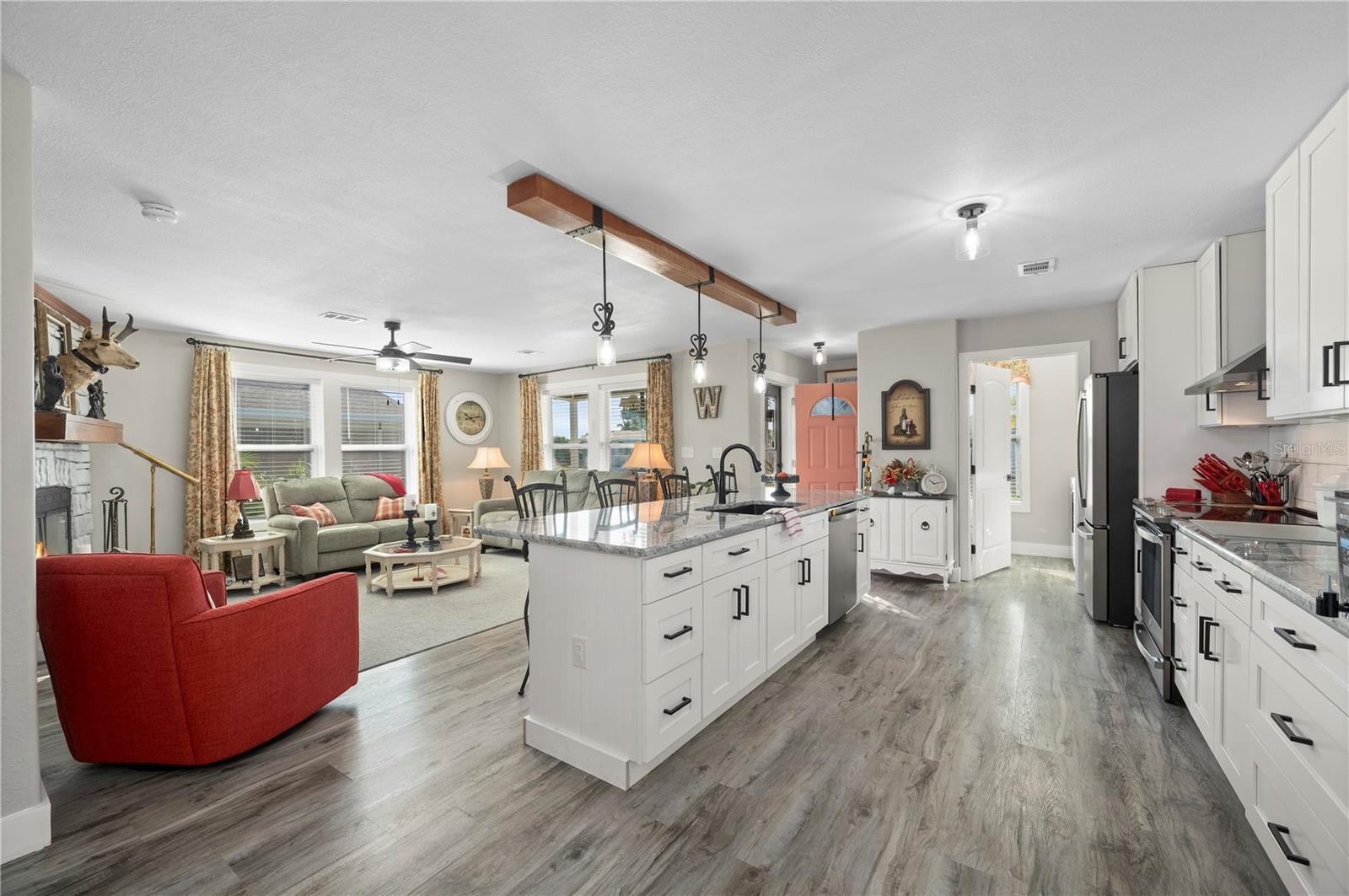 Welcome to this absolutely stunning 3-bedroom, 2-bath manufactured home located in a highly desirable 55+ community offering an active and friendly lifestyle. From the moment you pull up, the large brick-stamped covered driveway and charming front porch overlooking Village Drive set the tone for the quality and care found throughout this exceptional home. Step inside and prepare to be impressed — the custom-designed kitchen immediately delivers the wow factor with expansive granite countertops, high-end stainless steel appliances, soft-close cabinetry, and a beautiful custom wood beam with integrated lighting that adds warmth and character to the space. The open living and dining areas are bright and welcoming, featuring luxury vinyl flooring, tall baseboards, and a stunning wood-burning fireplace that serves as the perfect focal point for cozy gatherings. Every room showcases drywall finishes, new ceiling fans and lighting fixtures, and solid 2-panel wood interior doors, adding a sense of quality and craftsmanship rarely found in manufactured homes. All three bedrooms are generously sized, with the primary suite boasting a very large walk-in closet and a fully remodeled en-suite bath. Both bathrooms have been tastefully updated with floor-to-ceiling tiled showers, granite vanities, and premium fixtures. Step out to the spacious screened lanai, an entertainer’s dream featuring epoxy non-slip flooring, mounted TV, privacy screening with drapes, and a wide screen door designed to easily accommodate a golf cart. The custom-built 12x17 workshop is equipped with electric, ample storage, and workbenches—perfect for hobbies, woodworking, or crafting. This home also offers peace of mind with numerous recent upgrades: new HVAC system (2023), new roof (2023), new shed and carport with concrete extensions and isolated footings (2023), all-new vinyl siding, and double-pane windows with hurricane shutters for energy efficiency and storm protection. With its combination of thoughtful design, luxury finishes, and extensive updates, this home truly stands out as one of the finest in the community. Move-in ready, beautifully maintained, and a must-see!