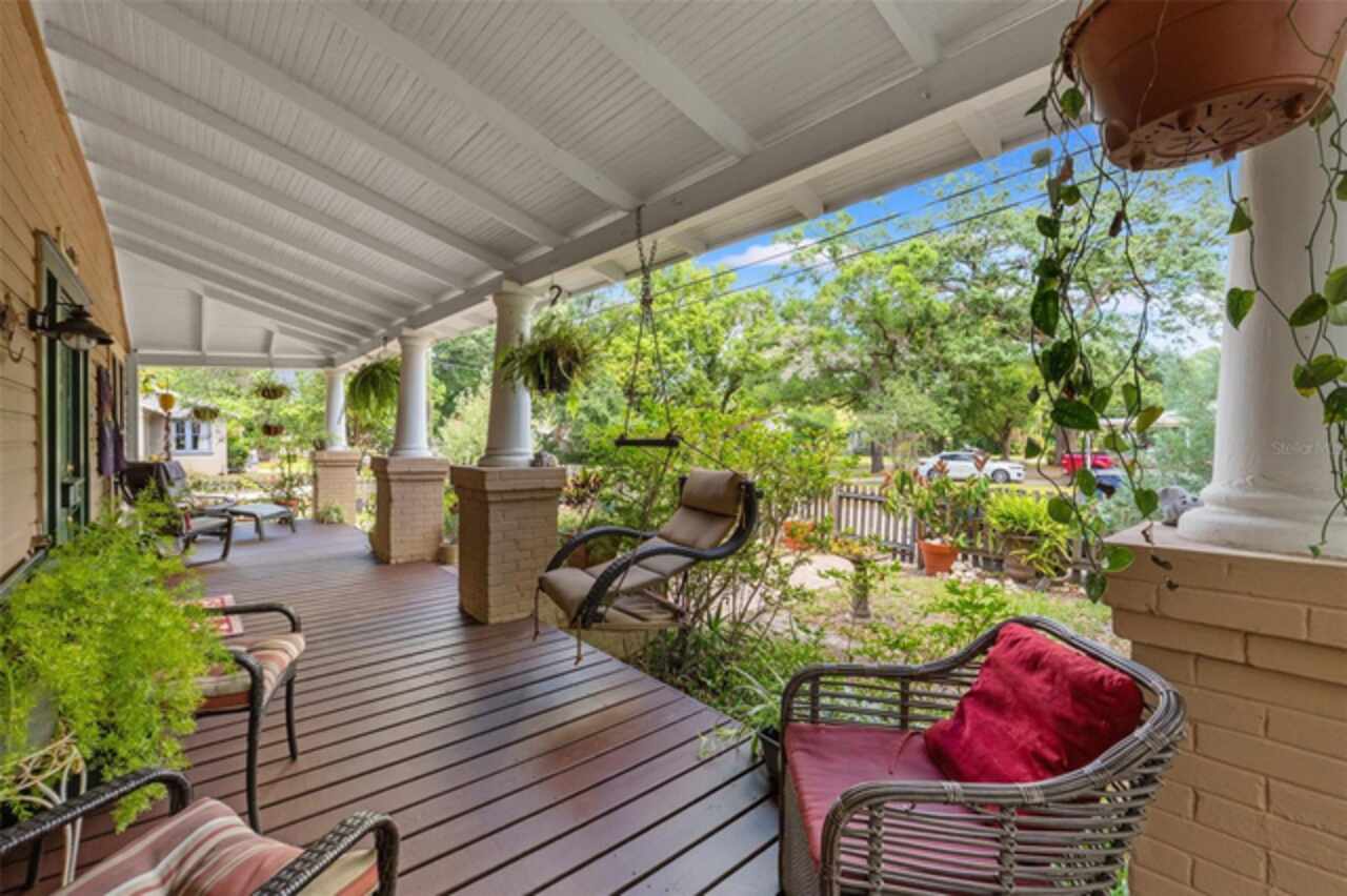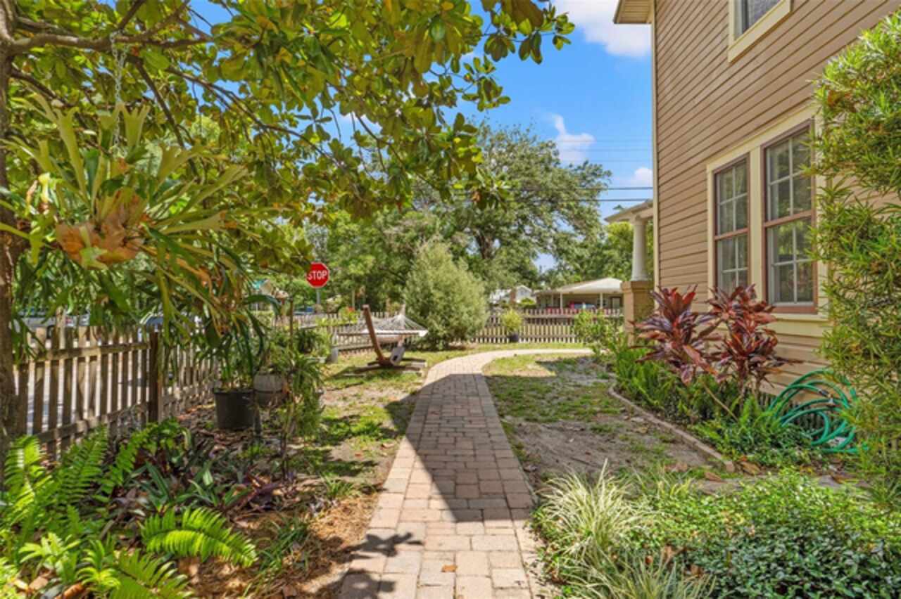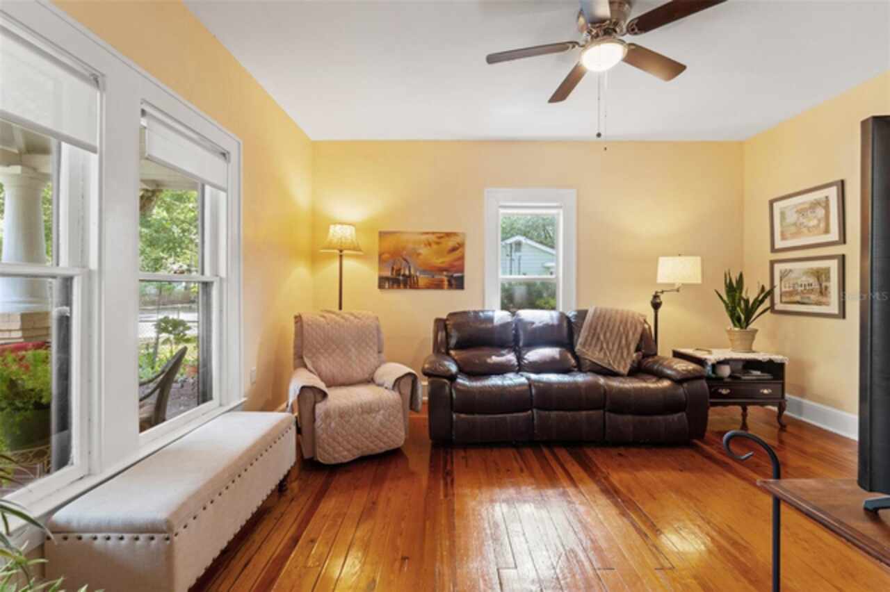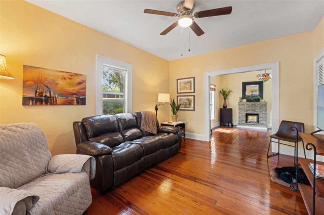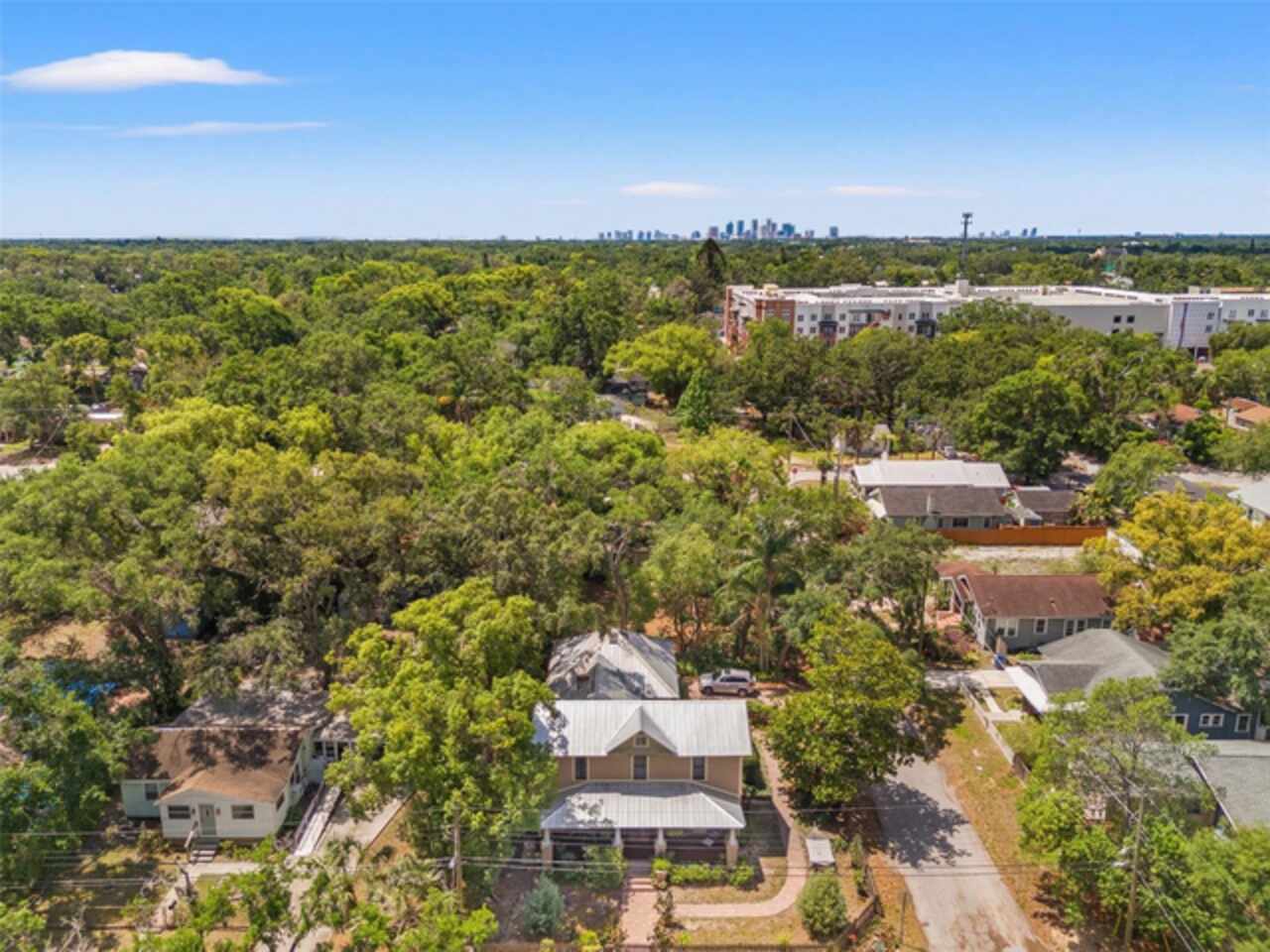 Don’t miss this incredible opportunity to own a charming 1920s bungalow with an income-producing in-law suite! This rare two-story, corner lot home is located in desirable Northeast Seminole Heights—just minutes from downtown Tampa, major highways, and popular dining and coffee spots. The main residence features 3 spacious bedrooms, 2 full bathrooms, beautiful original hardwood floors, and abundant natural light streaming through vintage windows. The kitchen offers custom cabinetry, warm wood accents, and tile countertop that is charming and functional. The attached in-law suite has its own private entrance and boasts vaulted ceilings, skylights, large windows, a kitchenette, and an oversized, handicap accessible shower—perfect for guests, rental income, multi-generational living or a private workspace. This space can also be used as an oversized, private primary bedroom with a private entrance. It also has plenty of room to be used as a studio, work or play space. This would then create a split floor plan, boasting a 4 bedroom/3-bathroom main home. Enjoy outdoor living on the welcoming covered front porch, ideal for morning coffee or evening relaxation. The fully fenced courtyard garden features mature landscaping, paved seating, and a BBQ area. Inside, additional highlights include a sunlit dining room with soaring ceilings and walls of windows, a cozy wood-burning fireplace, and generous storage throughout. Situated 30 feet above sea level—no flood insurance required—this home also offers a durable metal roof (2016) with decades of life ahead. Nestled in a vibrant neighborhood near the Hillsborough River, this lovingly maintained property offers timeless charm, modern versatility, and unbeatable location.