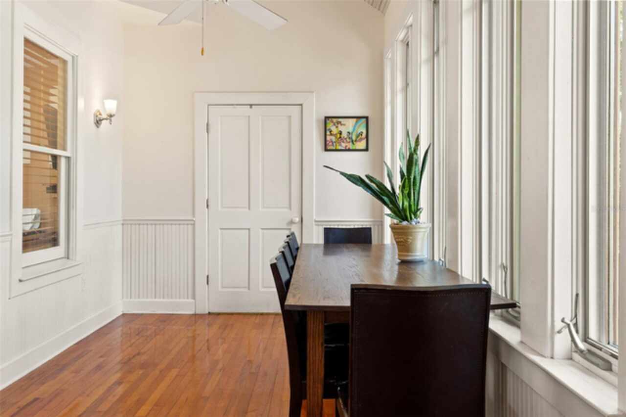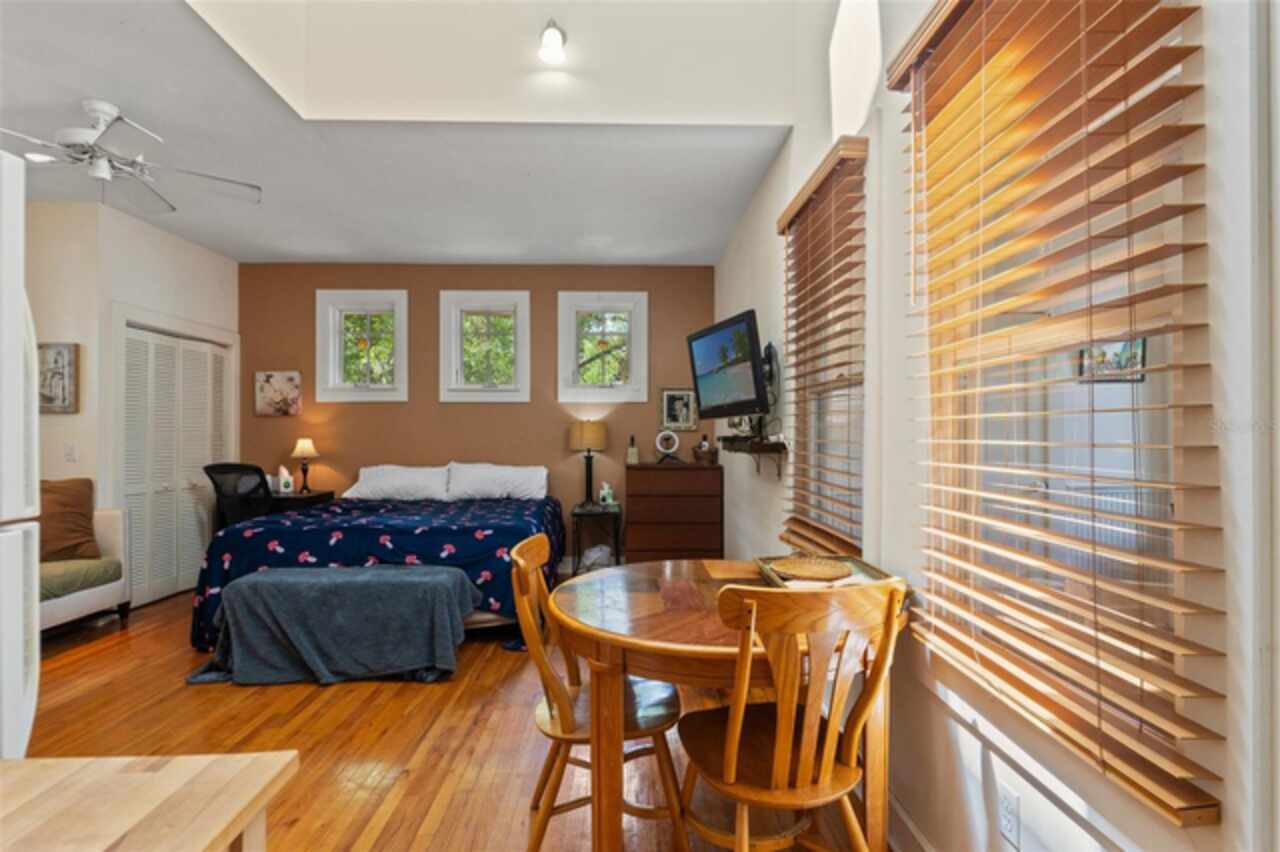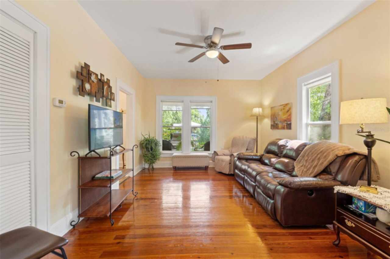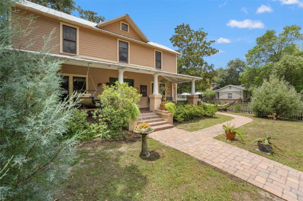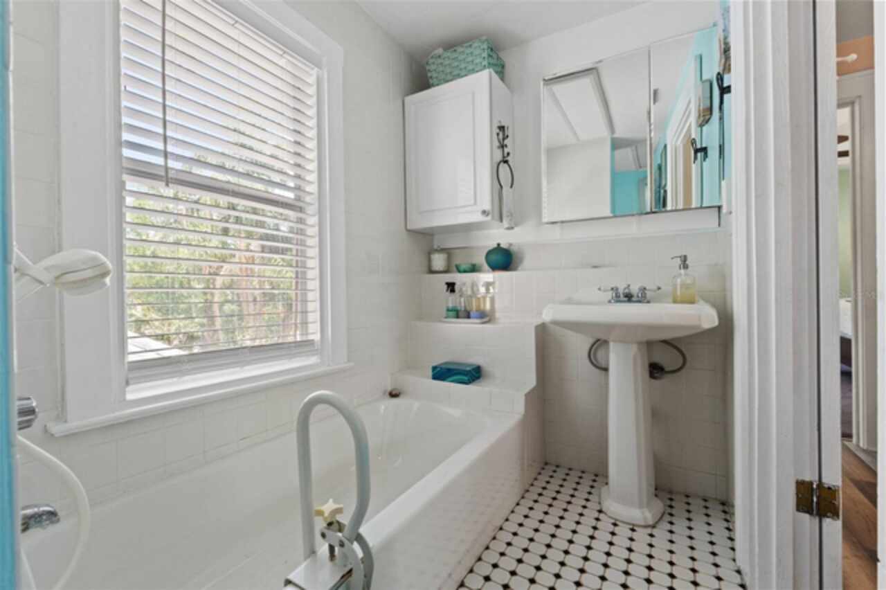 Don’t miss this incredible opportunity to own a charming 1920s bungalow with an income-producing in-law suite! This rare two-story, corner lot home is located in desirable Northeast Seminole Heights—just minutes from downtown Tampa, major highways, and popular dining and coffee spots. The main residence features 3 spacious bedrooms, 2 full bathrooms, beautiful original hardwood floors, and abundant natural light streaming through vintage windows. The kitchen offers custom cabinetry, warm wood accents, and tile countertop that is charming and functional. The attached in-law suite has its own private entrance and boasts vaulted ceilings, skylights, large windows, a kitchenette, and an oversized, handicap accessible shower—perfect for guests, rental income, multi-generational living or a private workspace. This space can also be used as an oversized, private primary bedroom with a private entrance. It also has plenty of room to be used as a studio, work or play space. This would then create a split floor plan, boasting a 4 bedroom/3-bathroom main home. Enjoy outdoor living on the welcoming covered front porch, ideal for morning coffee or evening relaxation. The fully fenced courtyard garden features mature landscaping, paved seating, and a BBQ area. Inside, additional highlights include a sunlit dining room with soaring ceilings and walls of windows, a cozy wood-burning fireplace, and generous storage throughout. Situated 30 feet above sea level—no flood insurance required—this home also offers a durable metal roof (2016) with decades of life ahead. Nestled in a vibrant neighborhood near the Hillsborough River, this lovingly maintained property offers timeless charm, modern versatility, and unbeatable location.