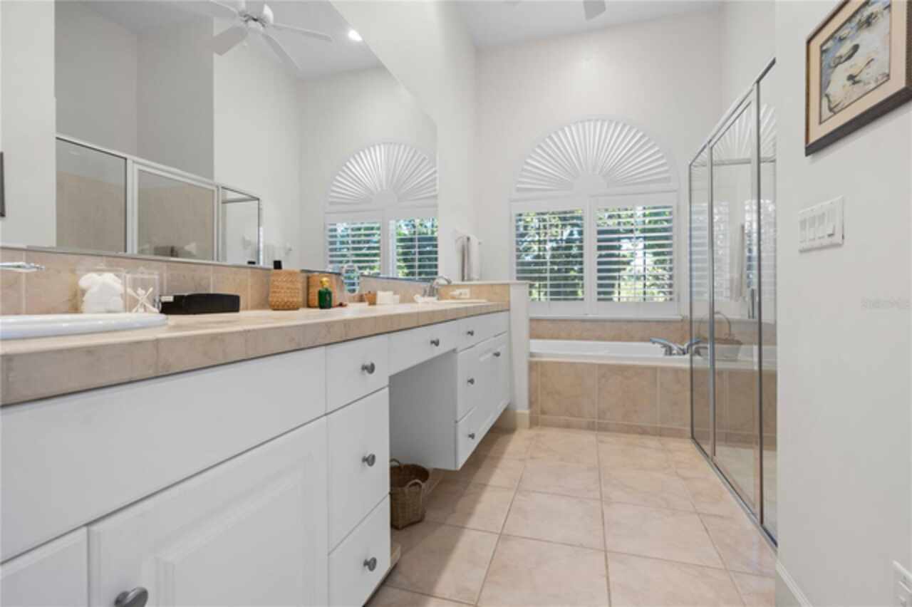 Built-in Features, Ceiling Fans(s), Crown Molding, Eat-in Kitchen, High Ceilings, Kitchen/Family Room Combo, Primary Bedroom Main Floor, Solid Surface Counters, Solid Wood Cabinets, Split Bedroom, Walk-In Closet(s), Wet Bar, Window Treatments