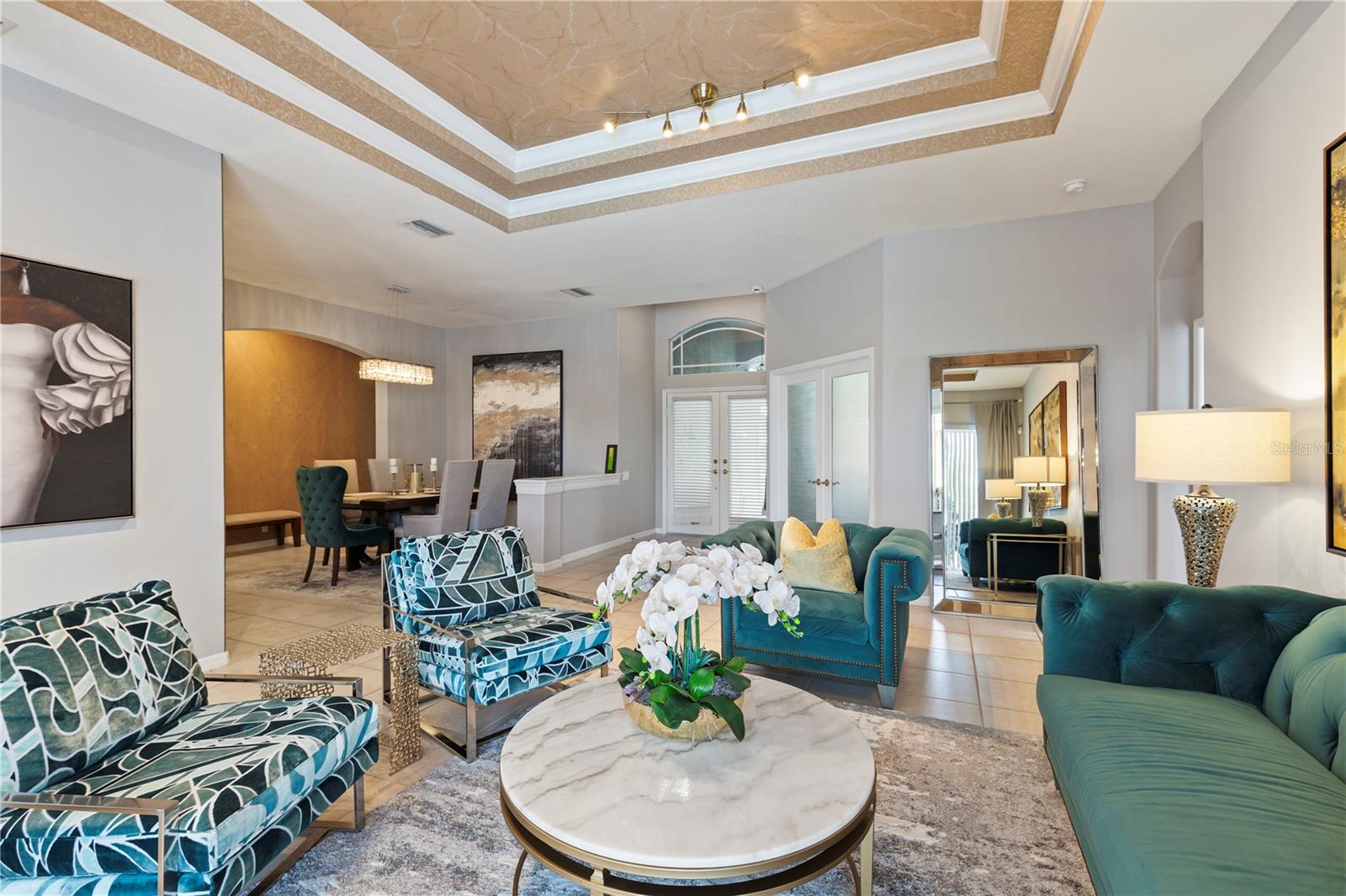 Ceiling Fans(s), Coffered Ceiling(s), Crown Molding, High Ceilings, Kitchen/Family Room Combo, Split Bedroom, Tray Ceiling(s), Walk-In Closet(s), Window Treatments