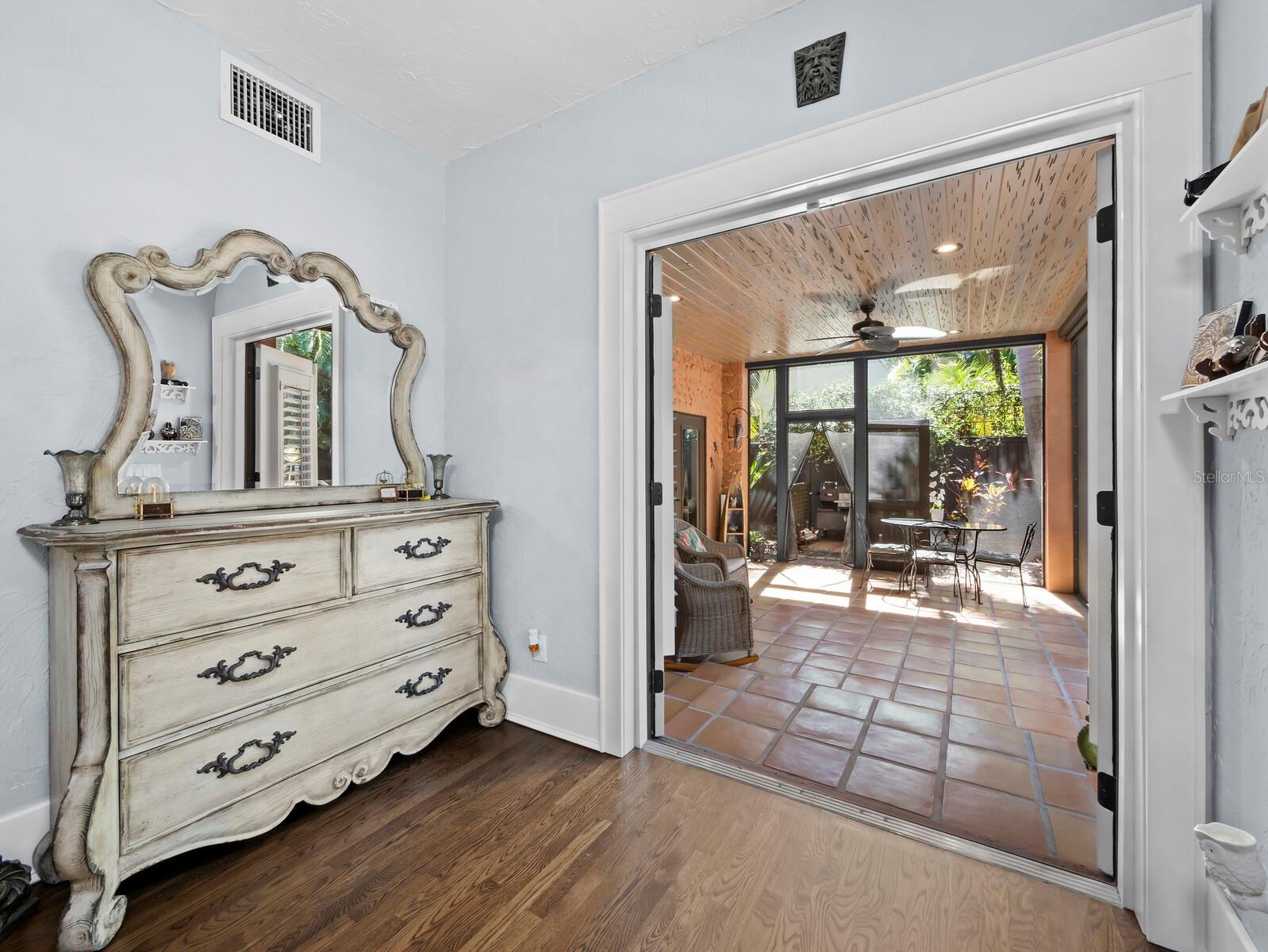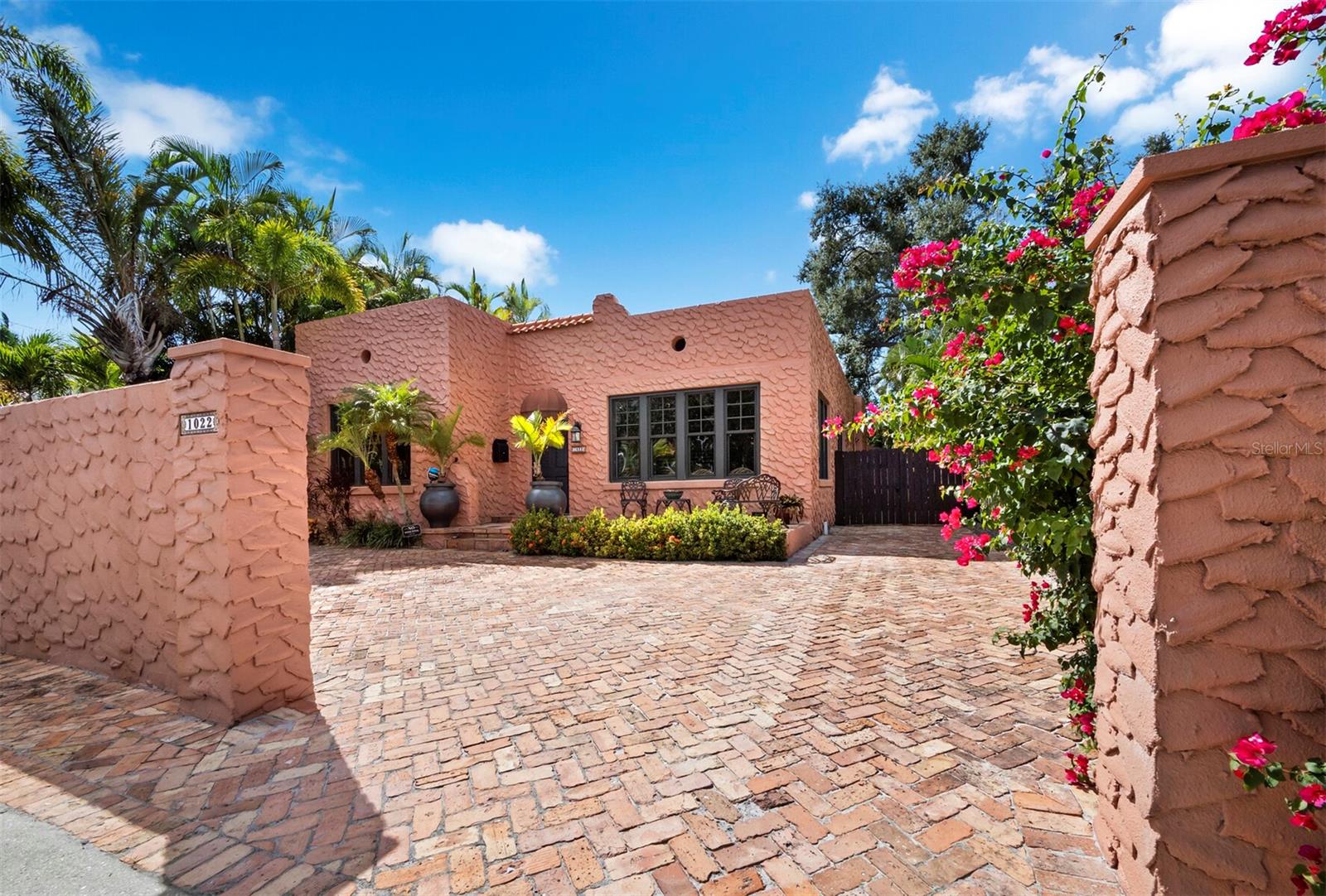 Situated in the highly desirable West of Trail neighborhood of Hudson Bayou, this fully restored 1922 residence is the perfect blend of historic charm and modern conveniences. The property offers 2, 284 square feet with two bedrooms and two bathrooms in the main house, plus a one-bedroom, one-bathroom guest house. Renovations include a 2006 conversion of the garage into a guest house with a stucco privacy wall and Chicago brick driveway. In 2018, a spacious primary suite with double closets, a large bath, and French doors to a screened lanai was added. High ceilings, oversized impact windows, and refinished hardwood floors (2024) add to the home’s appeal. Recent updates include a recoated roof with a 10-year transferable warranty (2025), A/C (2023), water heater (2024), encapsulated crawlspace with dehumidifier (2024), foundation reinforcement with new support jacks (2024/2025), and hurricane-rated windows. The kitchen and dining area were fully renovated, featuring custom Calistoga cabinetry and designer appliances (2024/2025). Additional features include recessed lighting, custom closets, a Murphy bed, and a natural gas fireplace. A wellness room with an infrared sauna (2025) completes the interior. Exterior highlights include enhanced landscaping, three all-weather sheds, a pergola with natural gas grill hookups, and a serene brick courtyard surrounded by mature landscaping for privacy. The location is unparalleled, with proximity to Southside Village, the downtown Sarasota bayfront, St. Armands Circle, and the world-famous beaches of Lido and Siesta Key.
