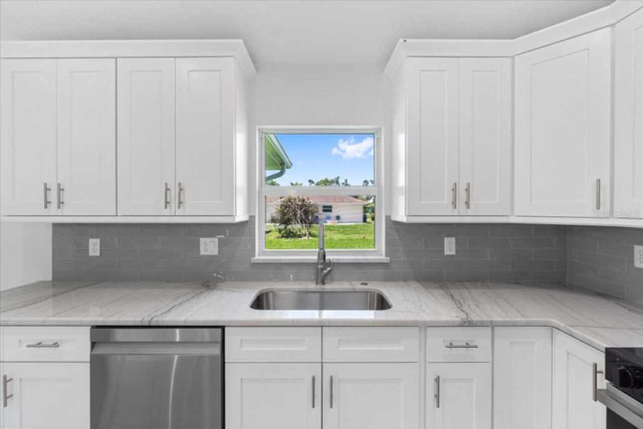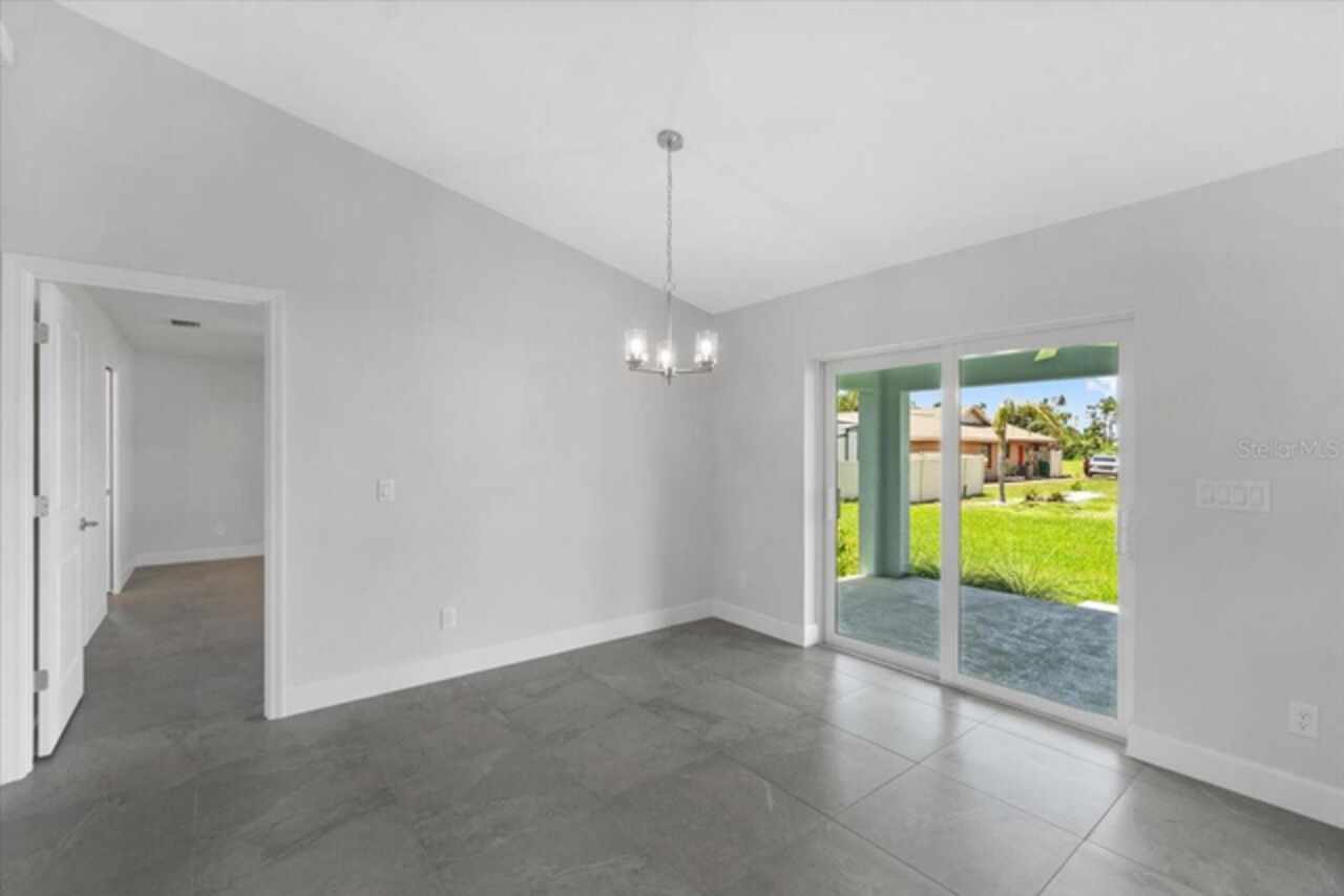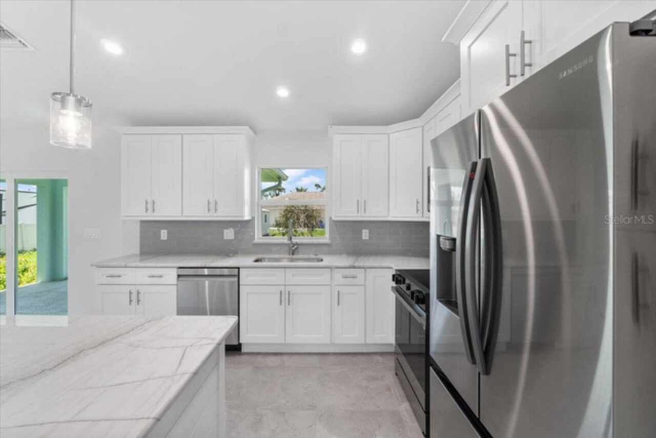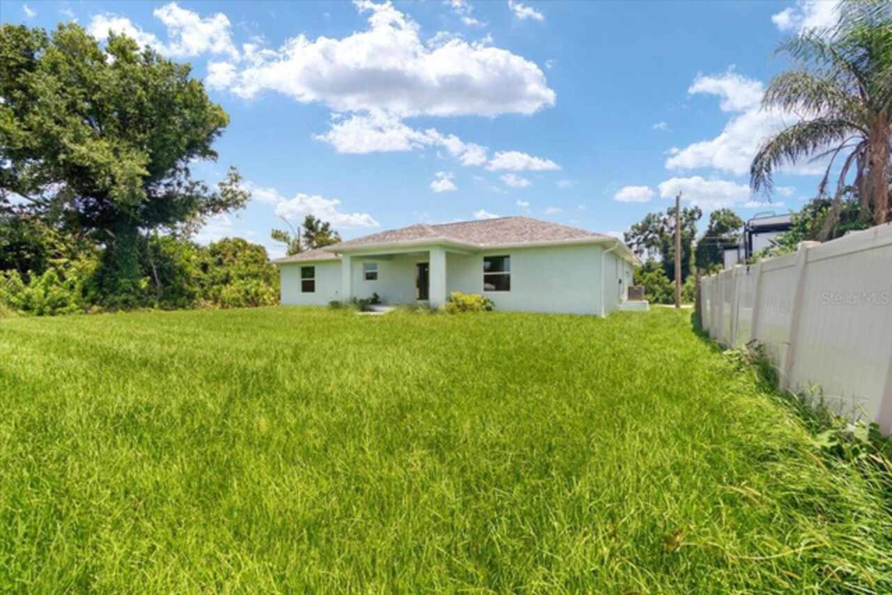 Discover the Move-in Ready Hanover B Model, a beautifully designed new home featuring upgraded impact windows, sliders, and doors. This 3-bedroom, 2-bathroom home includes a 2-car garage with an epoxy floor and a split floor plan. Built with concrete block construction and a hip roof, it boasts designer shingles and seamless gutters. Enjoy the spacious covered front entry and 160 sq. ft. back patio. Inside, vaulted ceilings and porcelain tile flooring create an open living space, while the kitchen impresses with stone countertops, a 6-ft island, stainless steel appliances, and all-wood cabinets with soft-close features. The master suite offers dual sinks, a large shower, and a walk-in closet, with a second bathroom featuring a shower and tub combo. The beautifully landscaped yard comes with an irrigation system. Conveniently located minutes from beaches, shopping, and restaurants in East Englewood. Don't miss this opportunity!