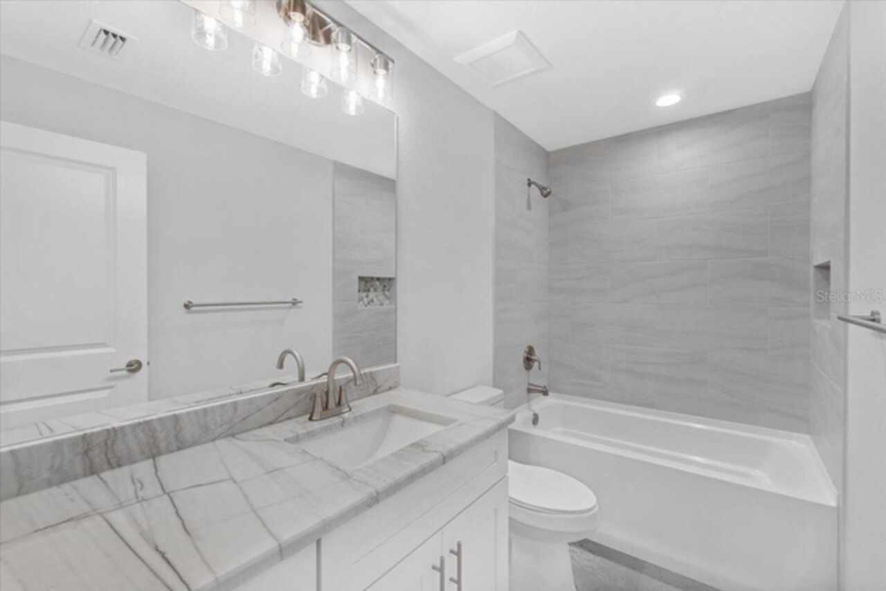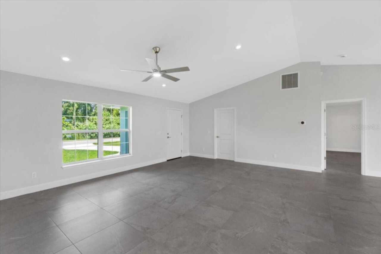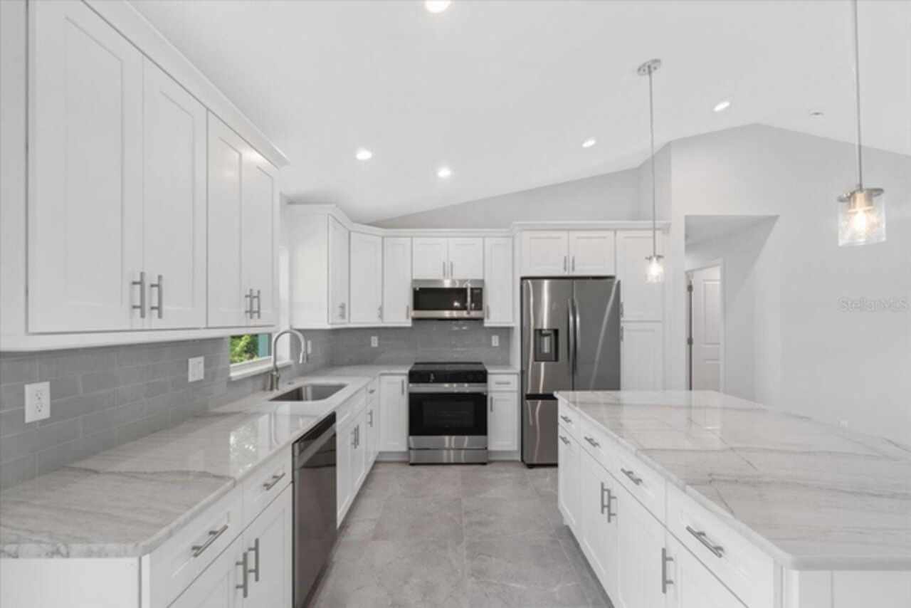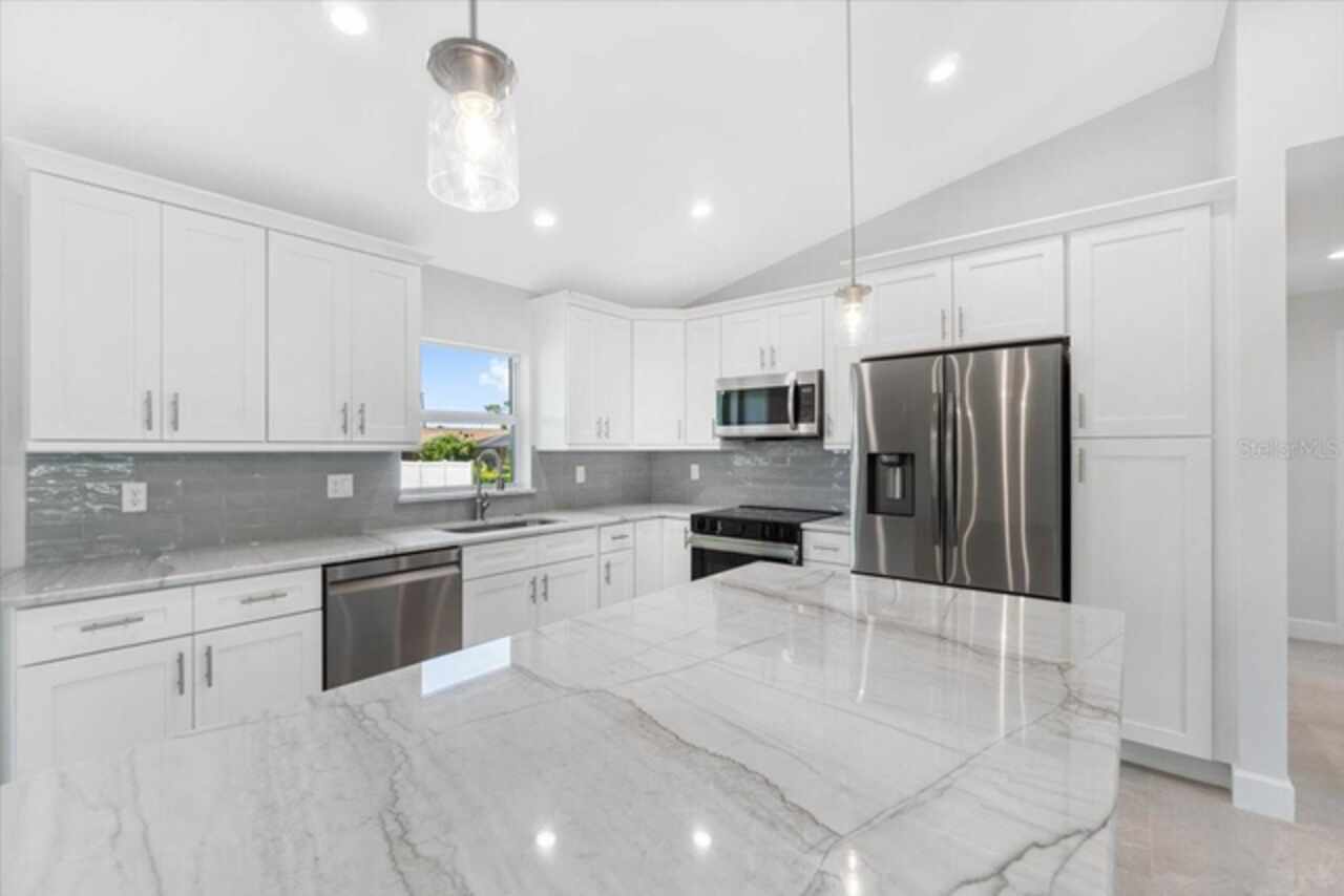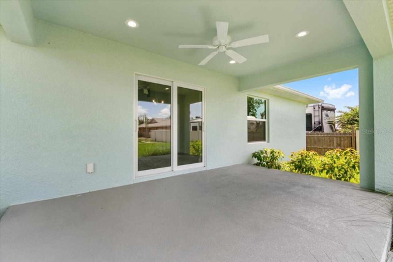 Discover the Move-in Ready Hanover B Model, a beautifully designed new home featuring upgraded impact windows, sliders, and doors. This 3-bedroom, 2-bathroom home includes a 2-car garage with an epoxy floor and a split floor plan. Built with concrete block construction and a hip roof, it boasts designer shingles and seamless gutters. Enjoy the spacious covered front entry and 160 sq. ft. back patio. Inside, vaulted ceilings and porcelain tile flooring create an open living space, while the kitchen impresses with stone countertops, a 6-ft island, stainless steel appliances, and all-wood cabinets with soft-close features. The master suite offers dual sinks, a large shower, and a walk-in closet, with a second bathroom featuring a shower and tub combo. The beautifully landscaped yard comes with an irrigation system. Conveniently located minutes from beaches, shopping, and restaurants in East Englewood. Don't miss this opportunity!