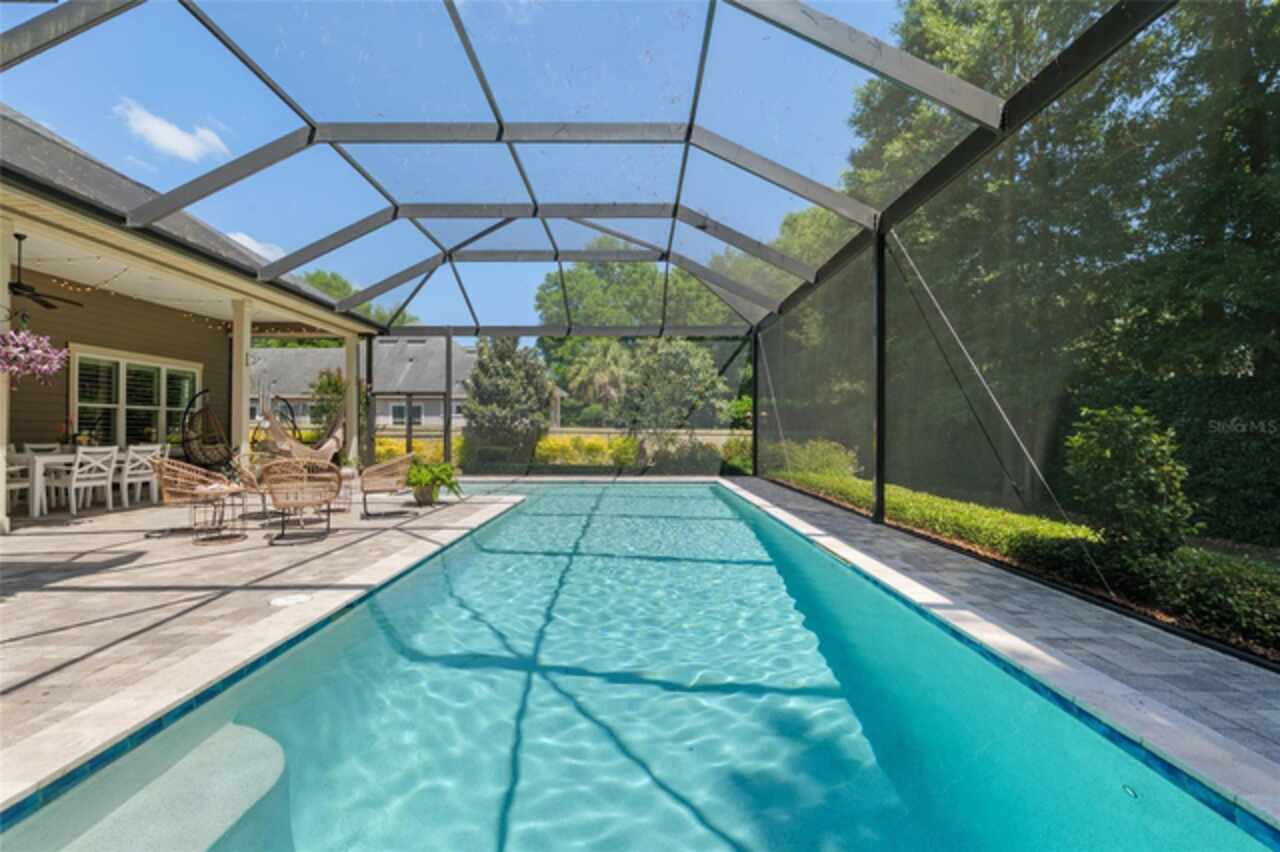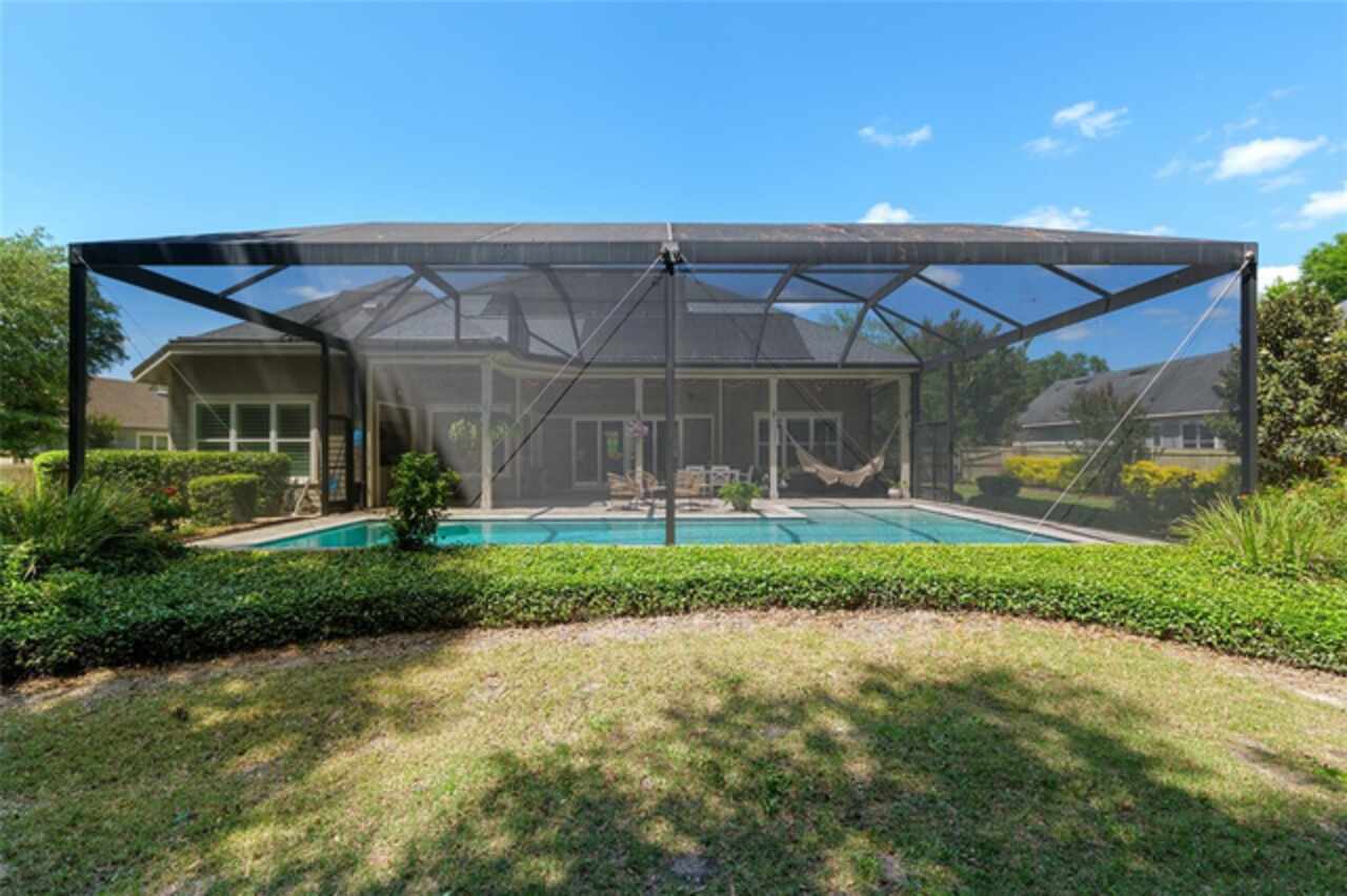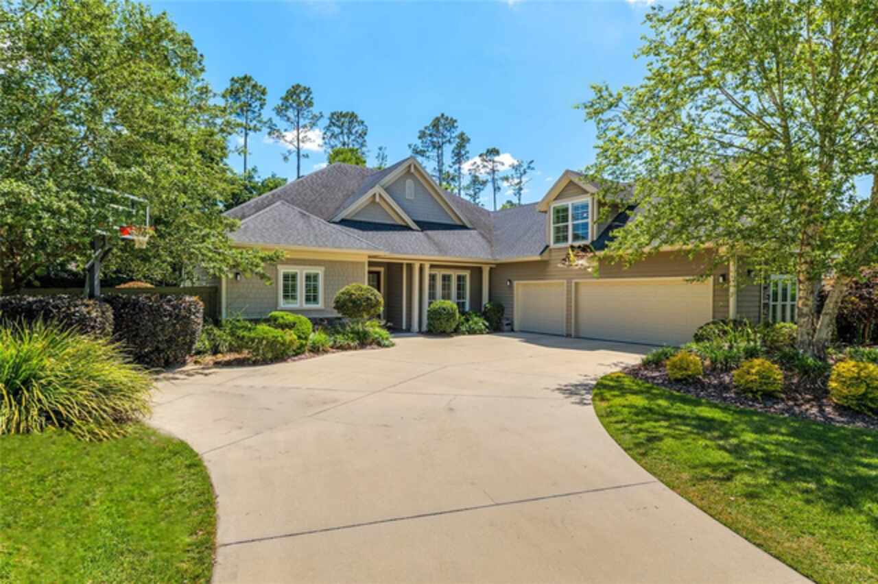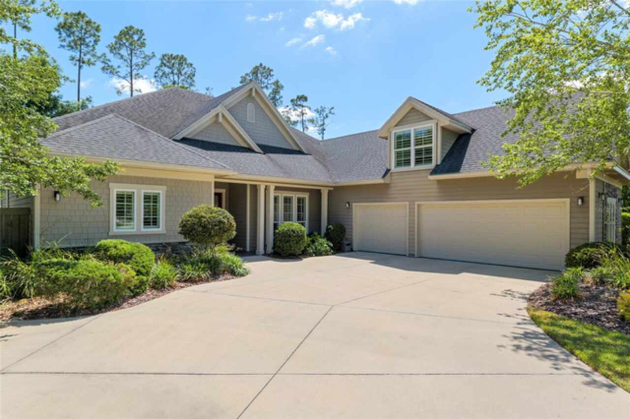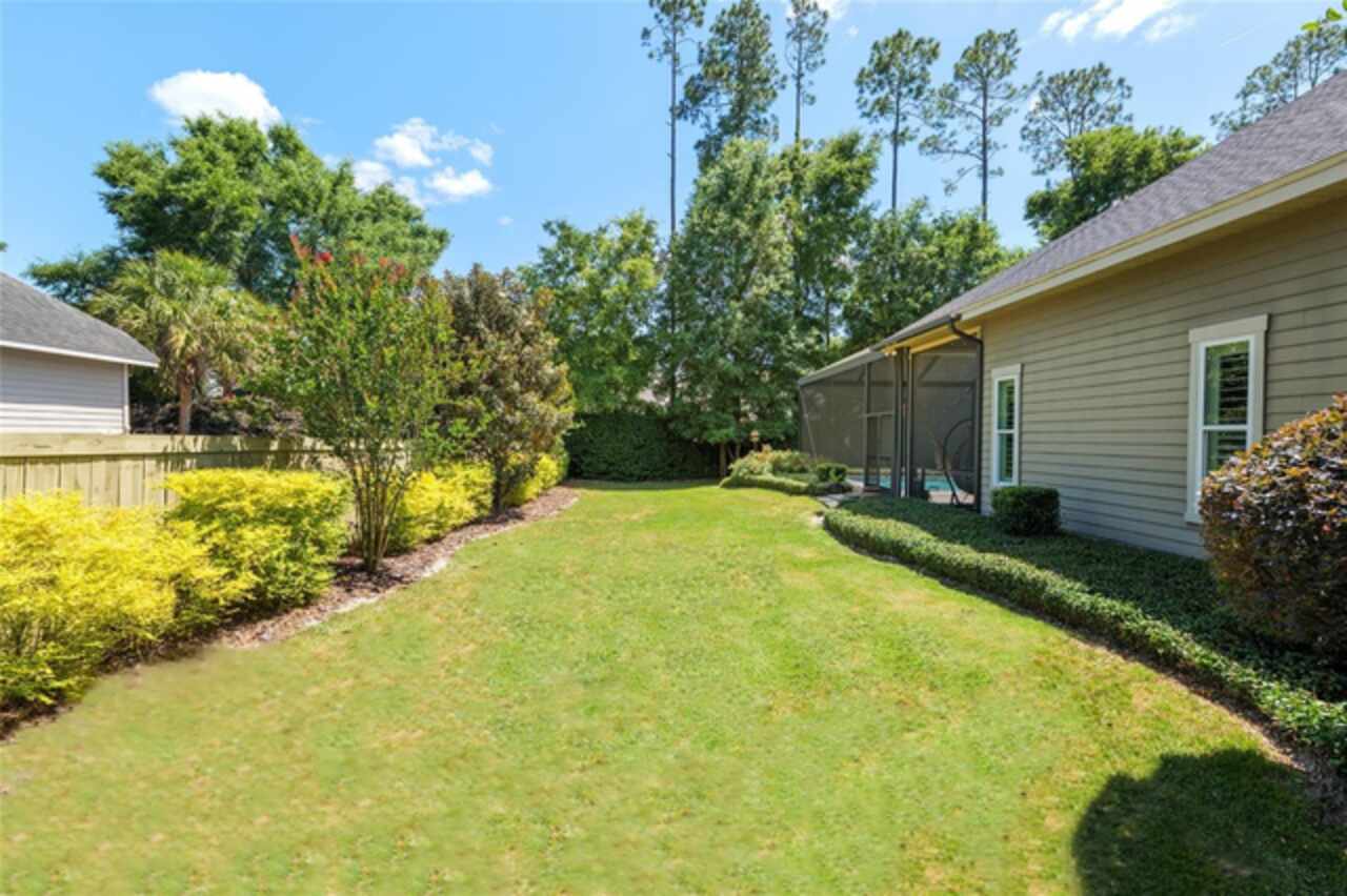 Under contract-accepting backup offers. Exceptionally built, an exceptional location and an exceptional floor plan! This Mark Warring built home in the Estates of Wilds Plantation is situated on a rarely available south-facing lot, which maximizes sunlight exposure. This popular floor plan features 4 bedrooms plus bonus room/5th bedroom home and 4 baths. Rich engineered hardwood flooring connects all of the downstairs living spaces. The separate dining room, great room, kitchen and nook have an easy flow, perfect for daily living or for casual entertaining. The wood beam vaulted ceiling gives the family room its spacious feel. The focal point is the wood ship lap wall with its modern aesthetic for your TV and gas fireplace. Floating shelves are to the right, and the entire wall has an elevated tiled hearth. Open the telescoping sliding glass doors to access your paver lanai, pool and summer kitchen area. The stunning kitchen has hand-crafted wood cabinetry and neutral granite counters. On each side of the exhaust hood are display cabinetry with glass inserts. Add’l features include a convection wall oven and separate microwave, a gas cooktop, double door pantry, a custom backsplash and a functional one-level center island countertop. The nook has a single French door for lanai and summer kitchen access. Via the nook are 2 guest rooms, each with double door closets, and a full guest bath. Off the opposite end of the kitchen is the en suite guest bedroom. This 4-way split plan offers the master suite and bath occupying the entire left wing of the home. Best features include south-facing windows of the lanai and pool and a step-up tray ceiling accented with natural wood beams. The hallway to the bath has his-and-her walk-in closets, each with organizational systems, and a hallway dressing mirror. The master bath features handcrafted floating cabinetry, neutral granite counters, a soaking tub with a custom tile wall and shelving flanking each side, and a separate water closet and step-in shower. The staircase for the bonus room/5th bedroom is located in the clutter hallway near the laundry room hallway. The upstairs landing as a direct attic access door and a storage closet. Spanning the width of the 3CG below with 528SF, the bonus room/5th bedroom features a double door entry, built-in shelving and a full guest bath. Downstairs the concrete paver lanai can be accessed via the nook or great room. The summer kitchen has a built-in grill with exhaust hood. The pool, its solar panels, and screen enclosure were added in 2017. The pool is perfect for swimming laps and for fun and play. The screen enclosure was specially engineered for “picture” screening for uninterrupted views of the rear yard on all 3 sides. Additional home features include 30-year architectural shingle roof, irrigation system, laundry room with sink and upper and lower cabinets for storage, Plantation shutters, Leviton WiFi enabled lighting system with dimming feature, alarm system, tankless gas WH, and a zoned high efficiency HVAC system. Walk, ride your bike or drive to the nearby local and private schools. Publix, several restaurants and local shops in the Haile Market Square, only 4 min away.