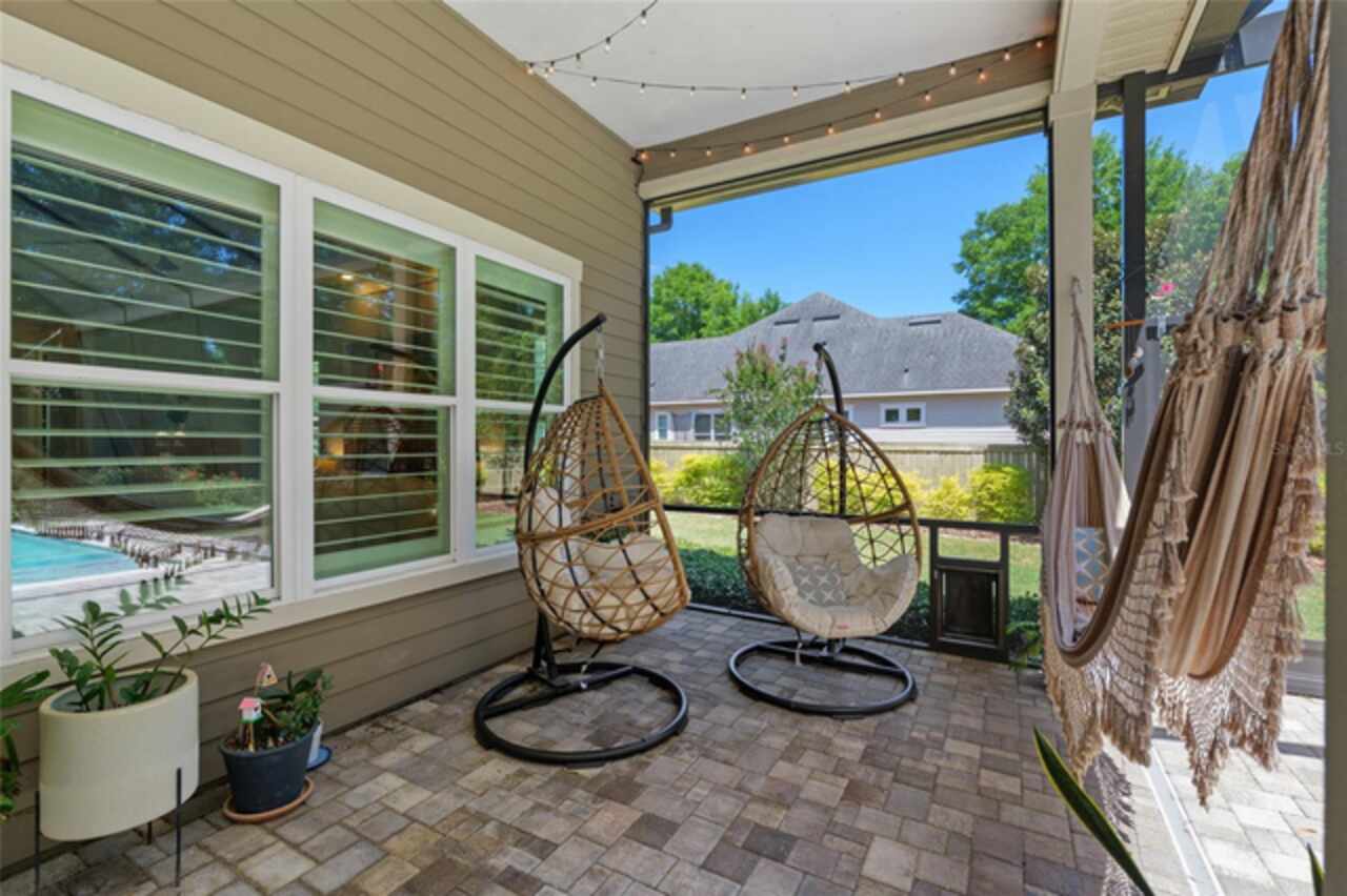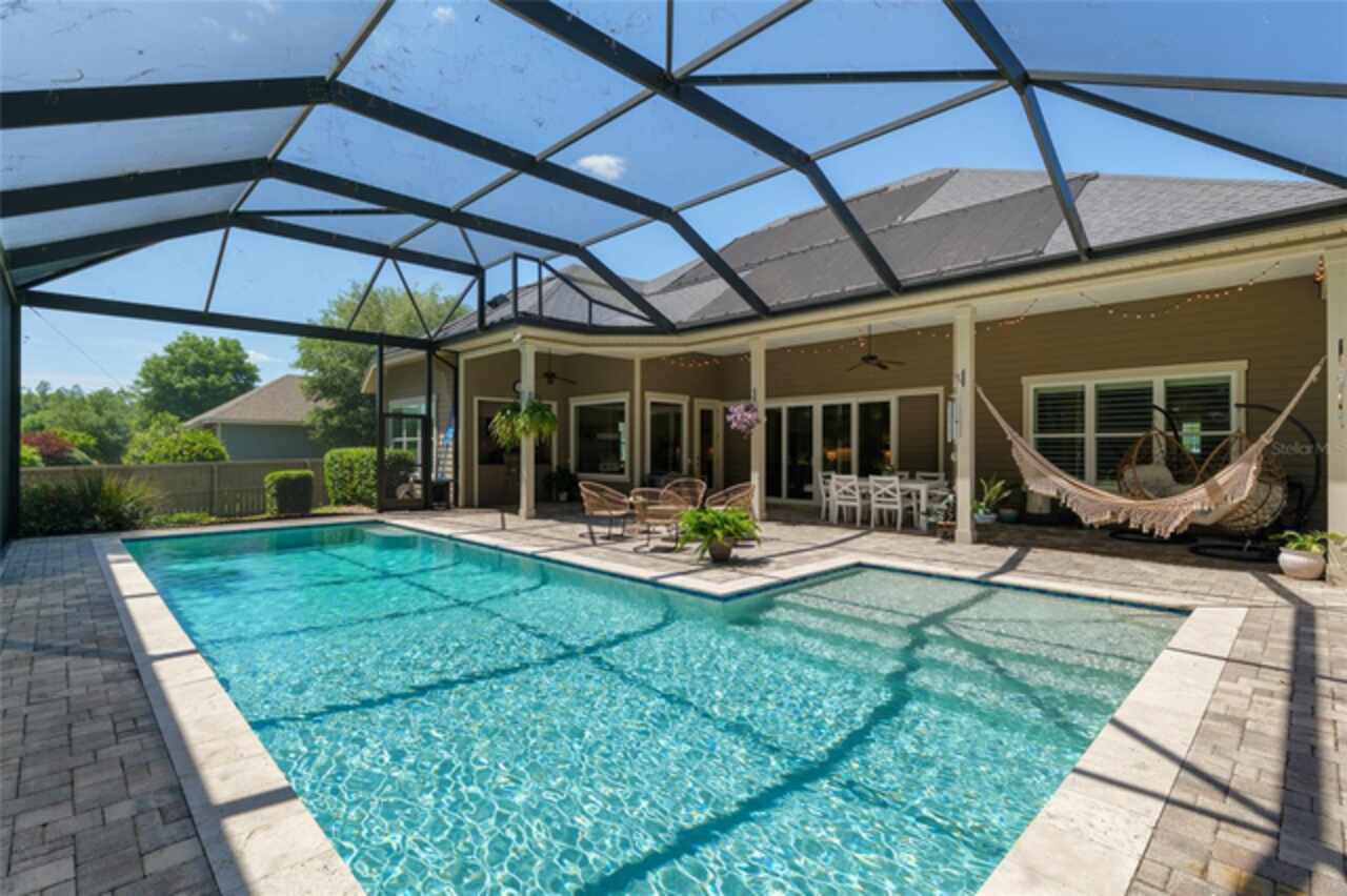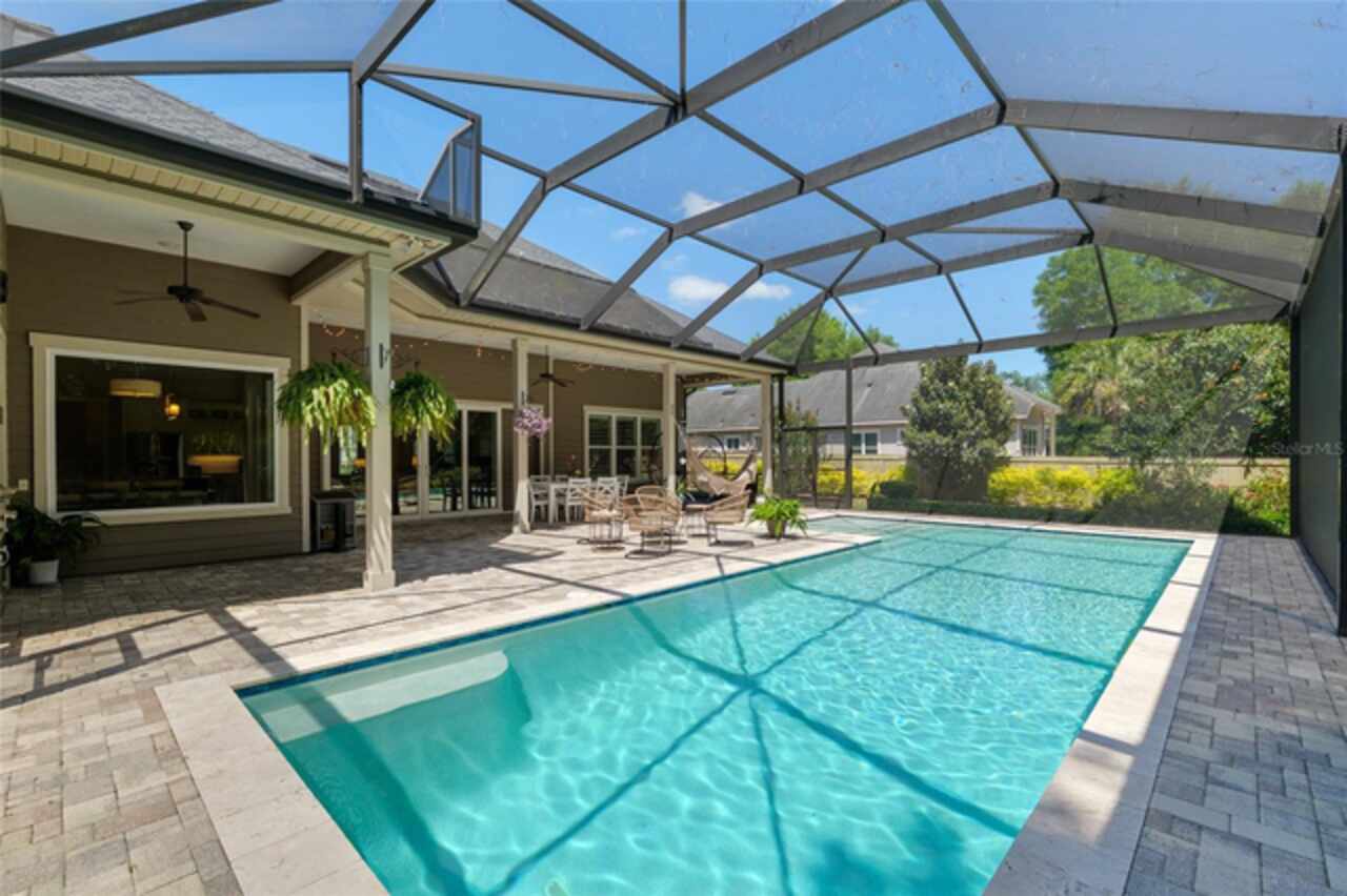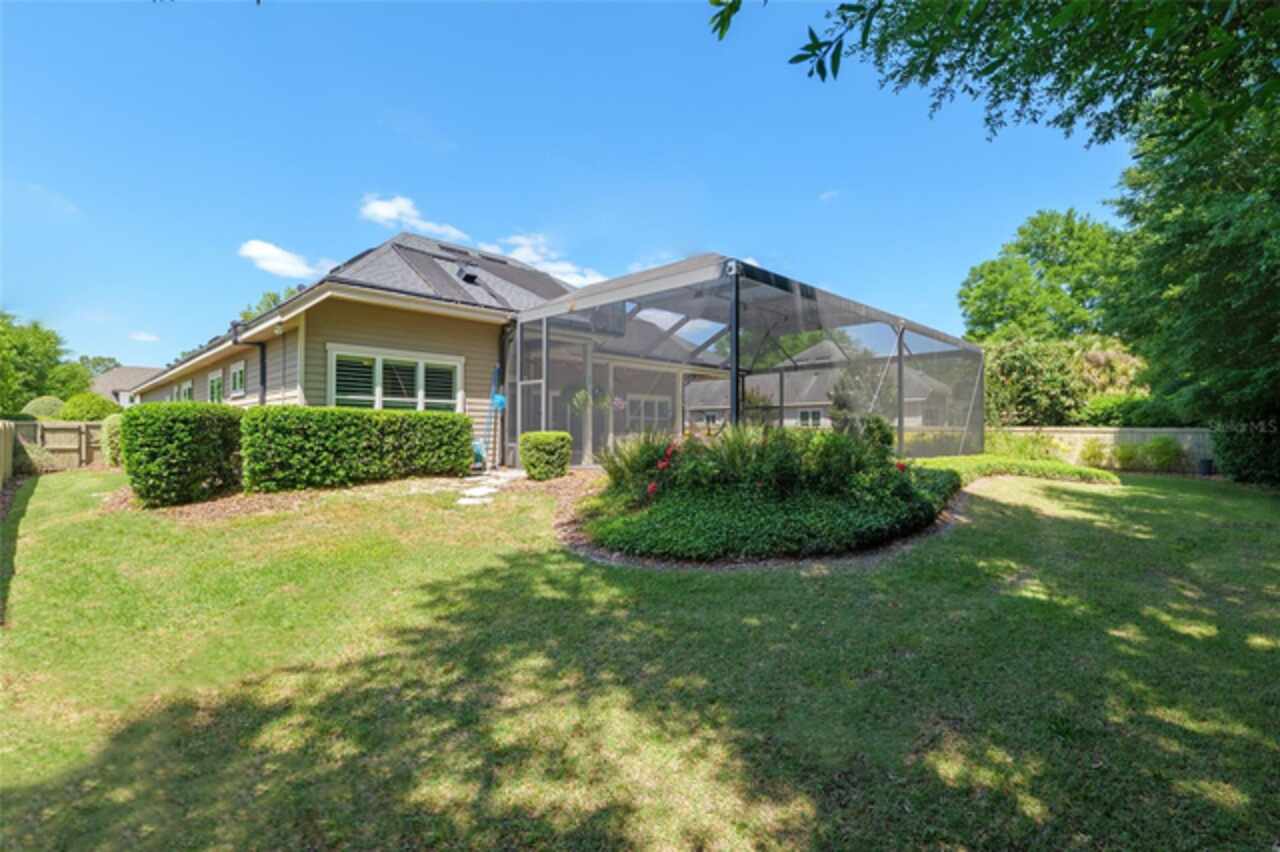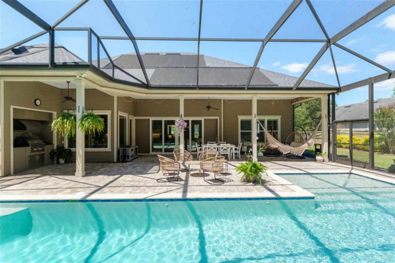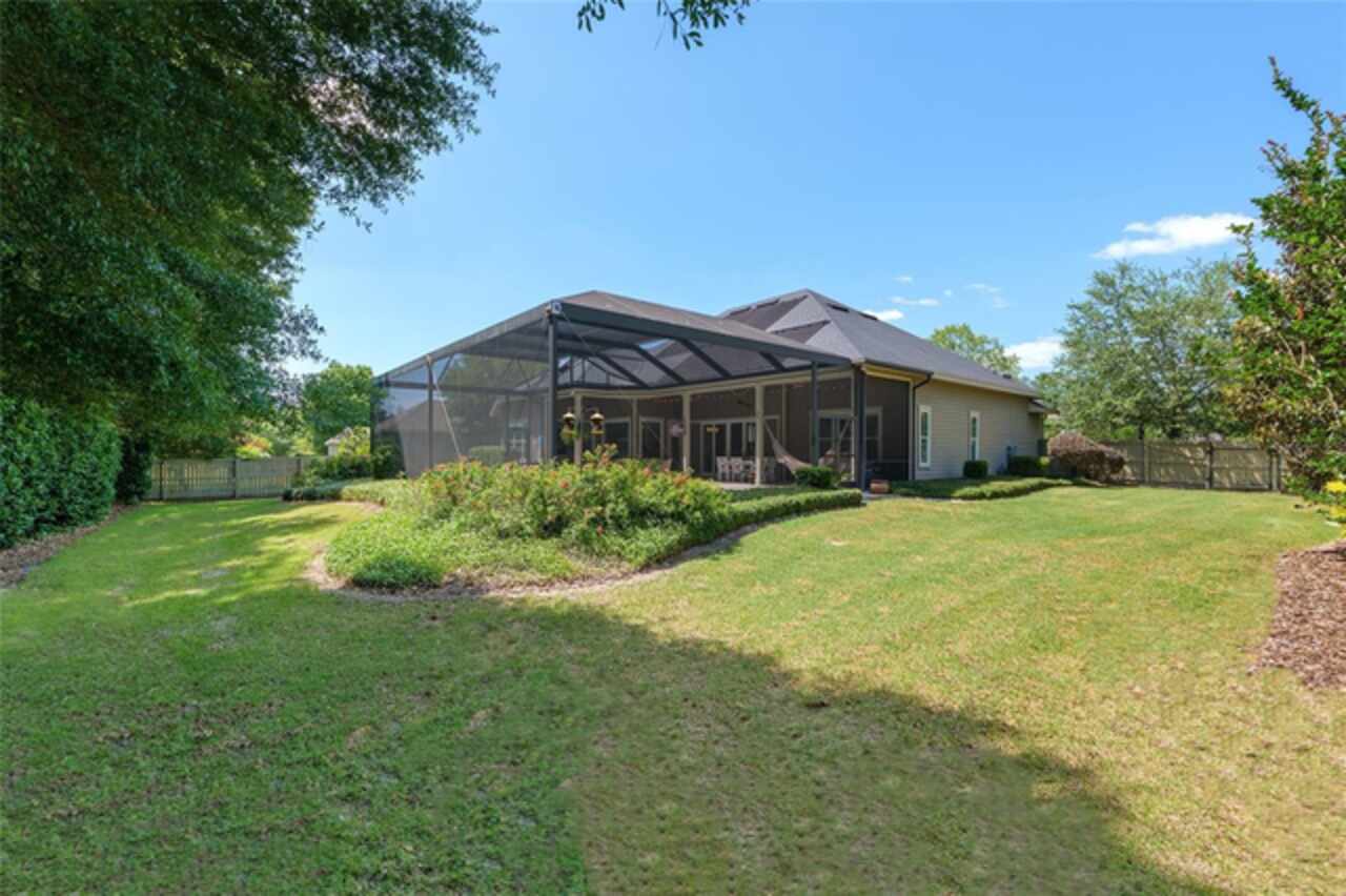 Under contract-accepting backup offers. Exceptionally built, an exceptional location and an exceptional floor plan! This Mark Warring built home in the Estates of Wilds Plantation is situated on a rarely available south-facing lot, which maximizes sunlight exposure. This popular floor plan features 4 bedrooms plus bonus room/5th bedroom home and 4 baths. Rich engineered hardwood flooring connects all of the downstairs living spaces. The separate dining room, great room, kitchen and nook have an easy flow, perfect for daily living or for casual entertaining. The wood beam vaulted ceiling gives the family room its spacious feel. The focal point is the wood ship lap wall with its modern aesthetic for your TV and gas fireplace. Floating shelves are to the right, and the entire wall has an elevated tiled hearth. Open the telescoping sliding glass doors to access your paver lanai, pool and summer kitchen area. The stunning kitchen has hand-crafted wood cabinetry and neutral granite counters. On each side of the exhaust hood are display cabinetry with glass inserts. Add’l features include a convection wall oven and separate microwave, a gas cooktop, double door pantry, a custom backsplash and a functional one-level center island countertop. The nook has a single French door for lanai and summer kitchen access. Via the nook are 2 guest rooms, each with double door closets, and a full guest bath. Off the opposite end of the kitchen is the en suite guest bedroom. This 4-way split plan offers the master suite and bath occupying the entire left wing of the home. Best features include south-facing windows of the lanai and pool and a step-up tray ceiling accented with natural wood beams. The hallway to the bath has his-and-her walk-in closets, each with organizational systems, and a hallway dressing mirror. The master bath features handcrafted floating cabinetry, neutral granite counters, a soaking tub with a custom tile wall and shelving flanking each side, and a separate water closet and step-in shower. The staircase for the bonus room/5th bedroom is located in the clutter hallway near the laundry room hallway. The upstairs landing as a direct attic access door and a storage closet. Spanning the width of the 3CG below with 528SF, the bonus room/5th bedroom features a double door entry, built-in shelving and a full guest bath. Downstairs the concrete paver lanai can be accessed via the nook or great room. The summer kitchen has a built-in grill with exhaust hood. The pool, its solar panels, and screen enclosure were added in 2017. The pool is perfect for swimming laps and for fun and play. The screen enclosure was specially engineered for “picture” screening for uninterrupted views of the rear yard on all 3 sides. Additional home features include 30-year architectural shingle roof, irrigation system, laundry room with sink and upper and lower cabinets for storage, Plantation shutters, Leviton WiFi enabled lighting system with dimming feature, alarm system, tankless gas WH, and a zoned high efficiency HVAC system. Walk, ride your bike or drive to the nearby local and private schools. Publix, several restaurants and local shops in the Haile Market Square, only 4 min away.