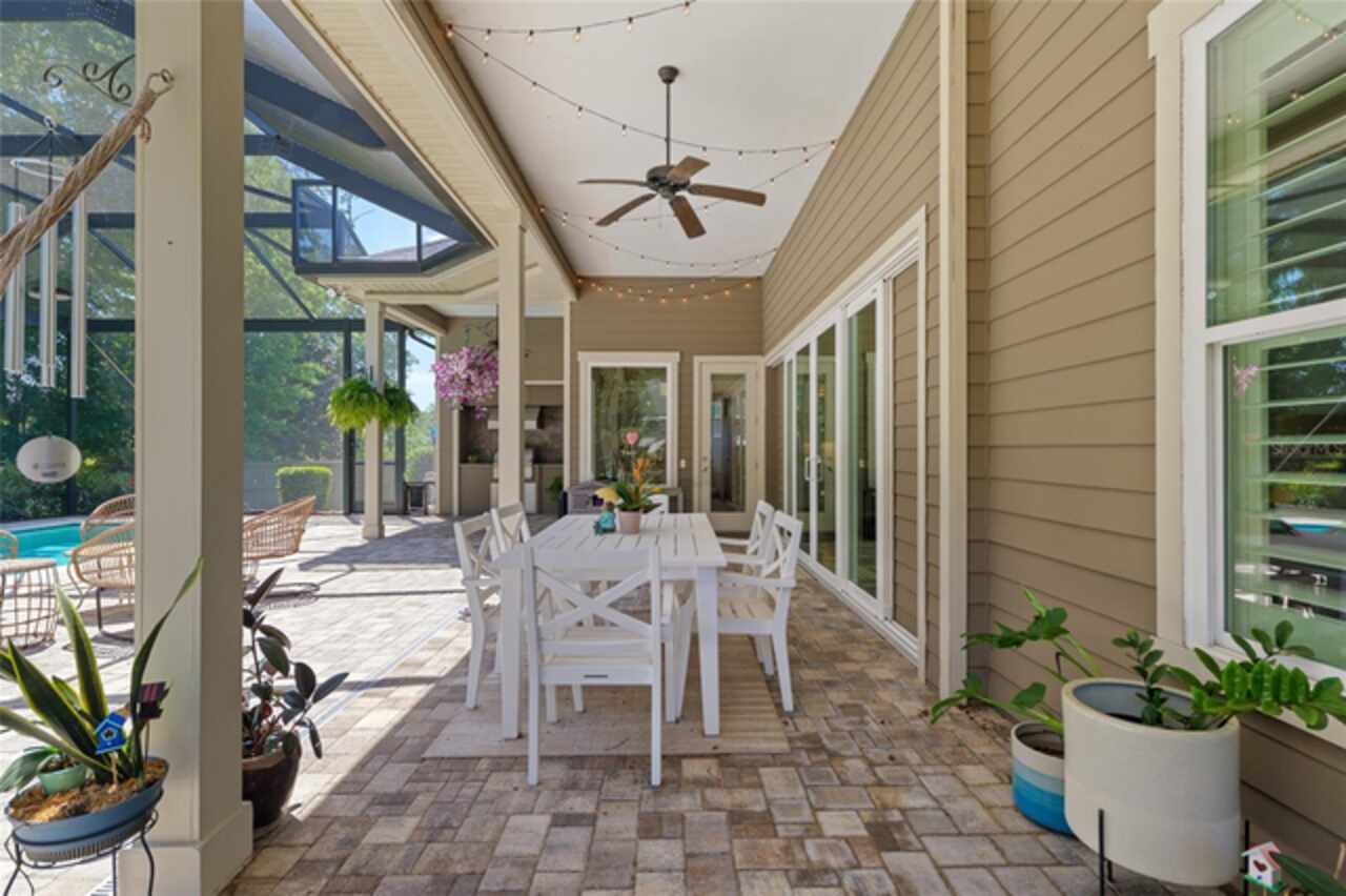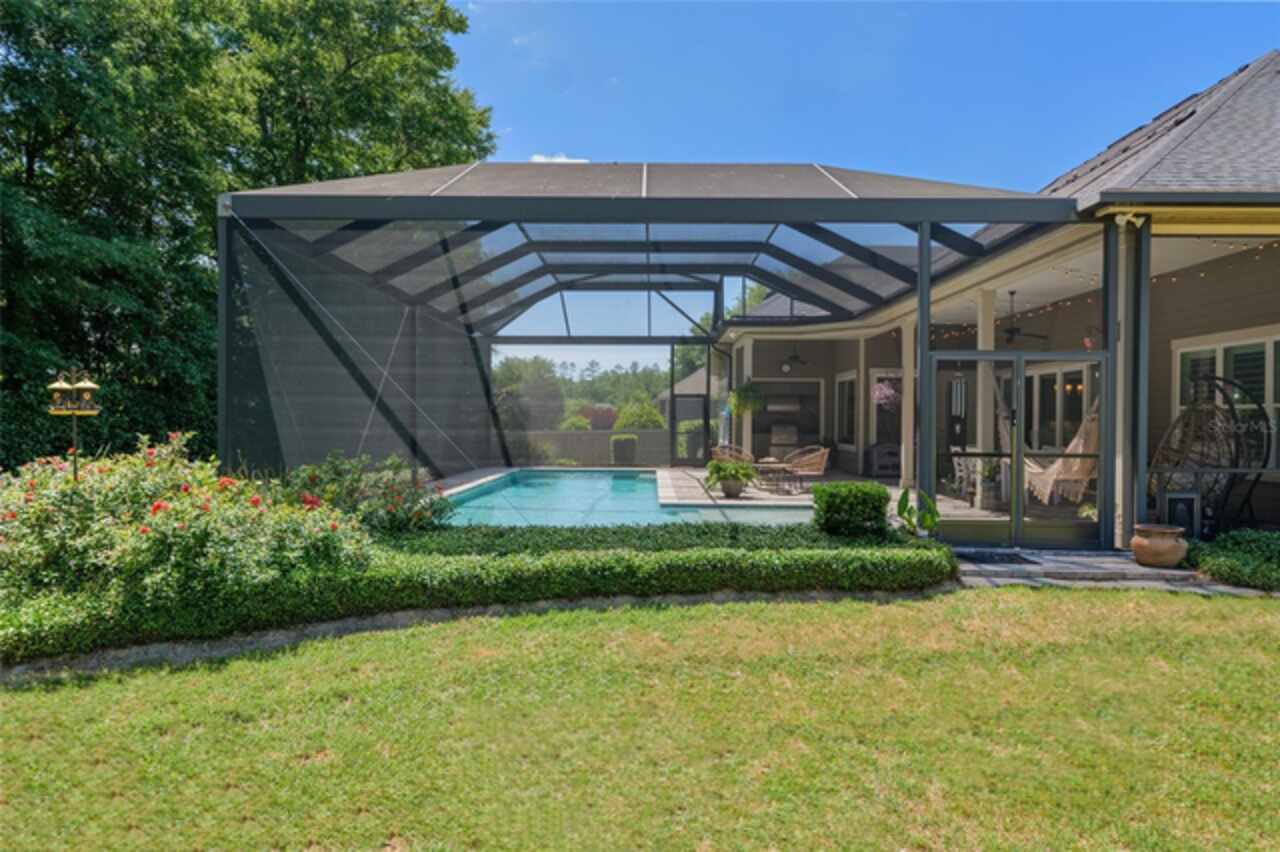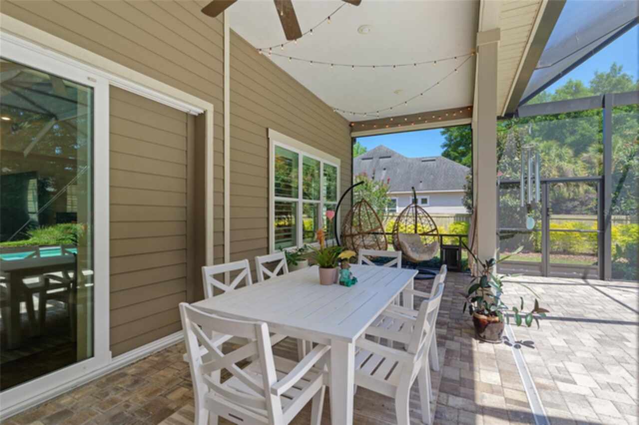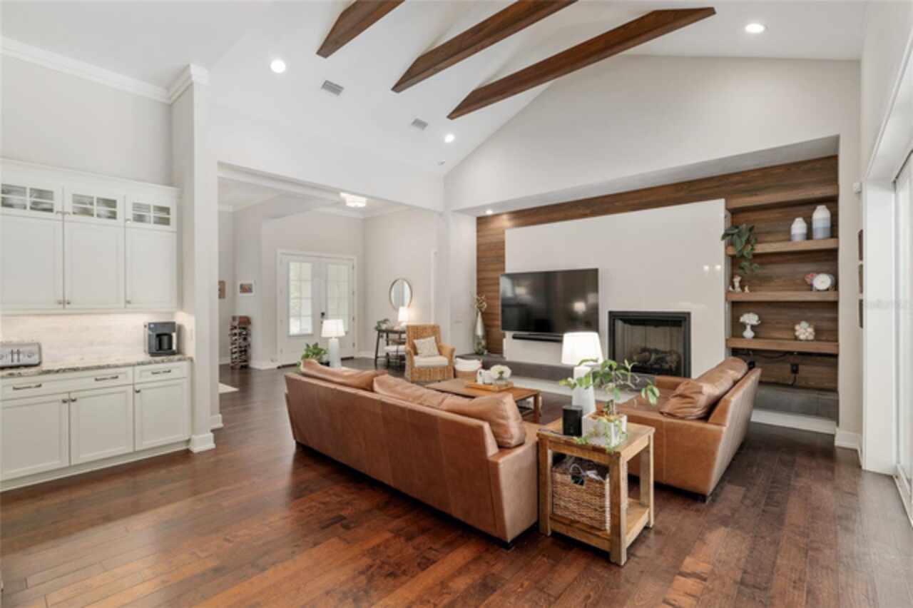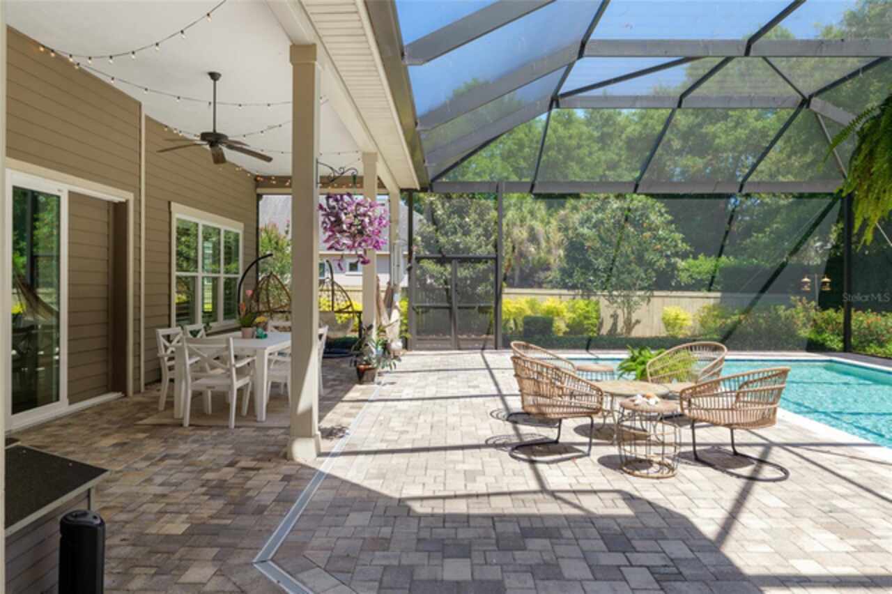 Under contract-accepting backup offers. Exceptionally built, an exceptional location and an exceptional floor plan! This Mark Warring built home in the Estates of Wilds Plantation is situated on a rarely available south-facing lot, which maximizes sunlight exposure. This popular floor plan features 4 bedrooms plus bonus room/5th bedroom home and 4 baths. Rich engineered hardwood flooring connects all of the downstairs living spaces. The separate dining room, great room, kitchen and nook have an easy flow, perfect for daily living or for casual entertaining. The wood beam vaulted ceiling gives the family room its spacious feel. The focal point is the wood ship lap wall with its modern aesthetic for your TV and gas fireplace. Floating shelves are to the right, and the entire wall has an elevated tiled hearth. Open the telescoping sliding glass doors to access your paver lanai, pool and summer kitchen area. The stunning kitchen has hand-crafted wood cabinetry and neutral granite counters. On each side of the exhaust hood are display cabinetry with glass inserts. Add’l features include a convection wall oven and separate microwave, a gas cooktop, double door pantry, a custom backsplash and a functional one-level center island countertop. The nook has a single French door for lanai and summer kitchen access. Via the nook are 2 guest rooms, each with double door closets, and a full guest bath. Off the opposite end of the kitchen is the en suite guest bedroom. This 4-way split plan offers the master suite and bath occupying the entire left wing of the home. Best features include south-facing windows of the lanai and pool and a step-up tray ceiling accented with natural wood beams. The hallway to the bath has his-and-her walk-in closets, each with organizational systems, and a hallway dressing mirror. The master bath features handcrafted floating cabinetry, neutral granite counters, a soaking tub with a custom tile wall and shelving flanking each side, and a separate water closet and step-in shower. The staircase for the bonus room/5th bedroom is located in the clutter hallway near the laundry room hallway. The upstairs landing as a direct attic access door and a storage closet. Spanning the width of the 3CG below with 528SF, the bonus room/5th bedroom features a double door entry, built-in shelving and a full guest bath. Downstairs the concrete paver lanai can be accessed via the nook or great room. The summer kitchen has a built-in grill with exhaust hood. The pool, its solar panels, and screen enclosure were added in 2017. The pool is perfect for swimming laps and for fun and play. The screen enclosure was specially engineered for “picture” screening for uninterrupted views of the rear yard on all 3 sides. Additional home features include 30-year architectural shingle roof, irrigation system, laundry room with sink and upper and lower cabinets for storage, Plantation shutters, Leviton WiFi enabled lighting system with dimming feature, alarm system, tankless gas WH, and a zoned high efficiency HVAC system. Walk, ride your bike or drive to the nearby local and private schools. Publix, several restaurants and local shops in the Haile Market Square, only 4 min away.