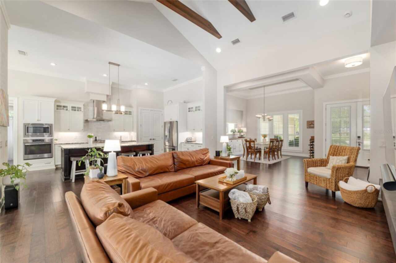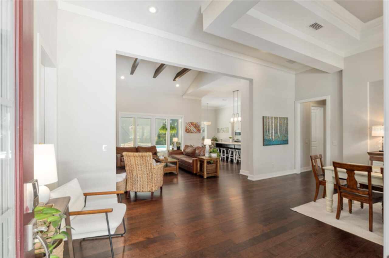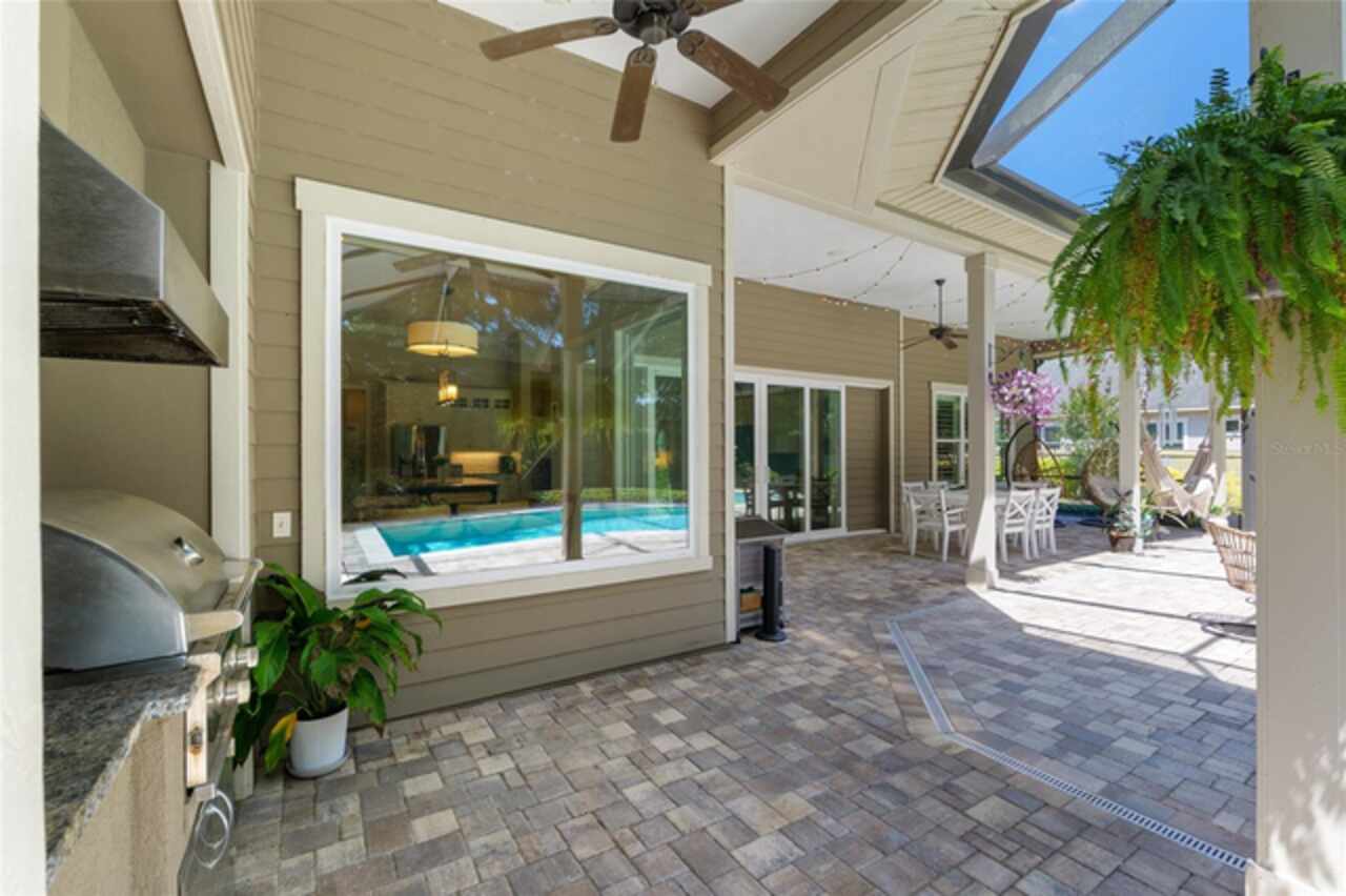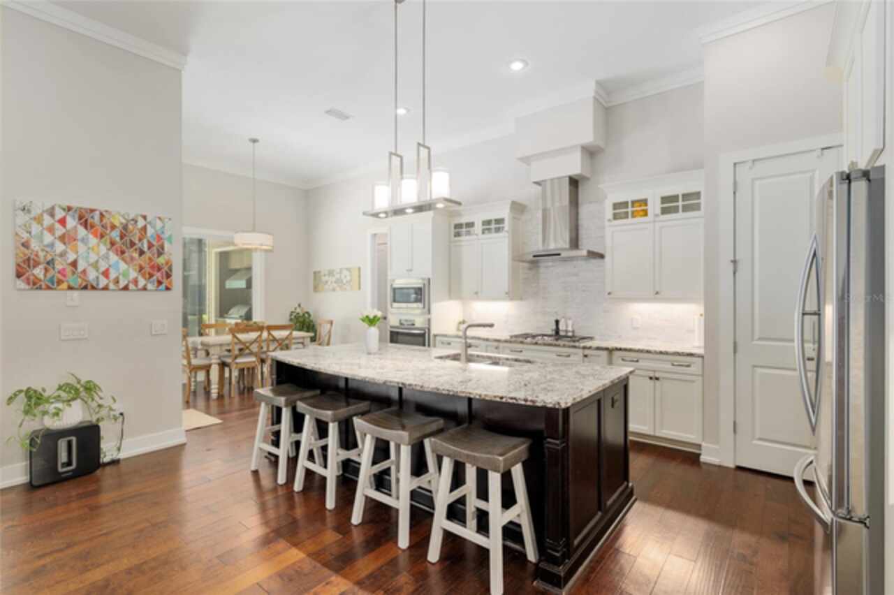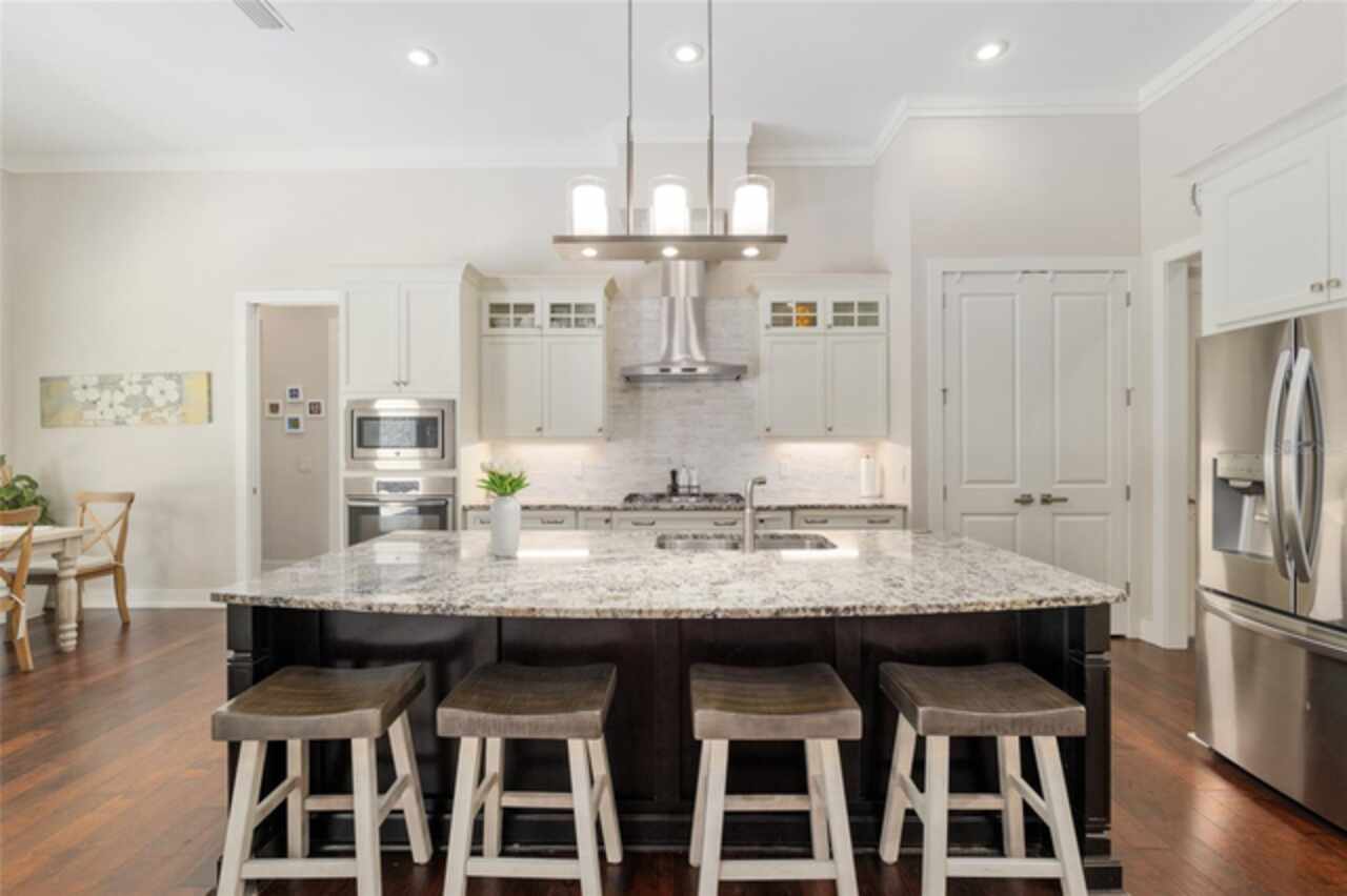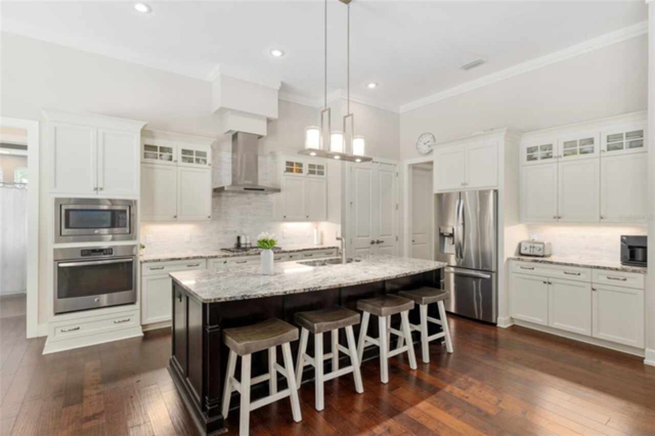 Under contract-accepting backup offers. Exceptionally built, an exceptional location and an exceptional floor plan! This Mark Warring built home in the Estates of Wilds Plantation is situated on a rarely available south-facing lot, which maximizes sunlight exposure. This popular floor plan features 4 bedrooms plus bonus room/5th bedroom home and 4 baths. Rich engineered hardwood flooring connects all of the downstairs living spaces. The separate dining room, great room, kitchen and nook have an easy flow, perfect for daily living or for casual entertaining. The wood beam vaulted ceiling gives the family room its spacious feel. The focal point is the wood ship lap wall with its modern aesthetic for your TV and gas fireplace. Floating shelves are to the right, and the entire wall has an elevated tiled hearth. Open the telescoping sliding glass doors to access your paver lanai, pool and summer kitchen area. The stunning kitchen has hand-crafted wood cabinetry and neutral granite counters. On each side of the exhaust hood are display cabinetry with glass inserts. Add’l features include a convection wall oven and separate microwave, a gas cooktop, double door pantry, a custom backsplash and a functional one-level center island countertop. The nook has a single French door for lanai and summer kitchen access. Via the nook are 2 guest rooms, each with double door closets, and a full guest bath. Off the opposite end of the kitchen is the en suite guest bedroom. This 4-way split plan offers the master suite and bath occupying the entire left wing of the home. Best features include south-facing windows of the lanai and pool and a step-up tray ceiling accented with natural wood beams. The hallway to the bath has his-and-her walk-in closets, each with organizational systems, and a hallway dressing mirror. The master bath features handcrafted floating cabinetry, neutral granite counters, a soaking tub with a custom tile wall and shelving flanking each side, and a separate water closet and step-in shower. The staircase for the bonus room/5th bedroom is located in the clutter hallway near the laundry room hallway. The upstairs landing as a direct attic access door and a storage closet. Spanning the width of the 3CG below with 528SF, the bonus room/5th bedroom features a double door entry, built-in shelving and a full guest bath. Downstairs the concrete paver lanai can be accessed via the nook or great room. The summer kitchen has a built-in grill with exhaust hood. The pool, its solar panels, and screen enclosure were added in 2017. The pool is perfect for swimming laps and for fun and play. The screen enclosure was specially engineered for “picture” screening for uninterrupted views of the rear yard on all 3 sides. Additional home features include 30-year architectural shingle roof, irrigation system, laundry room with sink and upper and lower cabinets for storage, Plantation shutters, Leviton WiFi enabled lighting system with dimming feature, alarm system, tankless gas WH, and a zoned high efficiency HVAC system. Walk, ride your bike or drive to the nearby local and private schools. Publix, several restaurants and local shops in the Haile Market Square, only 4 min away.