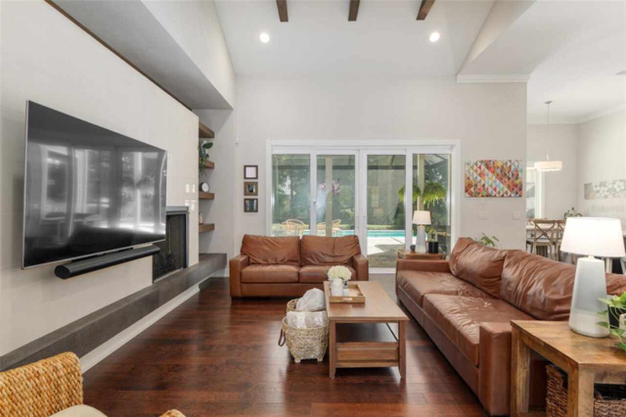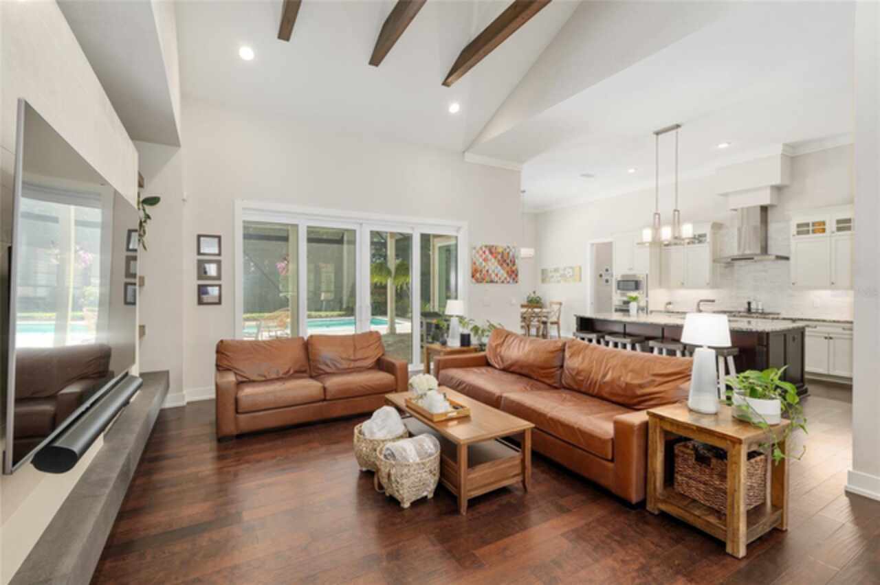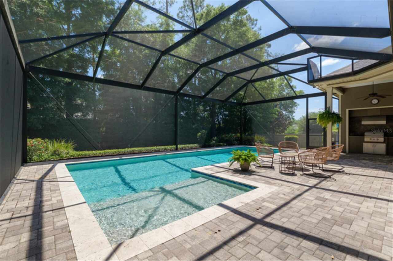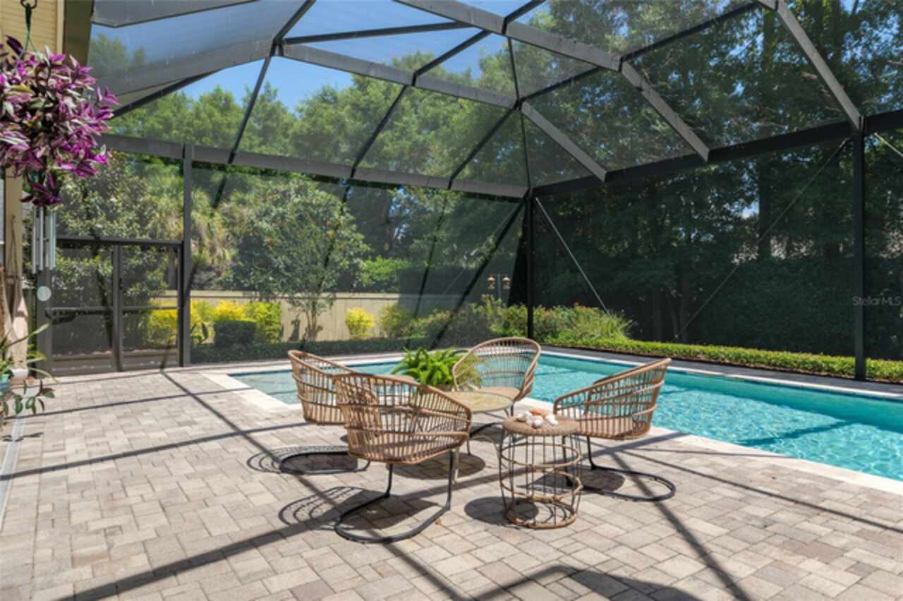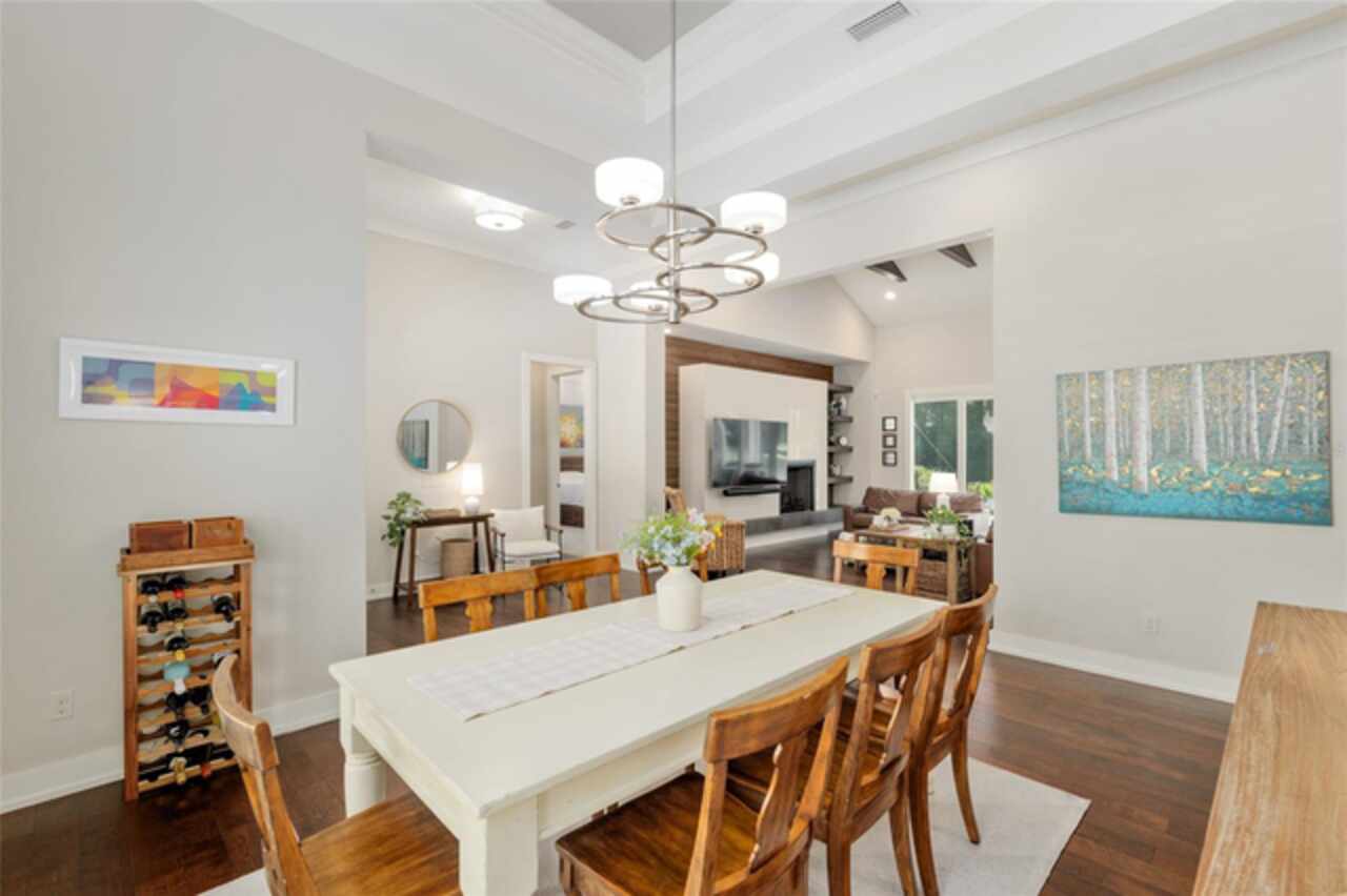Under contract-accepting backup offers. Exceptionally built, an exceptional location and an exceptional floor plan! This Mark Warring built home in the Estates of Wilds Plantation is situated on a rarely available south-facing lot, which maximizes sunlight exposure. This popular floor plan features 4 bedrooms plus bonus room/5th bedroom home and 4 baths. Rich engineered hardwood flooring connects all of the downstairs living spaces. The separate dining room, great room, kitchen and nook have an easy flow, perfect for daily living or for casual entertaining. The wood beam vaulted ceiling gives the family room its spacious feel. The focal point is the wood ship lap wall with its modern aesthetic for your TV and gas fireplace. Floating shelves are to the right, and the entire wall has an elevated tiled hearth. Open the telescoping sliding glass doors to access your paver lanai, pool and summer kitchen area. The stunning kitchen has hand-crafted wood cabinetry and neutral granite counters. On each side of the exhaust hood are display cabinetry with glass inserts. Add’l features include a convection wall oven and separate microwave, a gas cooktop, double door pantry, a custom backsplash and a functional one-level center island countertop. The nook has a single French door for lanai and summer kitchen access. Via the nook are 2 guest rooms, each with double door closets, and a full guest bath. Off the opposite end of the kitchen is the en suite guest bedroom. This 4-way split plan offers the master suite and bath occupying the entire left wing of the home. Best features include south-facing windows of the lanai and pool and a step-up tray ceiling accented with natural wood beams. The hallway to the bath has his-and-her walk-in closets, each with organizational systems, and a hallway dressing mirror. The master bath features handcrafted floating cabinetry, neutral granite counters, a soaking tub with a custom tile wall and shelving flanking each side, and a separate water closet and step-in shower. The staircase for the bonus room/5th bedroom is located in the clutter hallway near the laundry room hallway. The upstairs landing as a direct attic access door and a storage closet. Spanning the width of the 3CG below with 528SF, the bonus room/5th bedroom features a double door entry, built-in shelving and a full guest bath. Downstairs the concrete paver lanai can be accessed via the nook or great room. The summer kitchen has a built-in grill with exhaust hood. The pool, its solar panels, and screen enclosure were added in 2017. The pool is perfect for swimming laps and for fun and play. The screen enclosure was specially engineered for “picture” screening for uninterrupted views of the rear yard on all 3 sides. Additional home features include 30-year architectural shingle roof, irrigation system, laundry room with sink and upper and lower cabinets for storage, Plantation shutters, Leviton WiFi enabled lighting system with dimming feature, alarm system, tankless gas WH, and a zoned high efficiency HVAC system. Walk, ride your bike or drive to the nearby local and private schools. Publix, several restaurants and local shops in the Haile Market Square, only 4 min away.