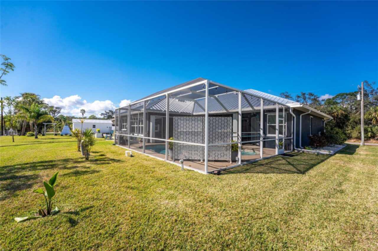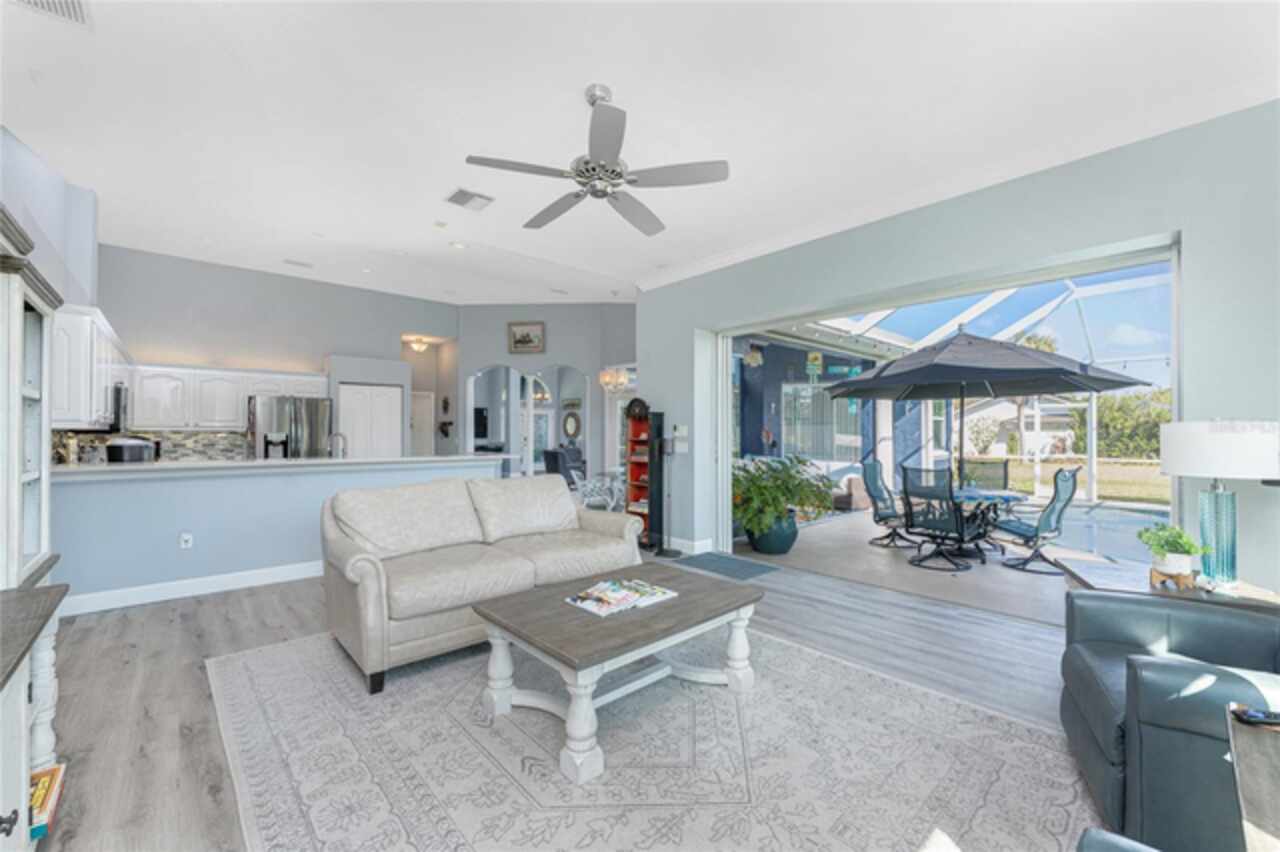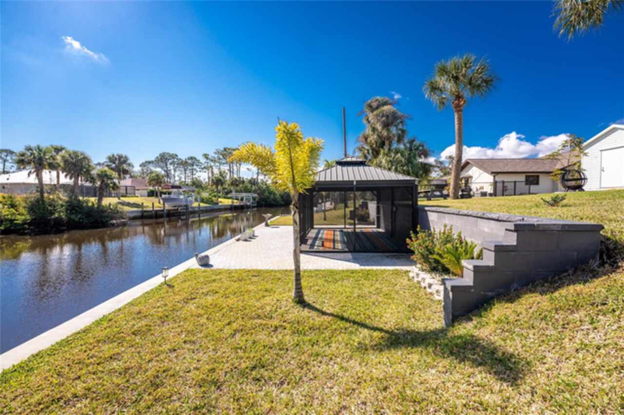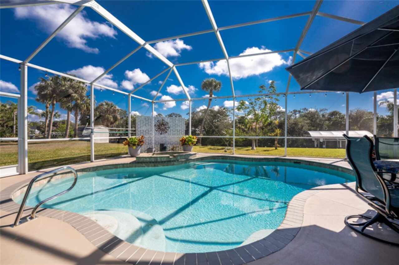 OUT OF FLOOD ZONE, DOUBLE LOT This stunning waterfront home sits on a rare double lot with 160 feet of water frontage, offering breathtaking views, a concrete seawall, and ample space for outdoor enjoyment. Located out of the flood zone, this property boasts a southeast-facing backyard, providing sunlight almost all day long, perfect for relaxing or entertaining. The home features a versatile and flexible floor plan, with a family room, living room, dining room, and a cozy dinette area framed by an aquarium window that brings the beauty of the outdoors inside. At the heart of the home is the spacious kitchen, designed with both style and functionality. Featuring quartz countertops, a tiled backsplash, a large island, a breakfast bar, and a pantry, this kitchen is ideal for cooking, entertaining, and creating memories. It seamlessly connects to the living areas, making it the perfect gathering space for family and friends. An indoor laundry room adds convenience and practicality to everyday living. The split floor plan provides privacy and comfort, with the primary bedroom suite located on the left side of the home and the two additional large bedrooms (12x13) on the opposite side. The luxurious primary suite features his-and-her closets, a spa-like bathroom with a large walk-in shower with quartz shower walls, his-and-her vanities, a garden tub, linen closet and a private water closet. Three sets of sliding glass doors lead to the inviting SALT-WATER swimming pool, creating a seamless connection between indoor and outdoor living. The tall ceilings with crown molding, elegant arches, and stately columns add a sense of grandeur, while updates like a new metal roof (2023), an HVAC system (2017), hurricane windows, and accordion shutters on the sliders provide peace of mind. Outdoors, the property is a true gem. It features new pilings and a 40x8 Trex boat dock, a concrete seawall, two spacious sheds (24x11 and 12x10), and a large area for RV or boat parking. The beautifully landscaped yard, with low-maintenance rocks surrounding the home, complements the property’s elegance. Additional features include city water, irrigation by well, and a three-car garage for all your storage needs. This home combines elegance, functionality, and waterfront living in a way that is truly unmatched. With its flexible layout, luxurious upgrades, and stunning outdoor spaces, it’s a one-of-a-kind property you won’t want to miss. Schedule your private showing today and discover all this home has to offer!