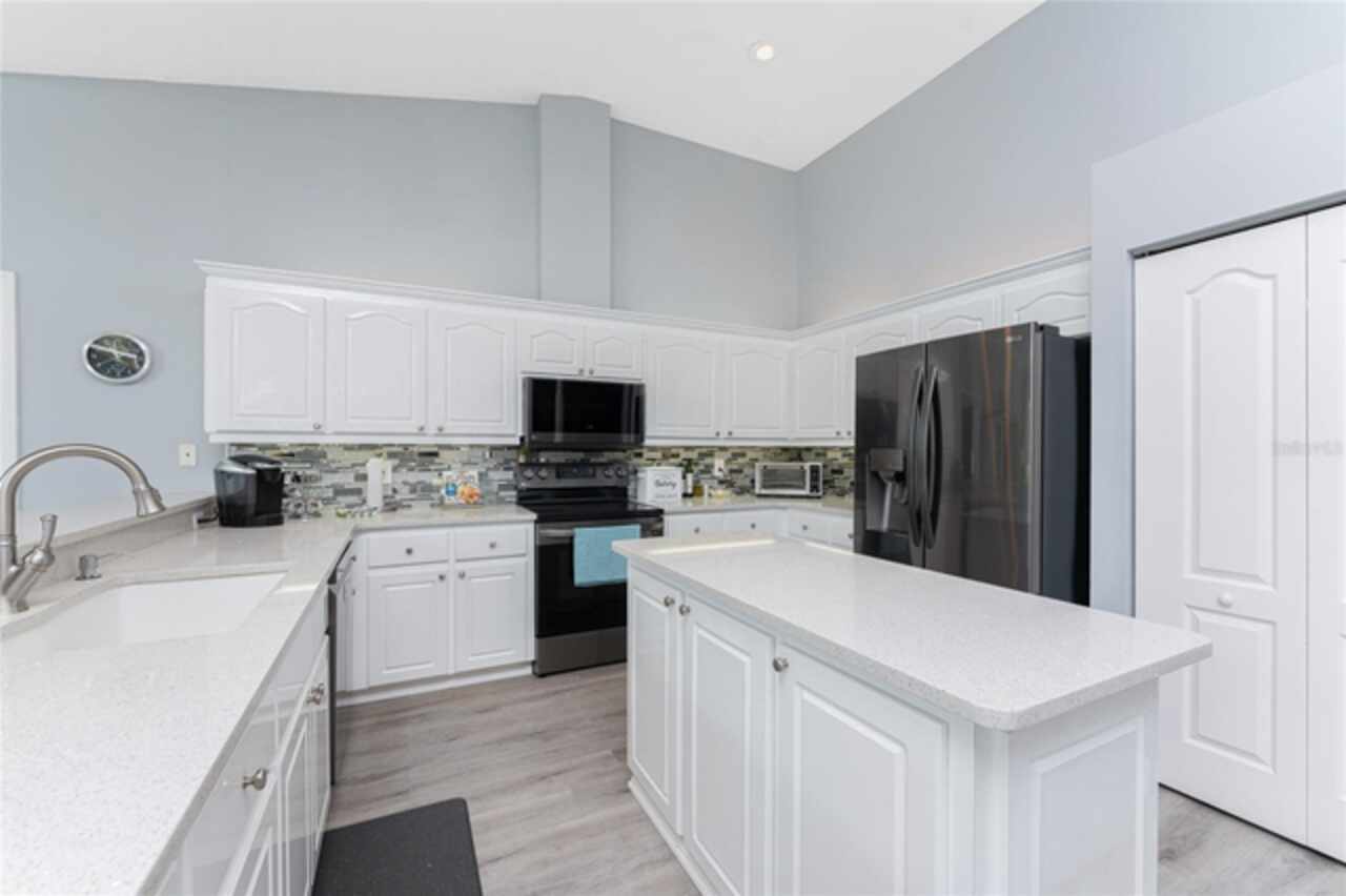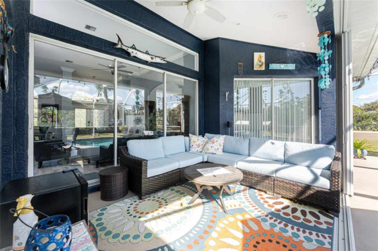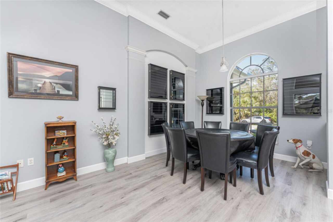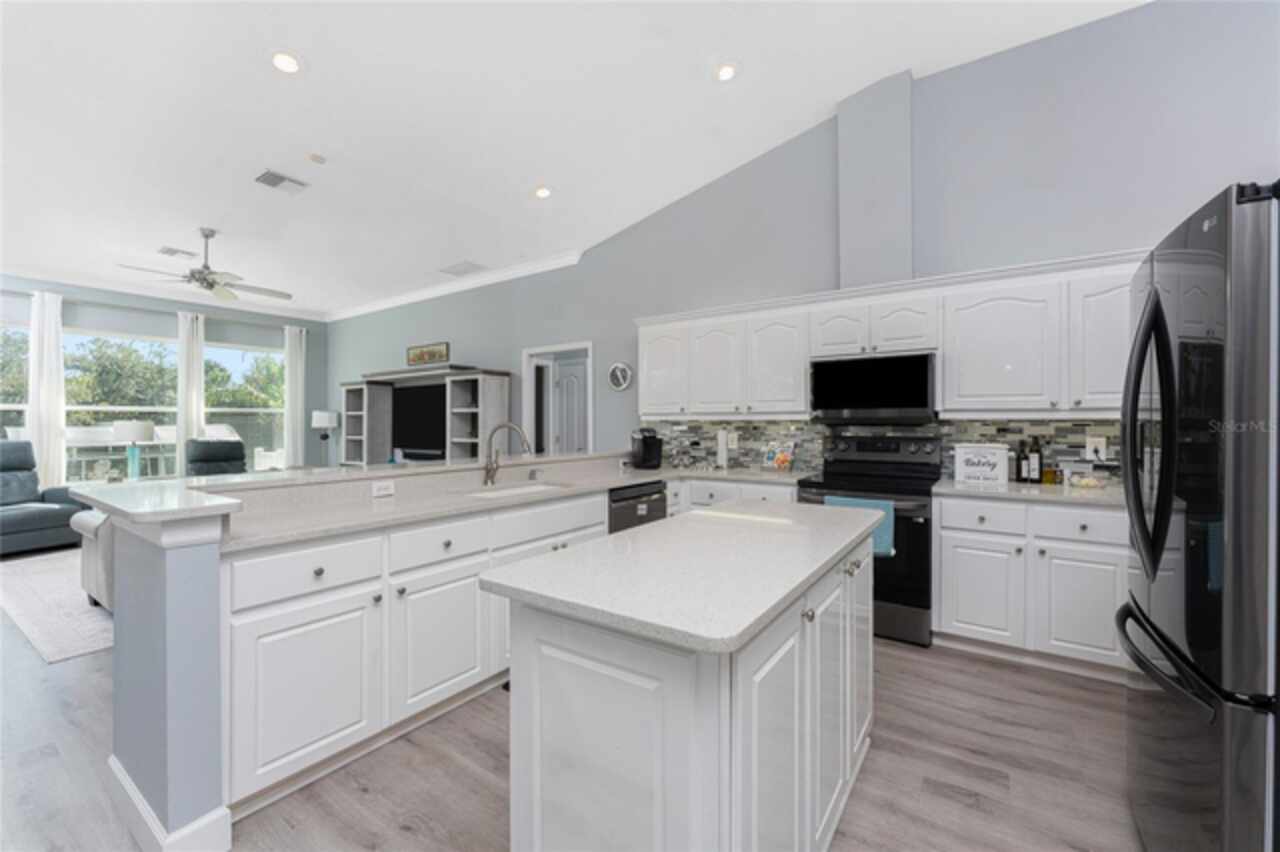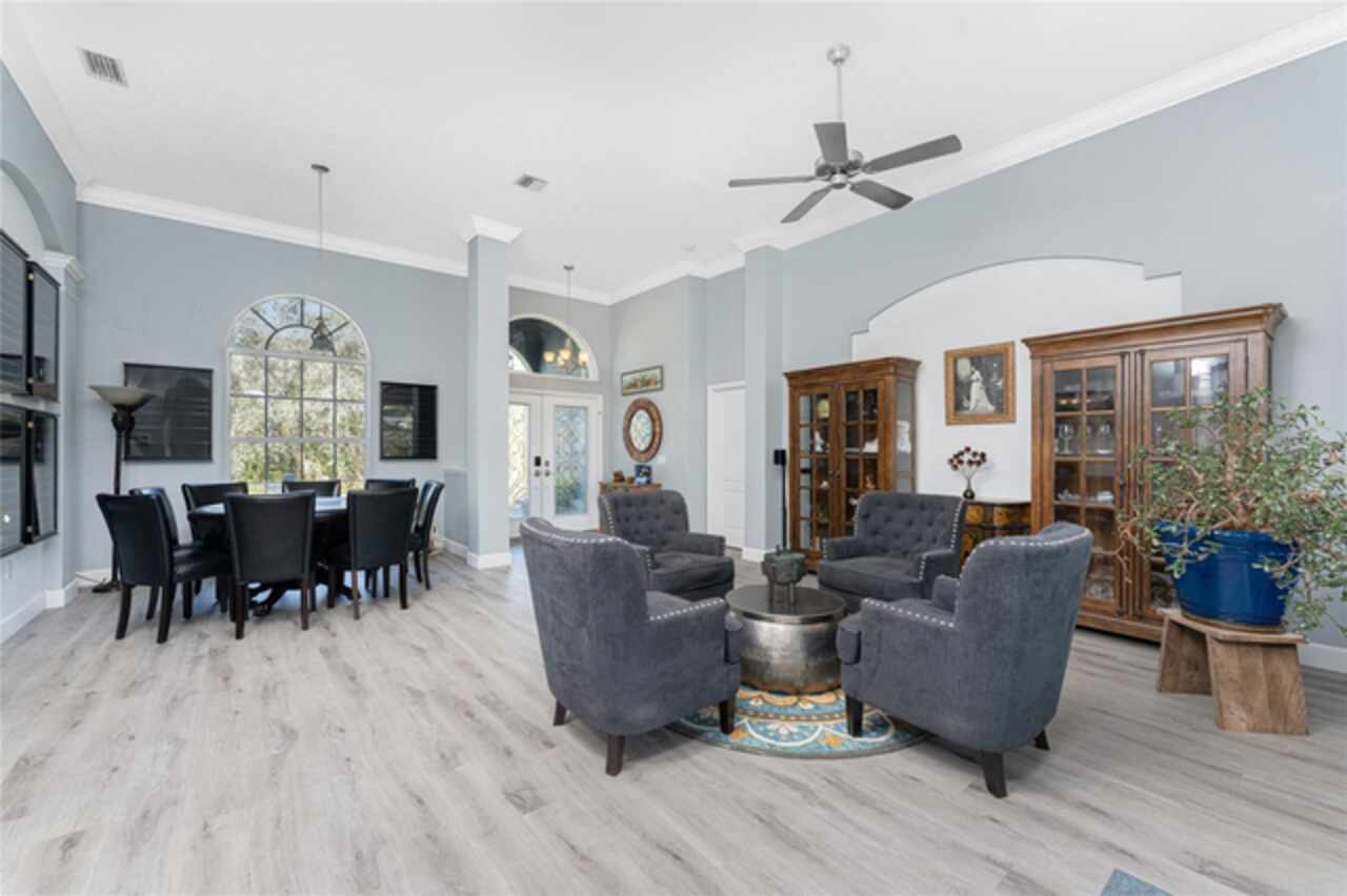 OUT OF FLOOD ZONE, DOUBLE LOT This stunning waterfront home sits on a rare double lot with 160 feet of water frontage, offering breathtaking views, a concrete seawall, and ample space for outdoor enjoyment. Located out of the flood zone, this property boasts a southeast-facing backyard, providing sunlight almost all day long, perfect for relaxing or entertaining. The home features a versatile and flexible floor plan, with a family room, living room, dining room, and a cozy dinette area framed by an aquarium window that brings the beauty of the outdoors inside. At the heart of the home is the spacious kitchen, designed with both style and functionality. Featuring quartz countertops, a tiled backsplash, a large island, a breakfast bar, and a pantry, this kitchen is ideal for cooking, entertaining, and creating memories. It seamlessly connects to the living areas, making it the perfect gathering space for family and friends. An indoor laundry room adds convenience and practicality to everyday living. The split floor plan provides privacy and comfort, with the primary bedroom suite located on the left side of the home and the two additional large bedrooms (12x13) on the opposite side. The luxurious primary suite features his-and-her closets, a spa-like bathroom with a large walk-in shower with quartz shower walls, his-and-her vanities, a garden tub, linen closet and a private water closet. Three sets of sliding glass doors lead to the inviting SALT-WATER swimming pool, creating a seamless connection between indoor and outdoor living. The tall ceilings with crown molding, elegant arches, and stately columns add a sense of grandeur, while updates like a new metal roof (2023), an HVAC system (2017), hurricane windows, and accordion shutters on the sliders provide peace of mind. Outdoors, the property is a true gem. It features new pilings and a 40x8 Trex boat dock, a concrete seawall, two spacious sheds (24x11 and 12x10), and a large area for RV or boat parking. The beautifully landscaped yard, with low-maintenance rocks surrounding the home, complements the property’s elegance. Additional features include city water, irrigation by well, and a three-car garage for all your storage needs. This home combines elegance, functionality, and waterfront living in a way that is truly unmatched. With its flexible layout, luxurious upgrades, and stunning outdoor spaces, it’s a one-of-a-kind property you won’t want to miss. Schedule your private showing today and discover all this home has to offer!