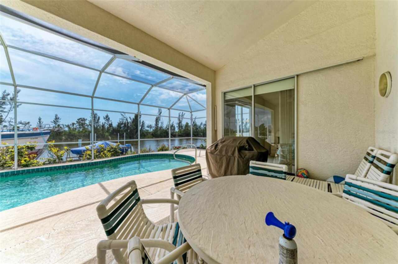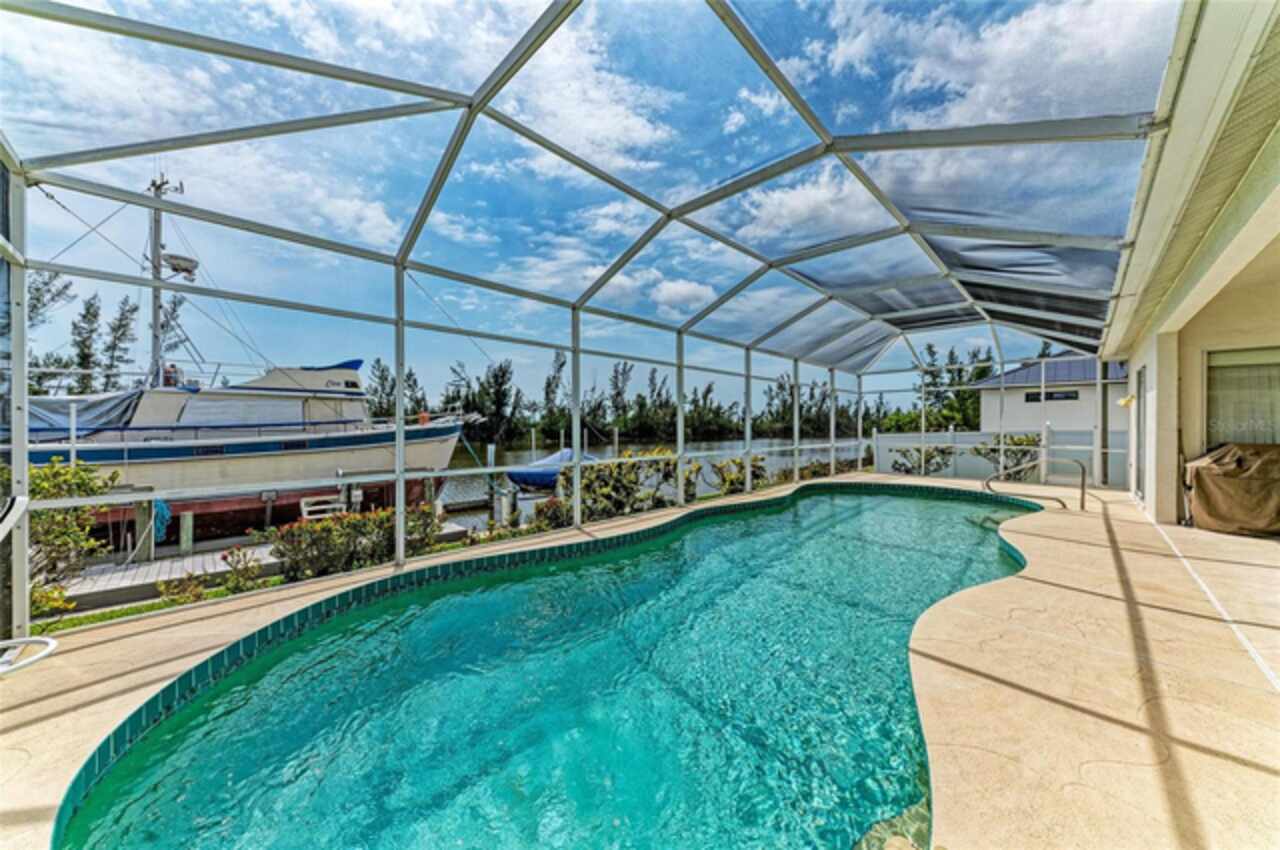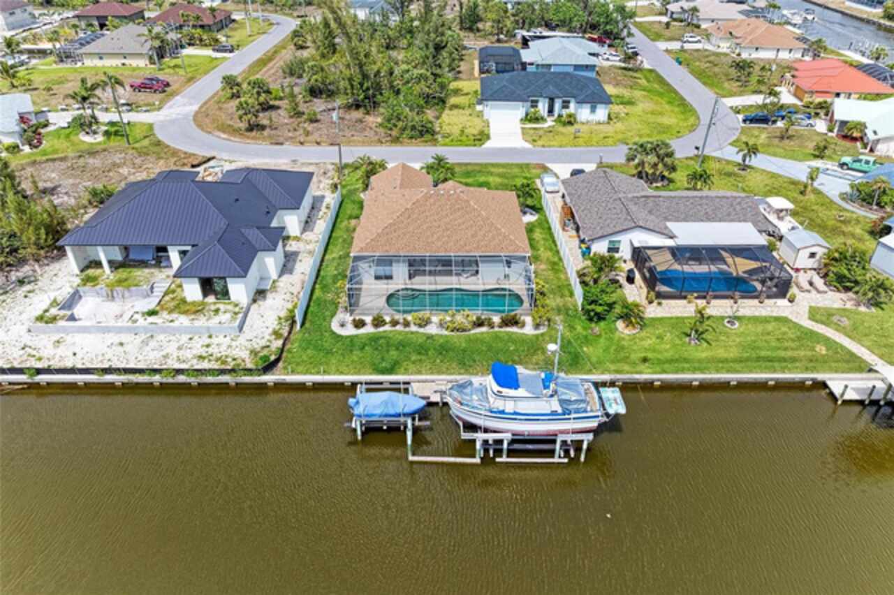 This waterfront home offers breathtaking, unobstructed views across the serene Santa Cruz Canal to a designated preserve area, ensuring privacy and tranquility. Abutting sailboat waters, this property provides the ideal setting for waterfront living. Upon arriving, you’re greeted by a pristine white vinyl fence that runs from the front down both sides of the home, leading to the spacious lanai. Step through double doors into a tiled entryway, where natural light pours in through the transom above, illuminating the soaring cathedral ceiling. The expansive open floor plan flows seamlessly between the kitchen, dinette, and great room, creating an inviting and airy space perfect for both everyday living and entertaining. The kitchen-dinette combo features rectangular tile floors, a convenient pantry, breakfast bar, and all essential appliances. The adjacent great room is carpeted and opens up through sliders, inviting in fresh air and sunlight, enhancing the light, bright ambiance of the home. For privacy, two guest bedrooms are tucked away behind a pocket door, creating a quiet retreat. One of these rooms boasts an ensuite bath with a shower stall, single vanity, and serves as the pool bath with convenient access from the lanai. The second guest bath, located in the hallway, features a single vanity and a combo tub/shower unit. The spacious primary bedroom, located on the opposite side of the home, is a private sanctuary with two sets of sliders leading directly to the lanai and pool area. The suite also offers his-and-her walk-in closets and an ensuite bath with a double vanity, separate tub, and shower, all accented with wall to wall carpet. Step outside to discover your own private oasis—an oversized heated pool (approximately 36' x 12') with a cool deck that promises comfort underfoot. The lanai (22' x 11') and pool area are screened, ensuring peaceful enjoyment of the beautiful views and refreshing breezes. At water's edge, a two-tiered dock (26' x 6') with dual boat lifts (40K lbs & 6K lbs) awaits your watercraft, making this home a true boater's dream. The canal waters also flow through the property’s sprinkler system, keeping your landscaping lush and vibrant year-round. Recent upgrades include a new pool pump, irrigation pump, and water heater all replaced in 2025, and a new roof installed in 2022. With several airports in southwest Florida nearby, as well as a wealth of dining, hiking and biking trails, and Gulf Coast beaches, this location provides both convenience and recreation. The area is renowned for world-class tarpon fishing and abundant outdoor activities. This is a great opportunity to own a waterfront property that blends comfort and privacy with nature's beauty. Bring your vision to life and start living the waterfront lifestyle you deserve.