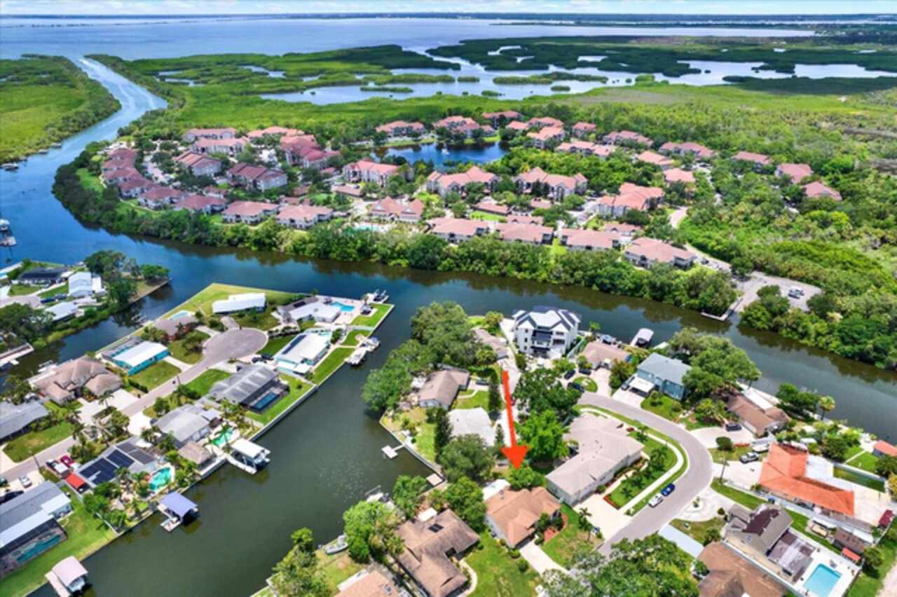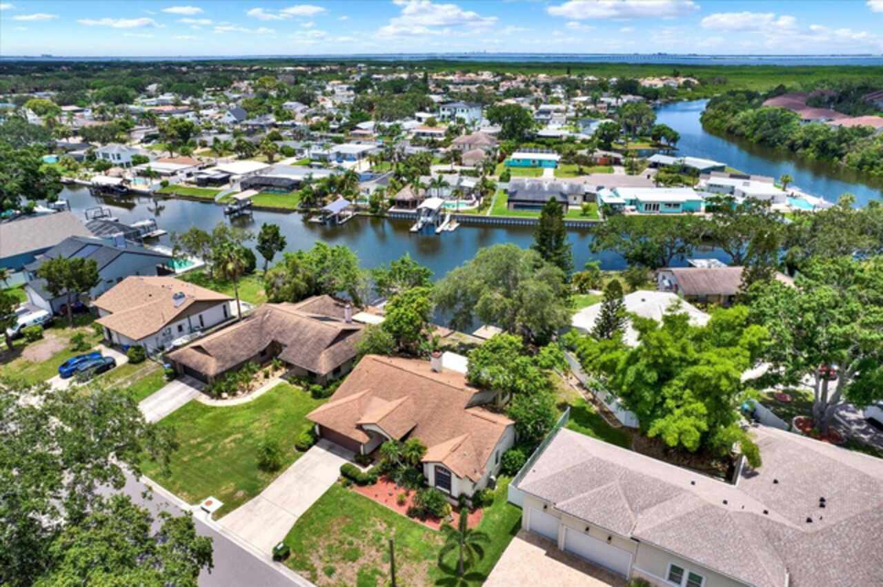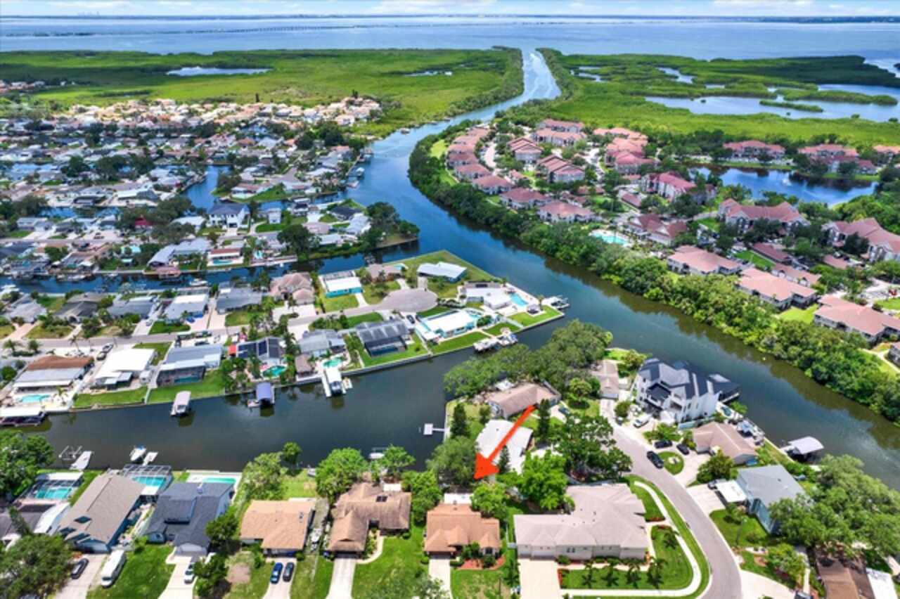 Desirable Tampa Shores community home tucked away on a quiet cul-de-sac street at the widest end of a waterfront canal with direct access to Tampa Bay. No HOA. Perched high and dry from recent record storms. Lush landscaping abounds. Architecturally designed, open yet defined spaces with volume ceilings. Florida sunshine streams through every window, giving a light and airy vibe. Grab your book and sit by the fire in the centrally located living room. The kitchen is anchored at one end by the impressive dining room and on the other by a bay window breakfast area overlooking the Florida room. The spacious primary suite is a peaceful retreat at the end of a long day. A timeless geometric deep red tile floor covers the 520 sq. ft. Florida room, wrapped in windows that showcase the deck and stunning water views. Enjoy dinner on the expansive deck as you take in the beautiful views and watch dolphins and manatees at play. All this is located just minutes to Tampa International Airport, downtown Tampa, Clearwater Beach, and unlimited restaurants and shopping. Schedule your showing today! Be sure to watch the video walk-thru! .