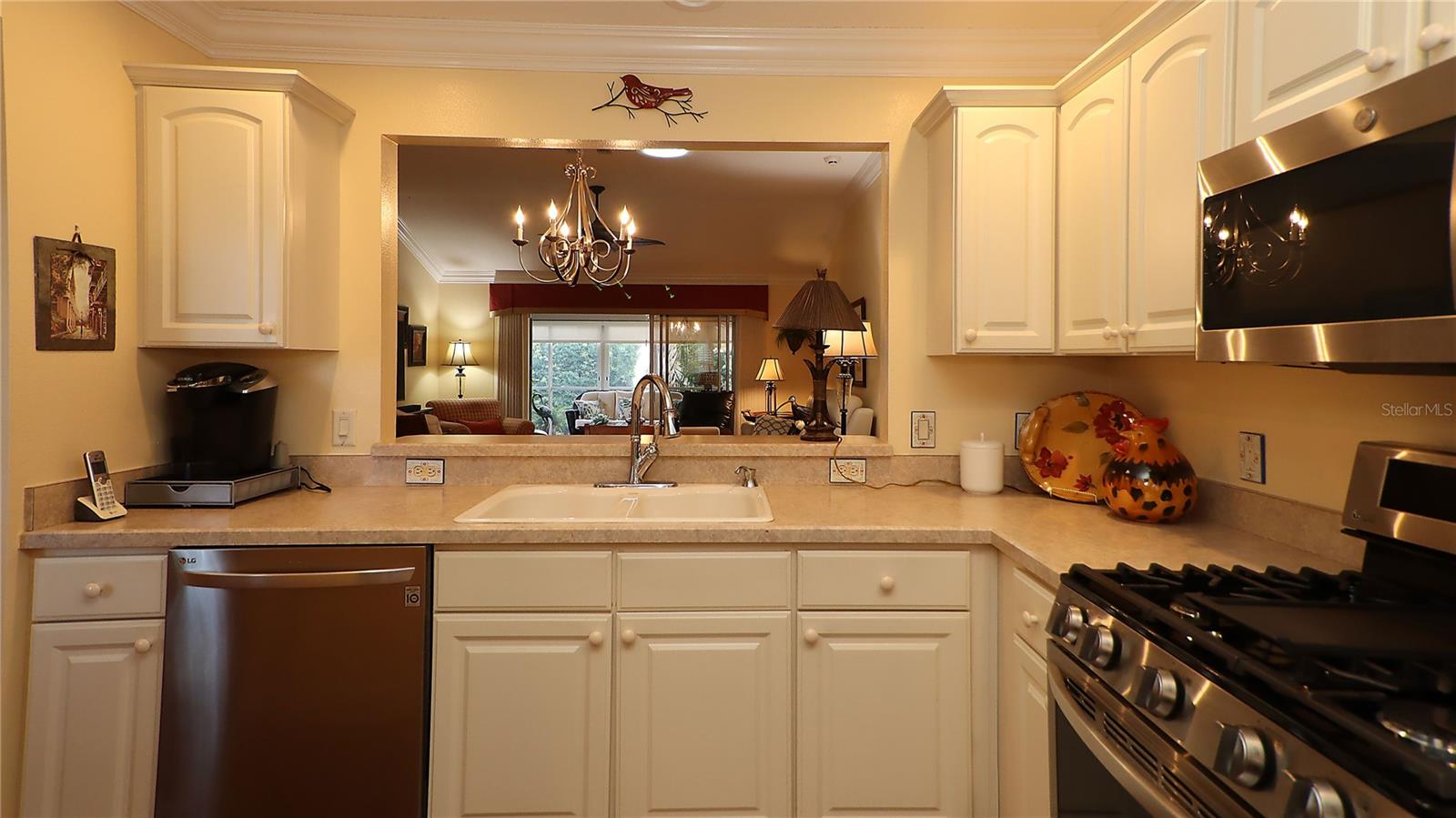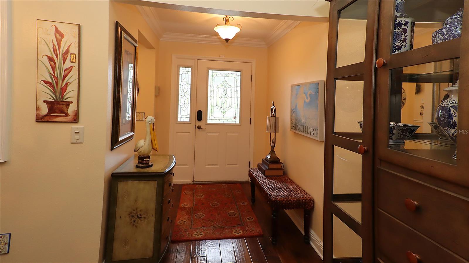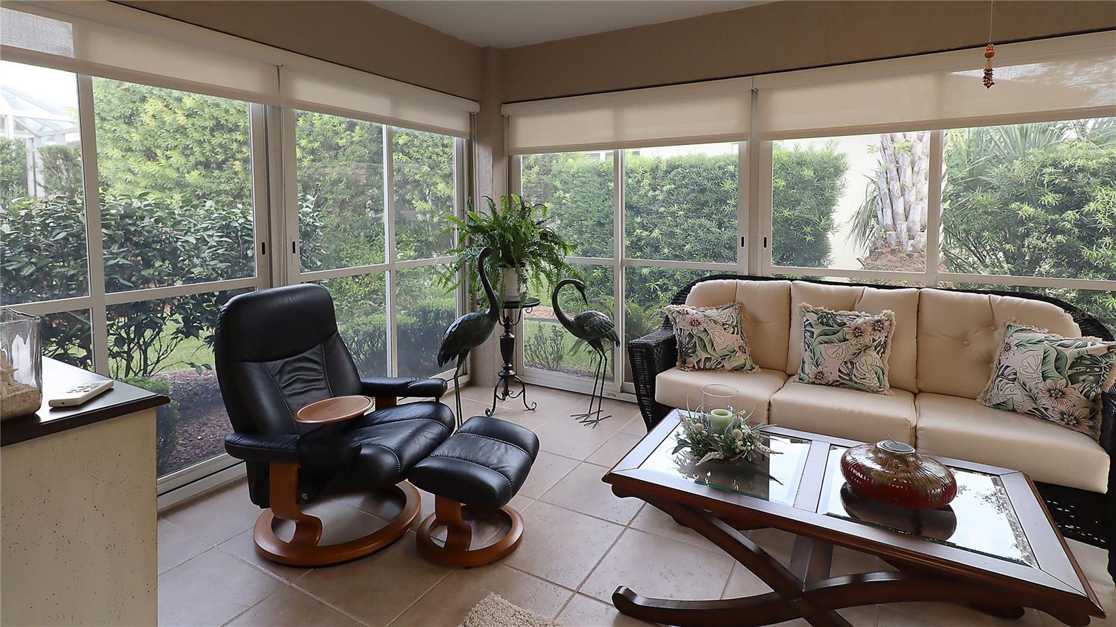 Under contract-accepting backup offers. Motivated Seller agrees to a NEW PRICE. If you would like to live a short way away from the town square, this home may be for you. It is just a short drive to Sumter Landing, entertainment, music, shopping and dining. Golf courses are all around the Village of Largo ( Bogart and Bacall courses and the Bacall recreation center where you can take classes). This beautiful block and stucco 3/2 Jasmine designer is located in the Village of Largo and has so much for you. First the street appeal is lovely with the trimmed hedges and trees, the cement textured driveway and walk way. As you enter through the leaded glass front door you will enjoy the beautiful hickory wood flooring in the dining, living, and kitchen. The kitchen has an eat in nook and new stainless appliances and the door to the double car garage (with enhanced lighting) is right off the kitchen. Vaulted ceilings and crown molding, and a solar tube grace the living room and dining room. Through the sliders you can enjoy the Florida Room which has its own HVAC, shades and a finished floor. There is also a door to the outdoor patio where you can put your grill or enjoy the Florida sunshine. As you come back into the center of the home you will see that it is a split floorplan with the Primary bedroom on the right. There are plantation shutters in this room as well as the rest of the home. Overhead fans are in every room. The Primary has a large custom walk-in closet. The Primary bath has double sinks and a soothing shower. On the opposite side of the home are two guest bedrooms both with closets and wood laminate flooring and plantation shutters. The guest bath has a tub/shower combo. This home has two HVAC units 2020, roof is 10 years old with architectural shingles. There is also a Termite warranty on this home which means it has been treated to keep termites away. Stop and see this unique home before its gone. Maint. $590.03, Bond annual pmt $1, 608.96, Fire $320.71, Taxes $1, 744.05