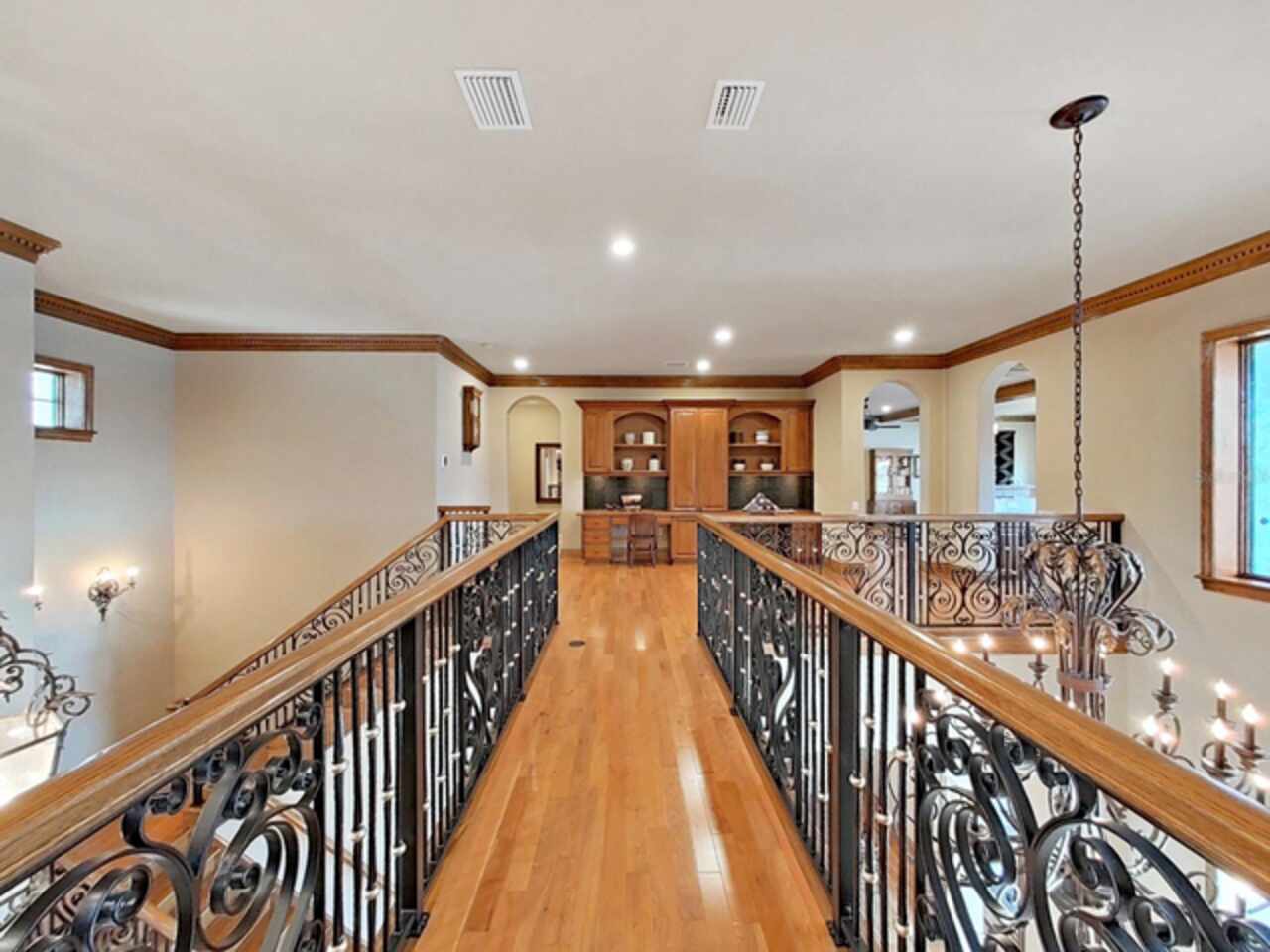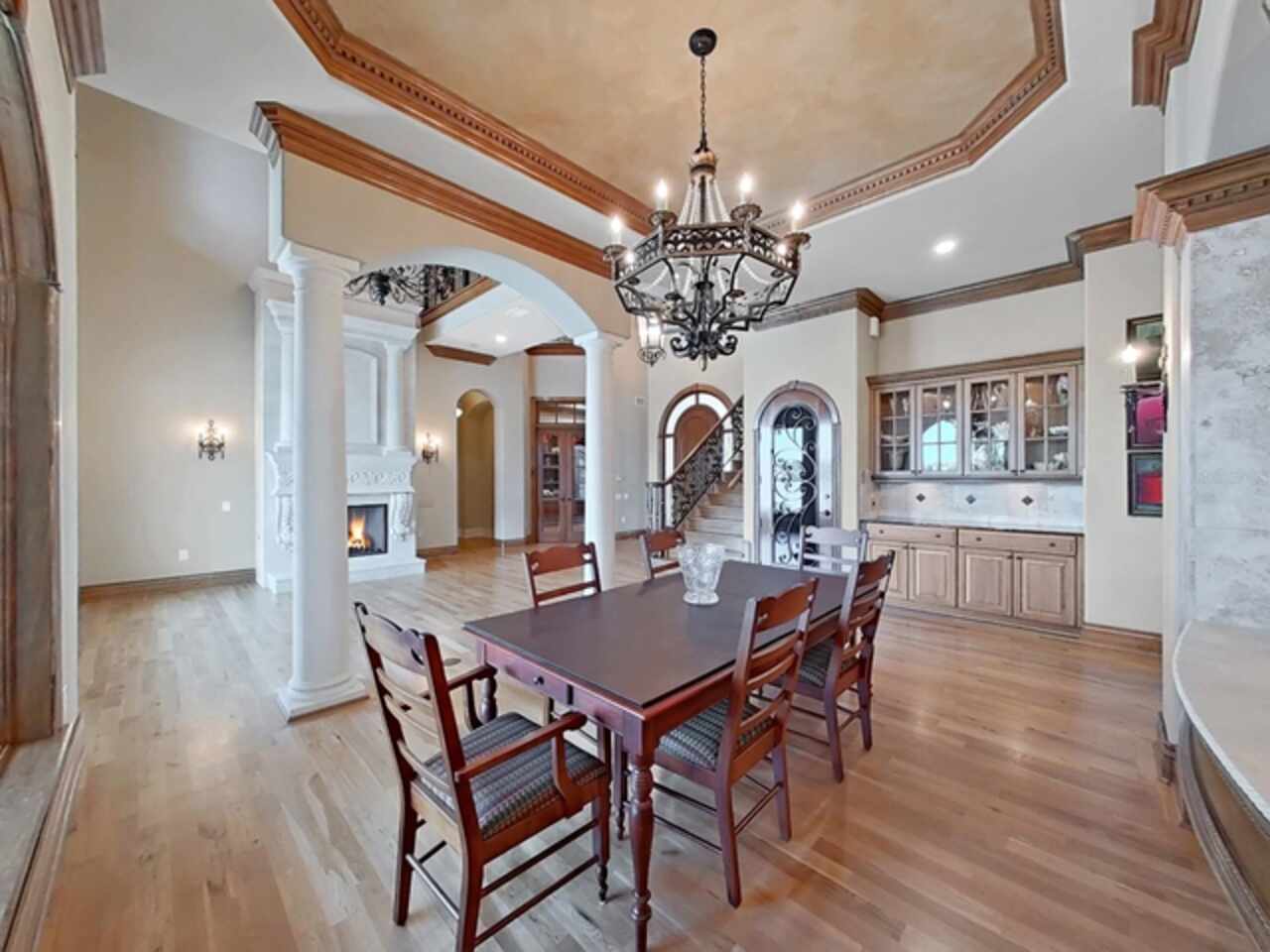 Built-in Features, Ceiling Fans(s), Crown Molding, Eat-in Kitchen, High Ceilings, In Wall Pest System, Kitchen/Family Room Combo, Living Room/Dining Room Combo, Open Floorplan, Primary Bedroom Main Floor, Solid Surface Counters, Solid Wood Cabinets, Stone Counters, Thermostat, Tray Ceiling(s), Vaulted Ceiling(s), Walk-In Closet(s), Wet Bar, Window Treatments