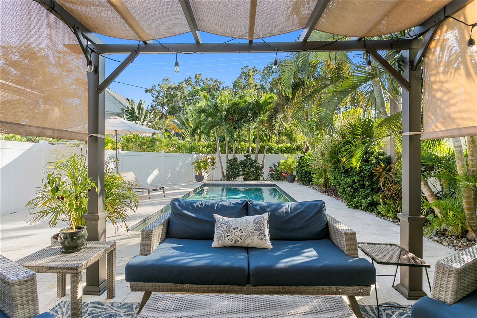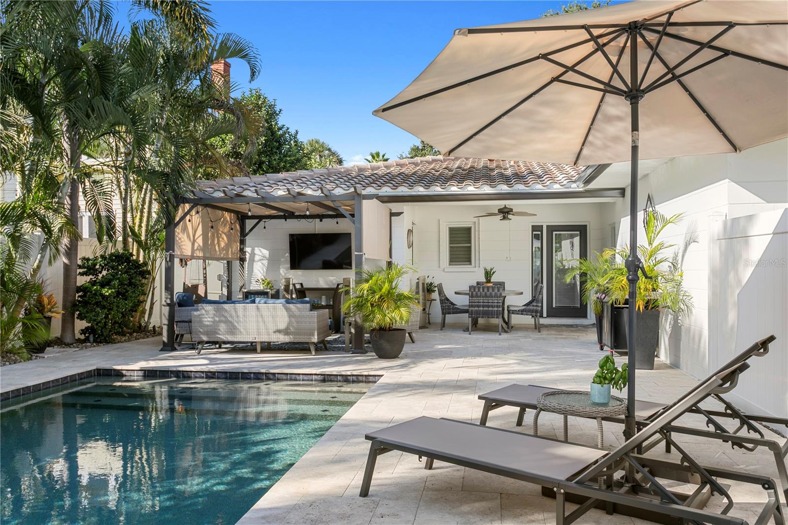Under contract-accepting backup offers. Palm Beach vibes in the heart of Euclid St. Paul, one of St. Pete’s most beloved and walkable neighborhoods. This chic concrete block home sits high and dry (no flood insurance required) on one of the most naturally elevated lots in Pinellas County. A brand-new tile roof, whole-house generator, tankless gas hot water heater, and natural gas range bring peace-of-mind and convenience, while the original terrazzo floors add that perfect touch of Florida mid-century style. The backyard is a true retreat with heated saltwater pool, multiple outdoor living, dining, and lounging zones, and landscape lighting that transforms the space into a glowing private resort by night. It’s the ultimate bonus living space, and where everyone will want to gather. Inside, the floor plan is bright and comfortable, and the attached 1-car garage adds everyday practicality. Set along the grand, tree-lined boulevard of 14th Ave N, you’ll love the friendly, active community vibe with neighbors out walking, biking, and chatting all day long. Just a short stroll or quick ride to Crescent Lake, and all the restaurants, cafés, and boutiques along Central Ave and Downtown St. Pete.