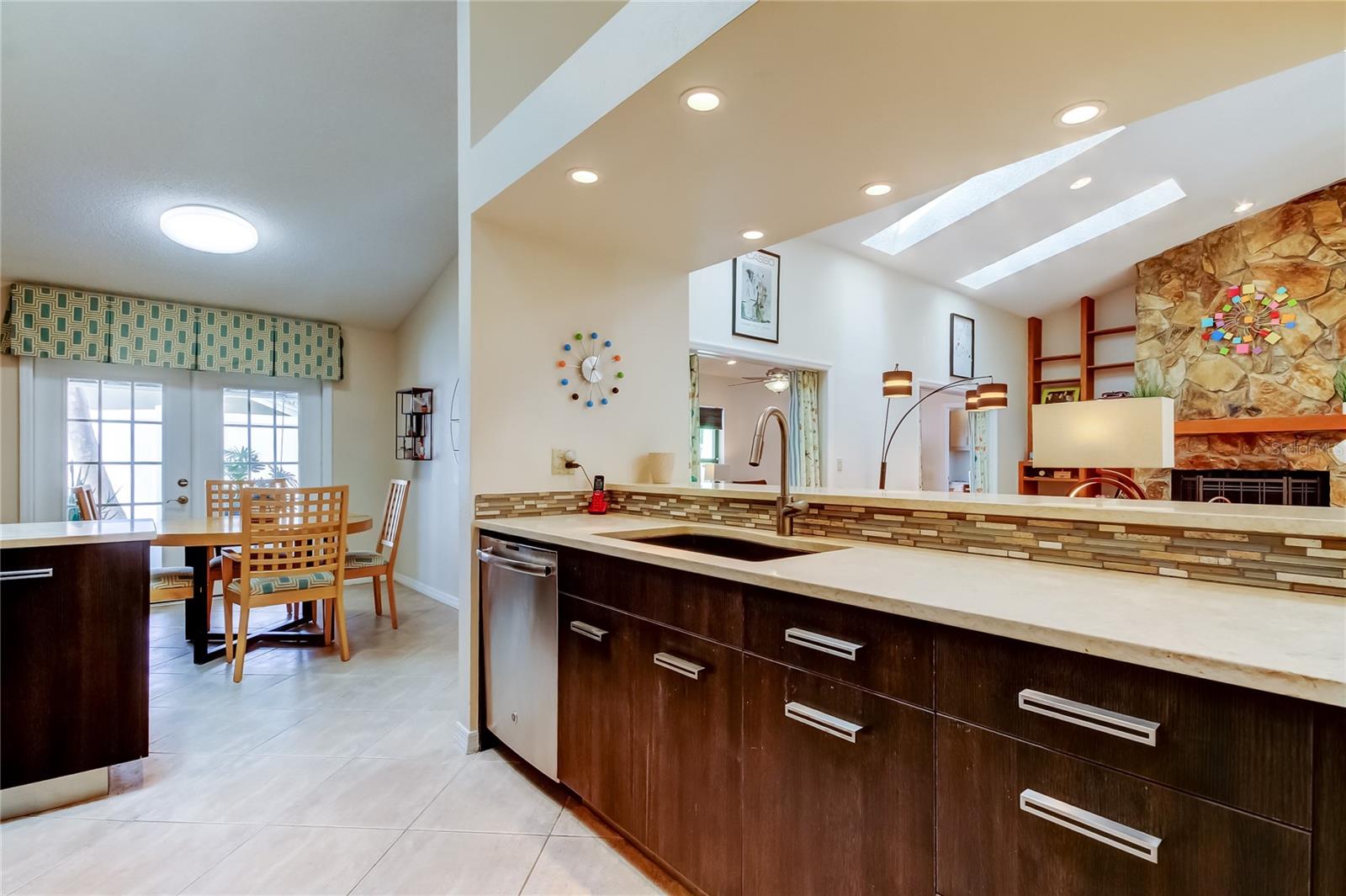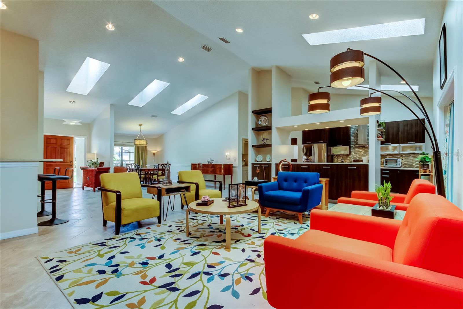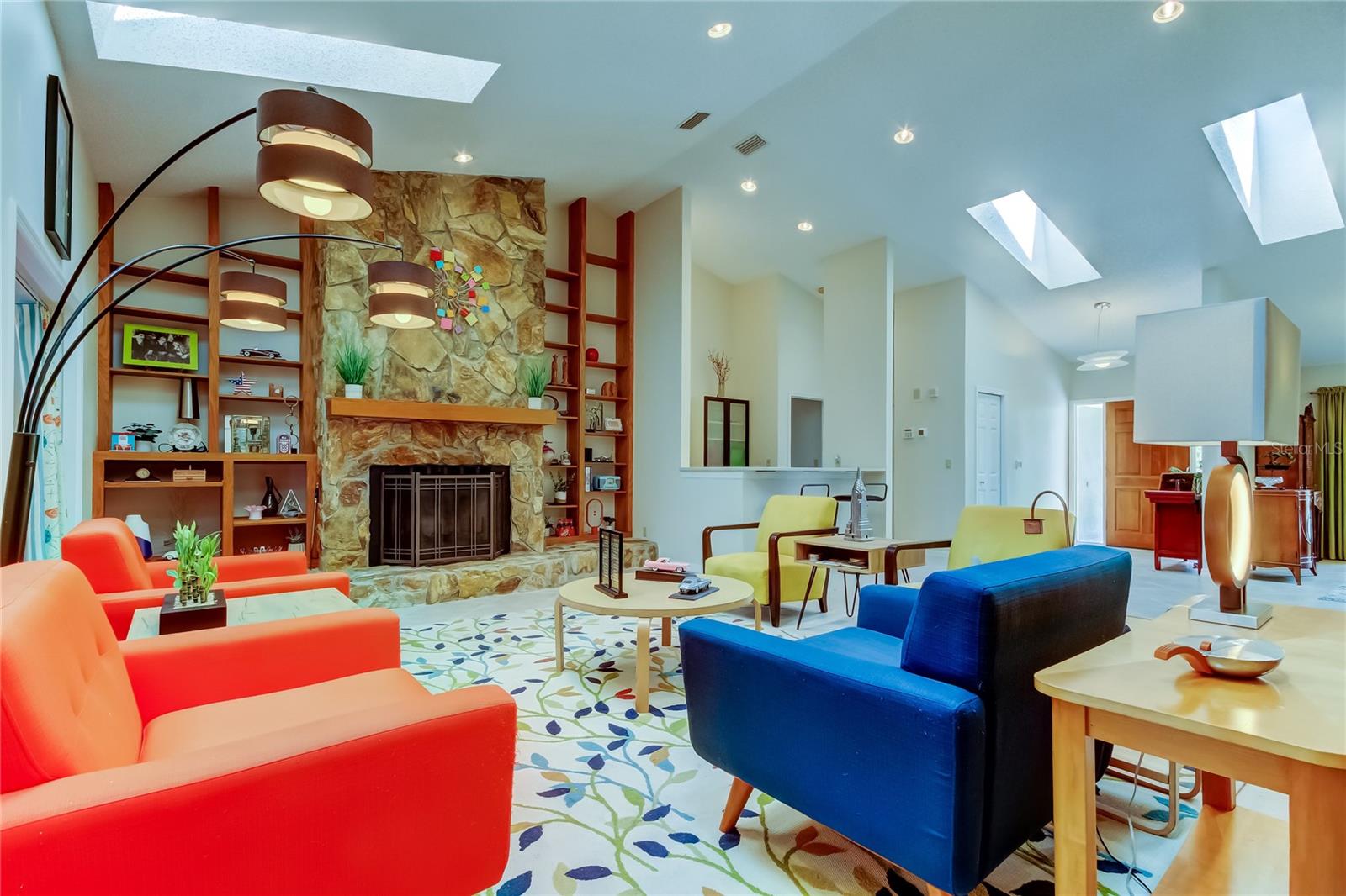 Under contract-accepting backup offers. Welcome to this beautifully maintained 4 bedroom, 2.5 bath home with an office/nursery in the highly desirable golf cart friendly community of Huntington Trails. One of the larger homes in the neighborhood, it features a flexible split-bedroom layout with expansive, light-filled living areas and thoughtful updates throughout. The spacious great room with soaring ceilings, skylights and large wood burning fireplace flows seamlessly into the dining area and built-in bar with wine refrigerator, creating the ultimate setting for entertaining. The updated kitchen is designed for both style and function, offering sleek cabinetry, quartz countertops, gas stove, and two pantries. An adjoining eat-in space opens through French doors to the screened patio and includes additional cabinets and countertop space—perfect for a coffee bar or serving station. Three independent AC systems (2 installed in 2025, the 3rd one in 2020) provide year-round efficiency and comfort. All bathrooms have been beautifully updated. The primary suite easily accommodates large furnishings and boasts a walk-in closet with custom built-ins, along with a spa-like en suite bath featuring double sinks, jetted tub, and walk-in shower. A flexible office/nursery is located off the primary suite, providing privacy and convenience. The oversized third bedroom with walk-in closet and adjoining bath with a large walk-in shower makes an ideal teen or in-law suite. A versatile bonus room off the great room can serve as a library, media lounge, or playroom. Outdoor living shines with both a screened patio and an open-air patio for dining or relaxation. The yard is low-maintenance and fully fenced on three sides, offering both privacy and peace of mind. Additional features include a tankless water heater, water softener, hurricane garage door and newer roof (2018) for peace of mind. Just minutes from Main Street Safety Harbor, you can walk, bike, or ride your golf cart to shops, restaurants, waterfront parks, and lively festivals. Marshall Street Park—with trails, tennis, pickleball, and a playground—is a short walk away, while Tampa International Airport, Clearwater Beach, and Honeymoon Island are all easily accessible