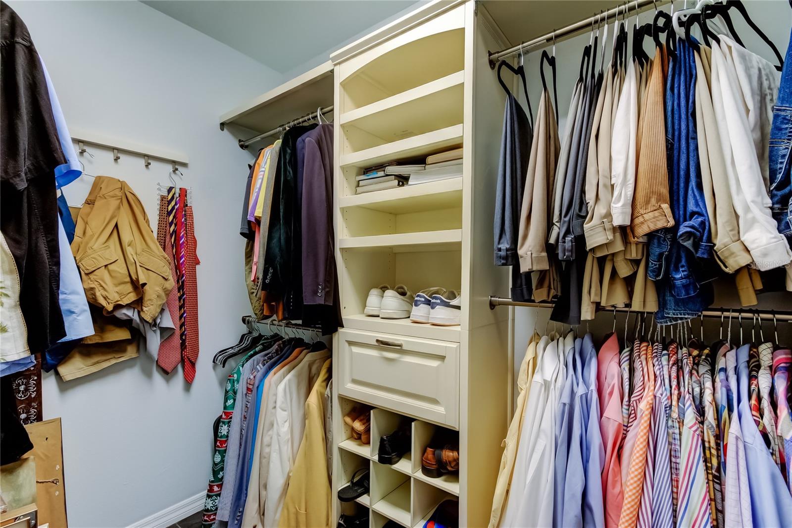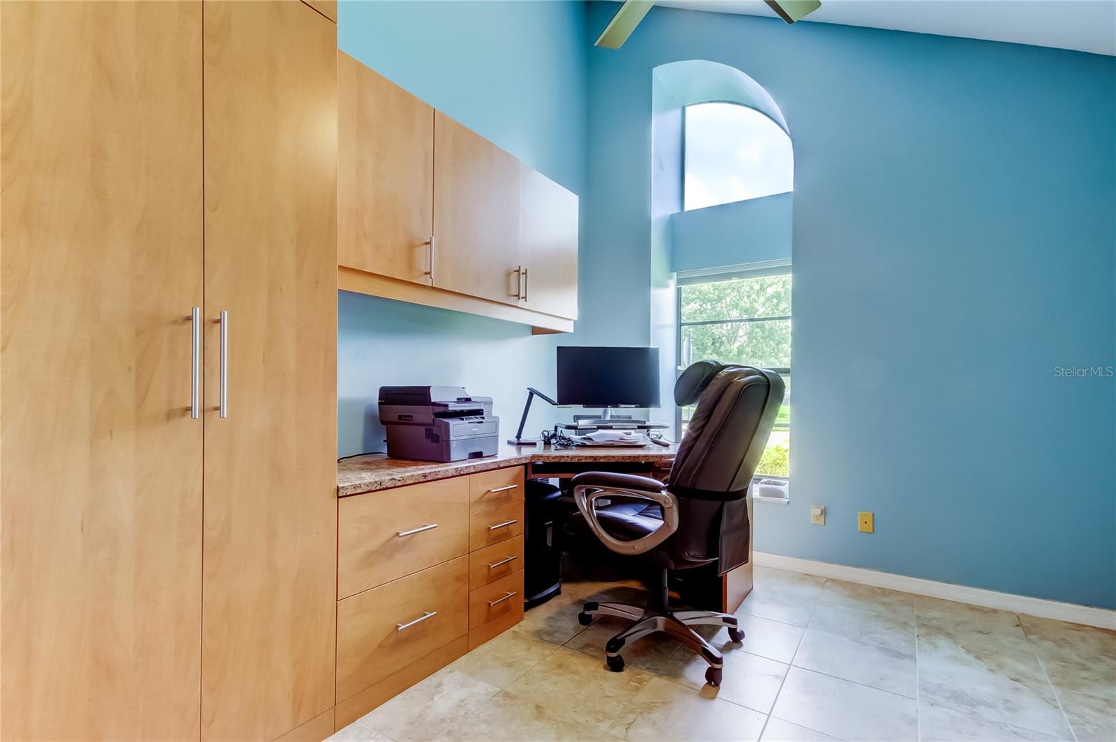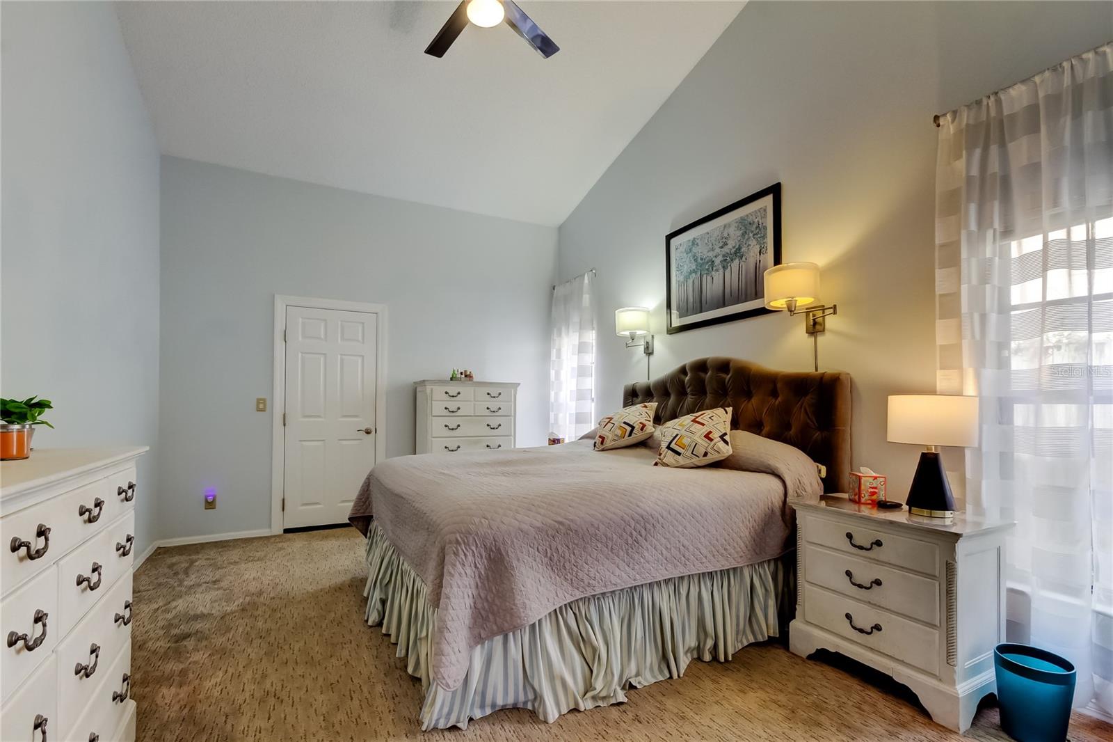 Built-in Features, Ceiling Fans(s), Eat-in Kitchen, High Ceilings, Open Floorplan, Primary Bedroom Main Floor, Solid Surface Counters, Solid Wood Cabinets, Split Bedroom, Thermostat, Vaulted Ceiling(s), Walk-In Closet(s), Window Treatments