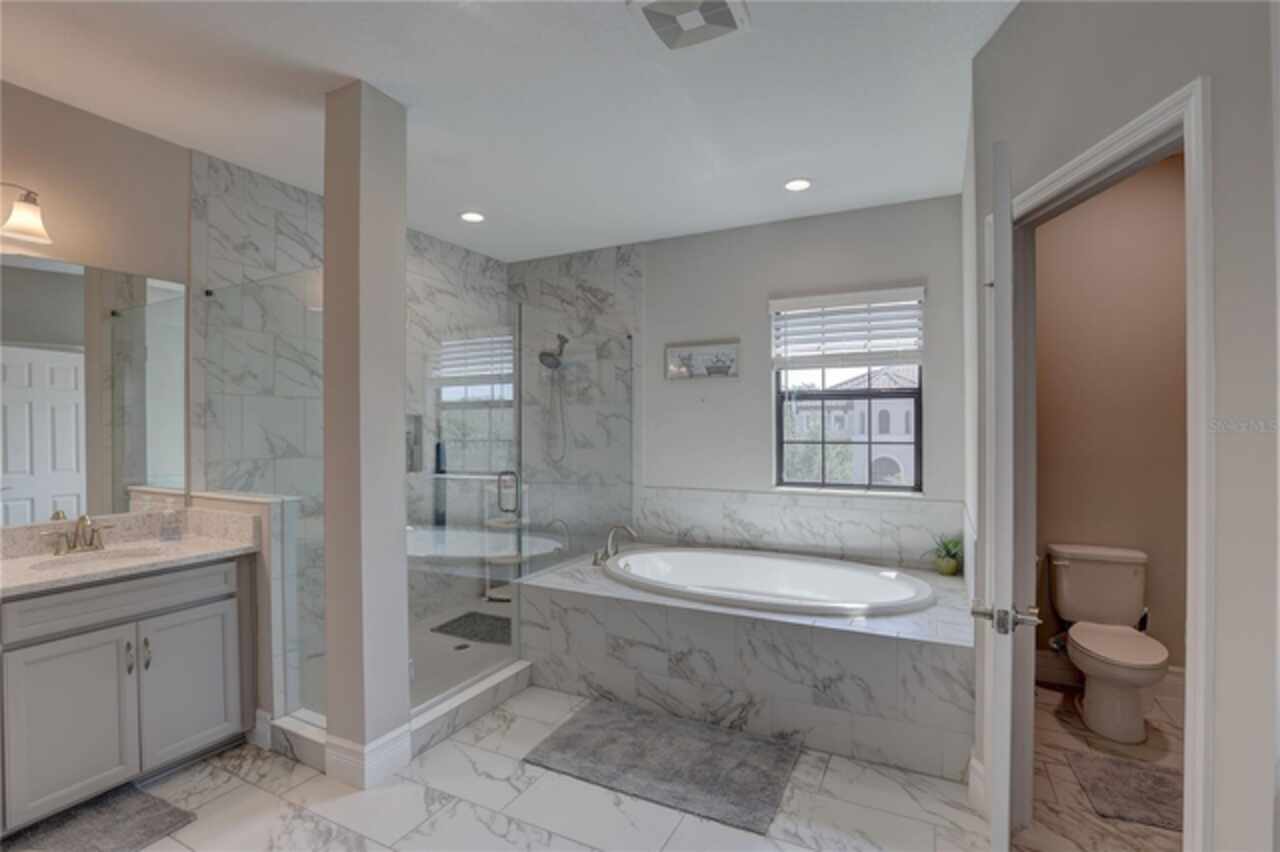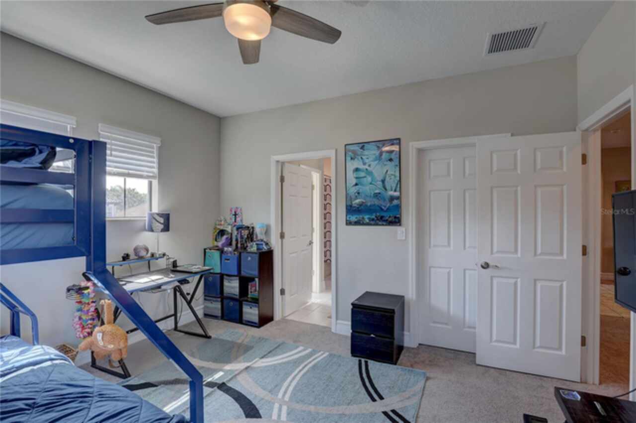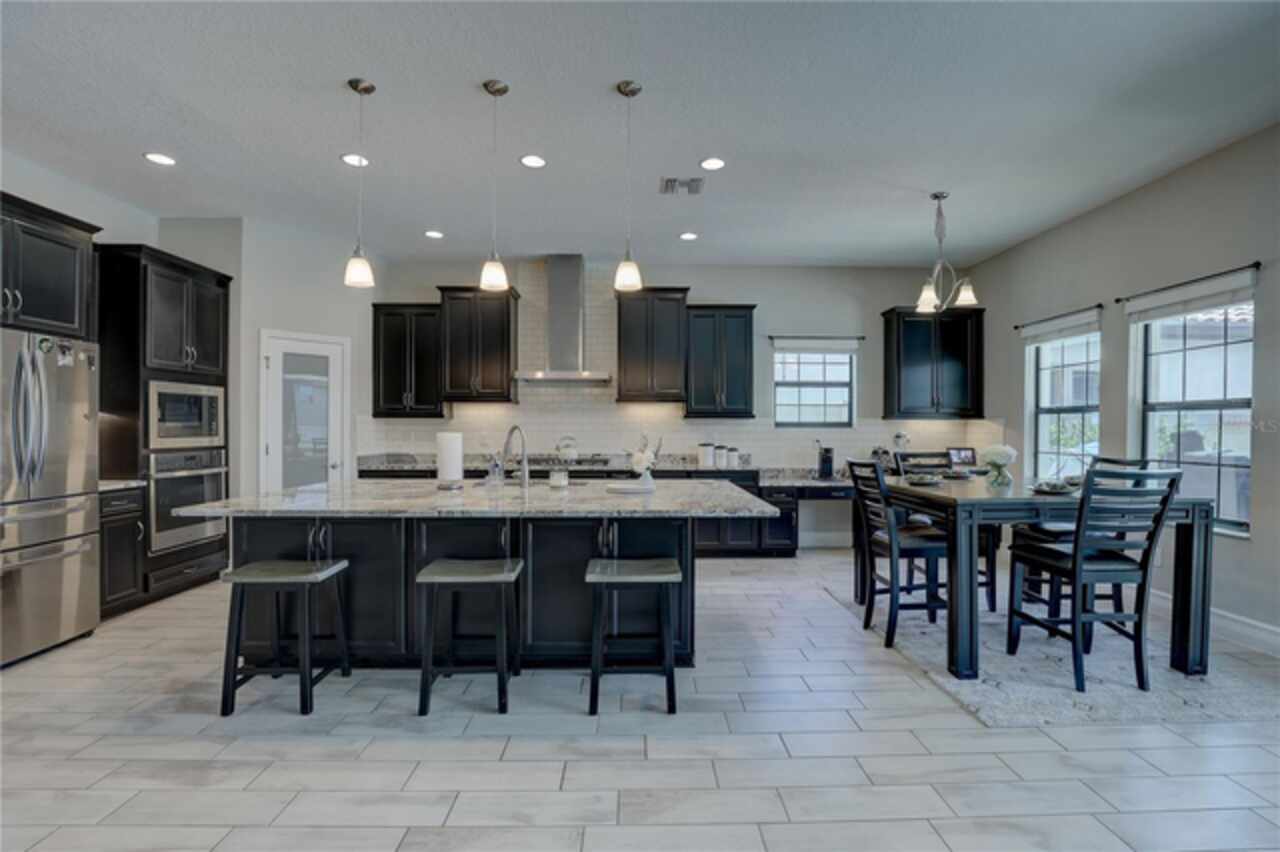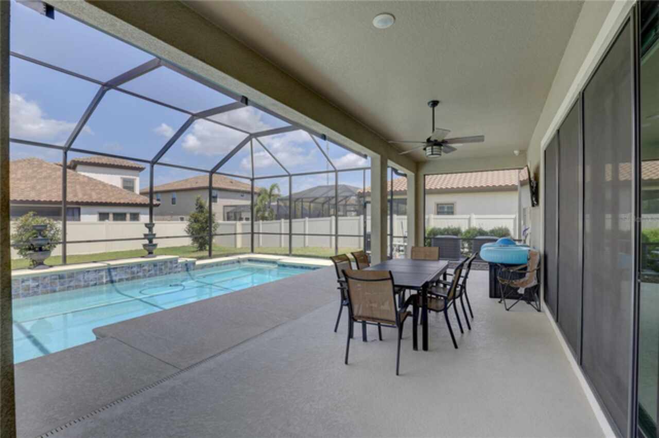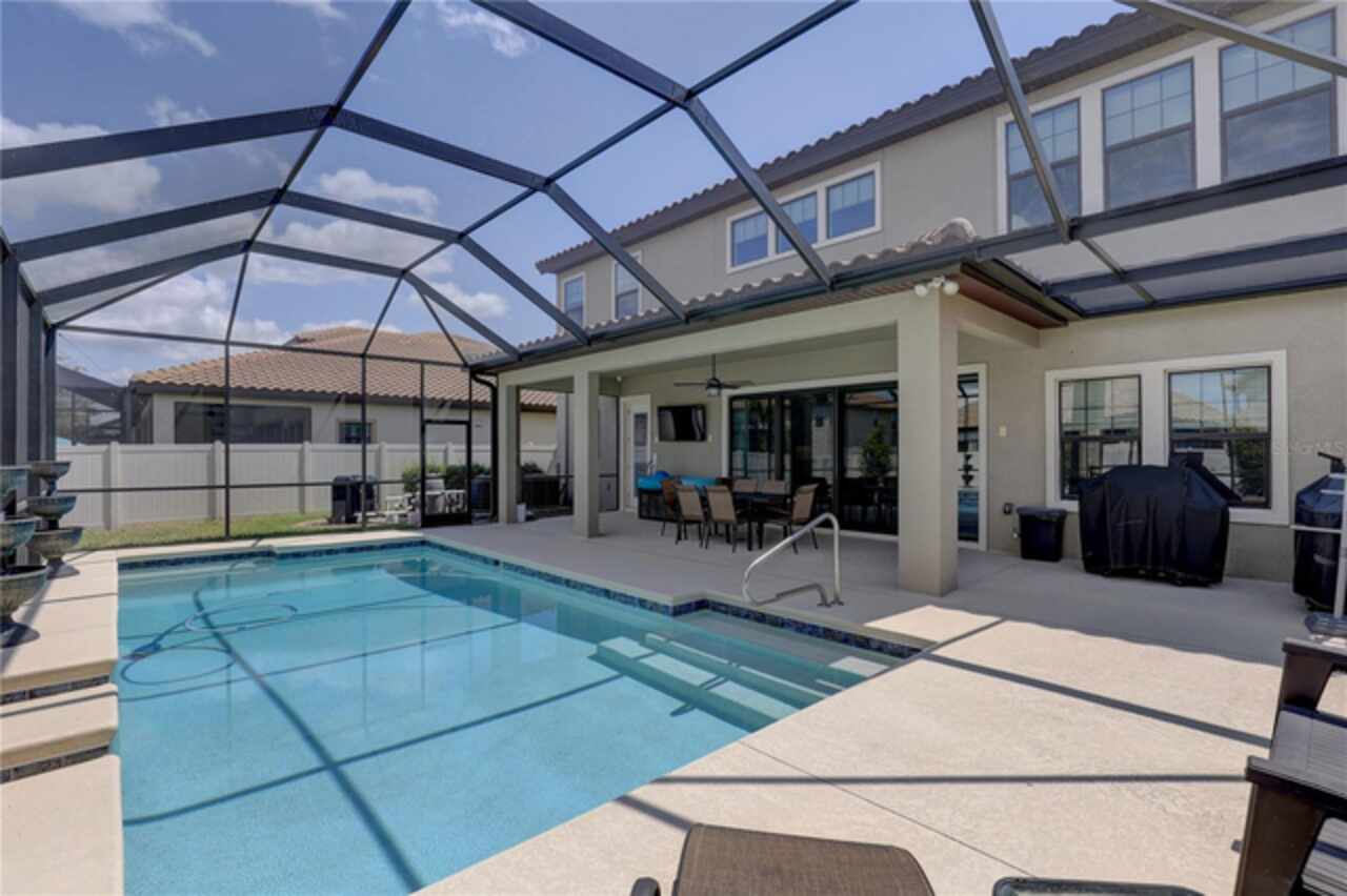 One or more photo(s) has been virtually staged. No overpricing here—this 5-bedroom WestBay Verona is listed at its recent appraised value and features a heated saltwater pool, loft, and luxury upgrades throughout. Offering over 3, 500 sq ft of thoughtfully designed living space, this stunning Verona model blends elegance, comfort, and everyday functionality inside a quiet gated community. Curb appeal shines with a stone-and-stucco exterior, wood accents, and a classic tile roof. Inside, soaring ceilings and an open-concept layout bring in beautiful natural light and highlight the home’s upscale finishes. The extended chef’s kitchen is a standout feature, complete with solid wood cabinetry (including added storage beneath the oversized island), stone countertops, built-in oven, gas cooktop, and premium stainless-steel appliances. The kitchen opens seamlessly into the spacious family room, enhanced with ceiling-mounted surround sound—perfect for entertaining or relaxing at home. A full bedroom and bathroom on the main floor create an ideal setup for guests or multi-generational living. Upstairs, the luxurious primary suite offers a large walk-in closet and spa-inspired bath featuring a soaking tub, walk-in shower, and floor-to-ceiling tile. Additional upstairs bedrooms are generously sized, and each bathroom reflects high-quality finishes and thoughtful design. The large upstairs loft provides a flexible space—ideal for a game room, second living area, home gym, or creative studio. Upstairs laundry adds convenience to daily life. Step outside to true Florida living. The screened, heated saltwater pool, tile deck, and covered patio create a private retreat designed for both relaxation and entertainment. Outdoor surround sound extends the experience, making this the perfect spot for gatherings, BBQs, and weekend pool days. The fully fenced backyard adds privacy and peace of mind. Additional Features Include: Laminate, ceramic tile, and plush carpet flooring Ceiling fans throughout Energy-efficient climate control In-wall pest control system Smart home security features Natural gas utilities 3-car garage Fully fenced backyard Located in a well-maintained gated community close to top-rated schools, shopping, dining, and commuter routes, this home offers the ideal blend of luxury, practicality, and location. Homes with this size, layout, and pool package rarely come available—schedule your private showing today.