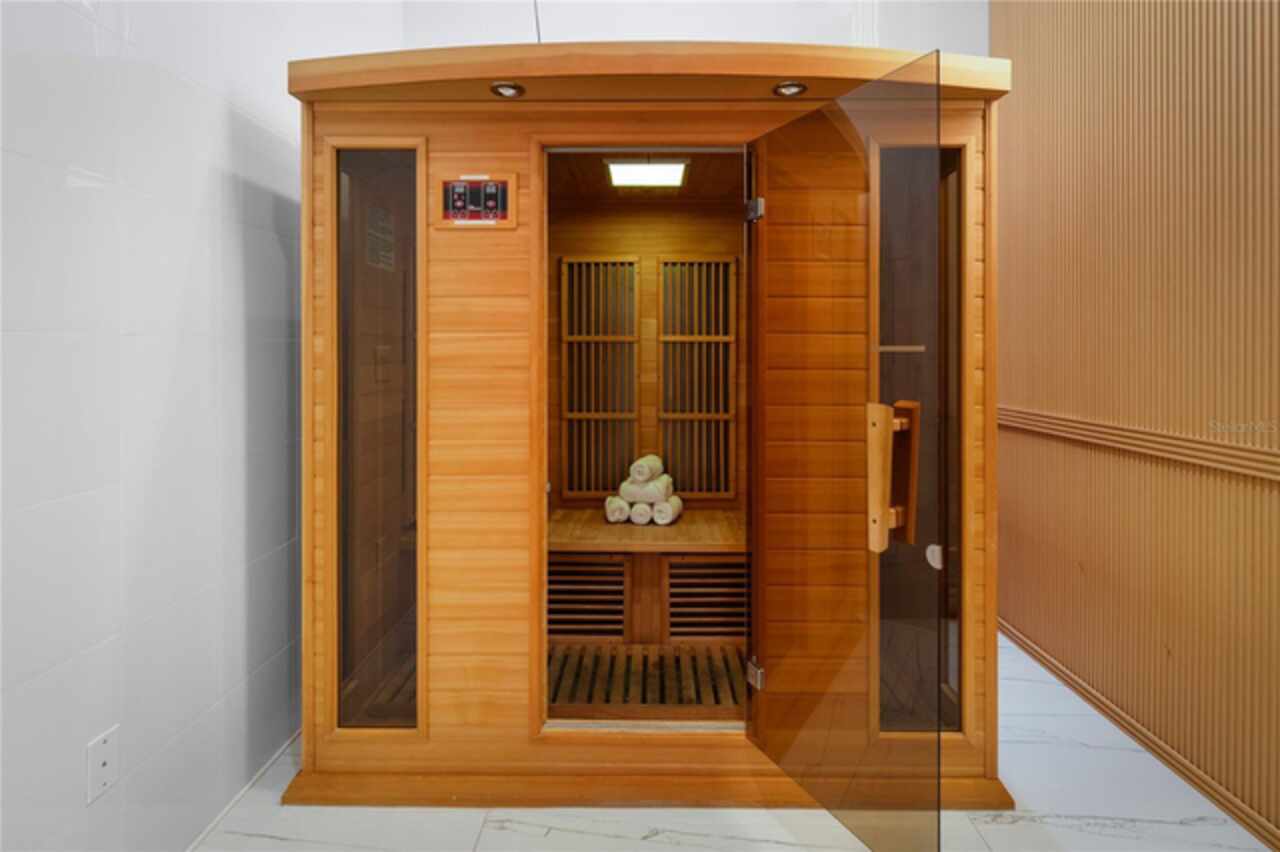 Built-in Features, Ceiling Fans(s), Coffered Ceiling(s), Crown Molding, Elevator, High Ceilings, In Wall Pest System, Kitchen/Family Room Combo, Open Floorplan, Primary Bedroom Main Floor, Sauna, Solid Wood Cabinets, Stone Counters, Thermostat, Tray Ceiling(s), Walk-In Closet(s), Wet Bar, Window Treatments