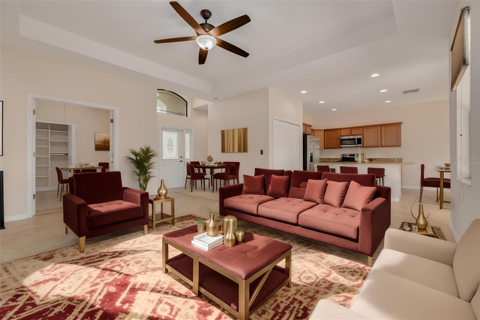 Built-in Features, Cathedral Ceiling(s), Ceiling Fans(s), Crown Molding, Eat-in Kitchen, High Ceilings, Kitchen/Family Room Combo, Open Floorplan, Primary Bedroom Main Floor, Solid Wood Cabinets, Split Bedroom, Stone Counters, Thermostat, Tray Ceiling(s), Vaulted Ceiling(s), Walk-In Closet(s), Window Treatments