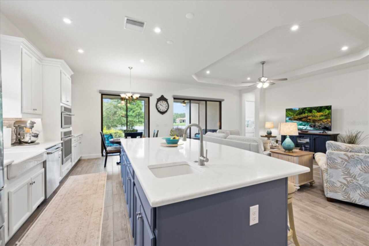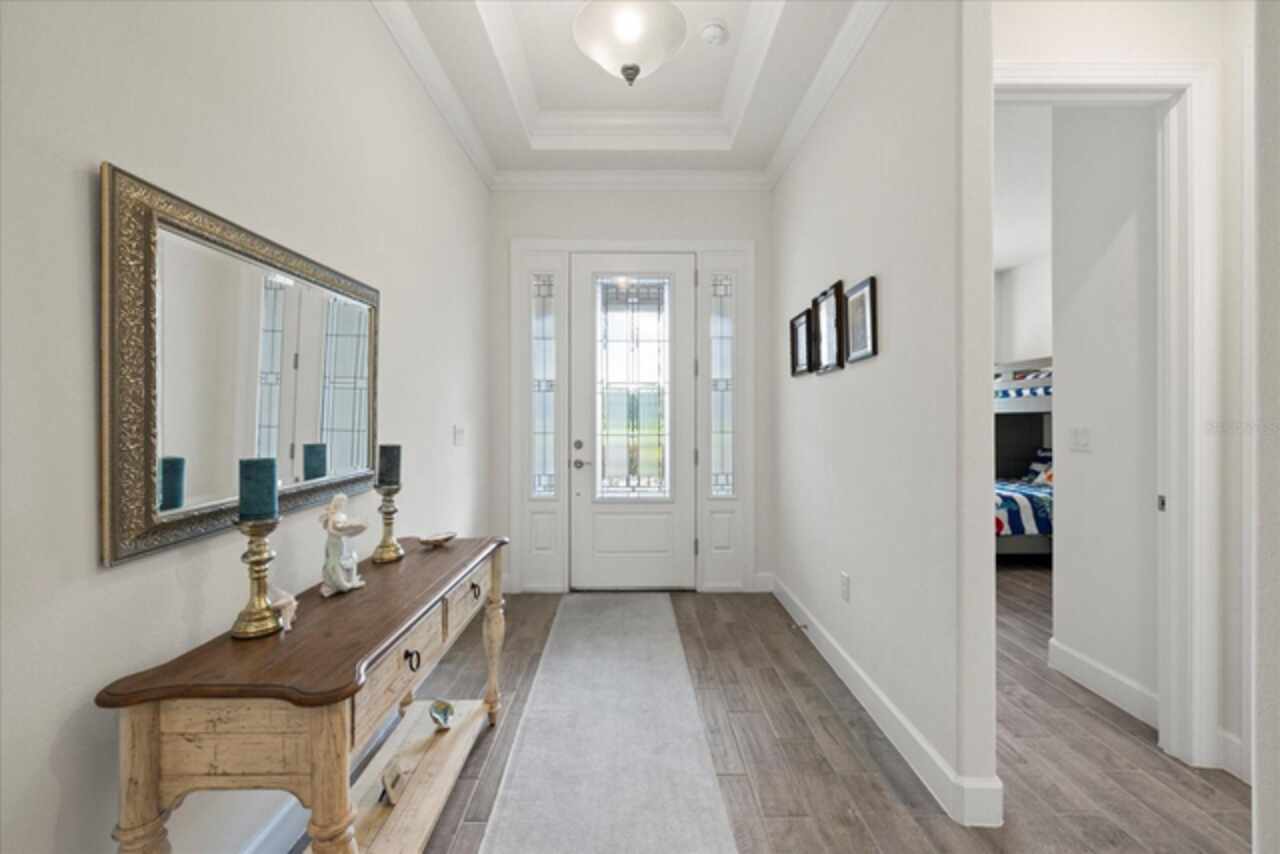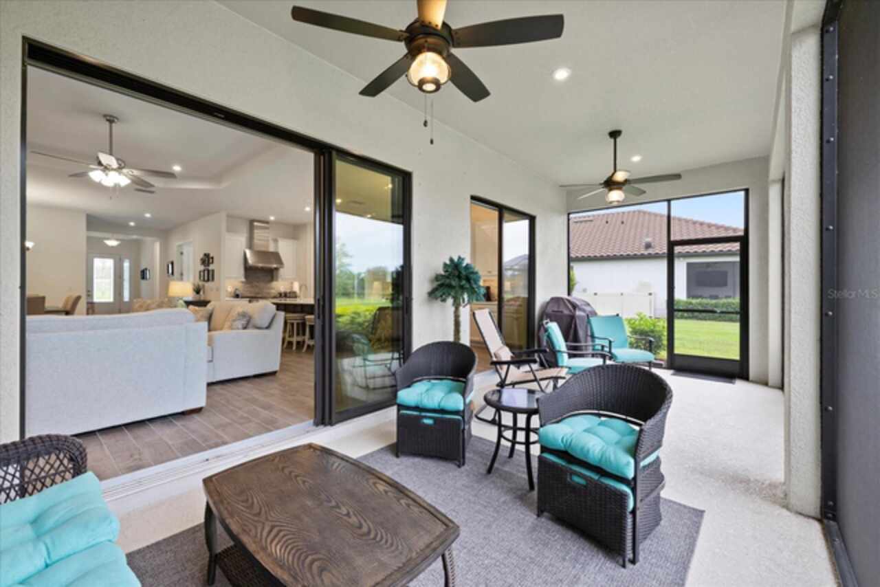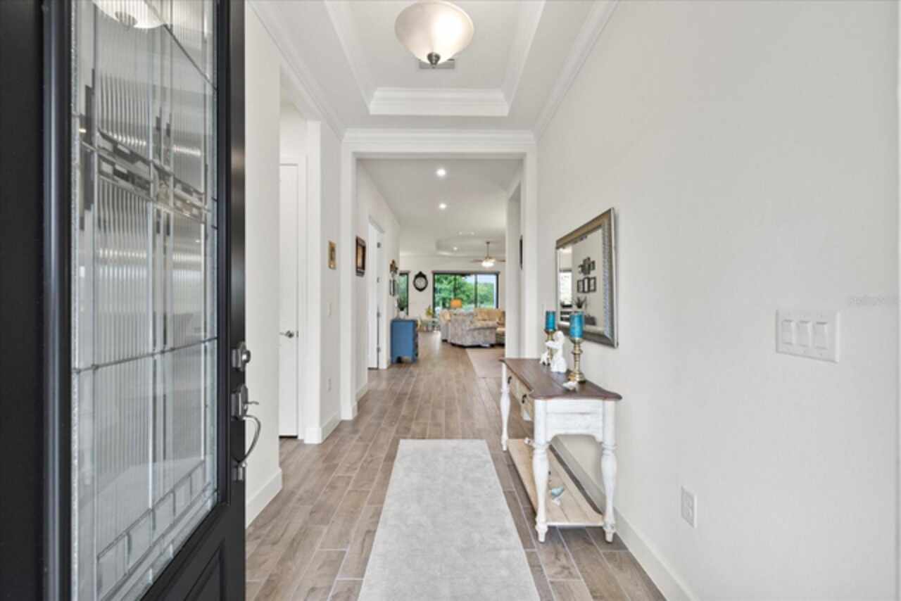 Welcome to this stunning custom-built 3BR/3BA + office home in the highly sought-after Esplanade at Starkey Ranch! Built in 2021, this immaculate residence offers a spacious open floor plan with 10’ ceilings, 8’ solid wood doors, upgraded tile flooring, and designer lighting throughout. The gourmet kitchen boasts quartz countertops, a Monogram appliance package ($10, 000 upgrade), microwave/convection oven combo, farmhouse sink, large island with prep sink and knee wall cabinetry—ideal for entertaining. Enjoy flexibility with a dedicated office/craft room that can easily function as a 4th bedroom, and unwind in the luxurious primary suite featuring a sitting area with water views of the pond, custom closet shelving, and spa-style bath with dual rain shower heads. Smart-home ready with pre-wired internet, cable, central floor outlets, and pendant lighting options. Step outside to your screened lanai overlooking a premium water view lot—already pre-plumbed and pre-wired for a future pool. Additional upgrades include motorized with remote control shades on sliding doors out to lanai, hurricane shutters, a hurricane-rated front door and window, aluminum gutters, tandem garage, and a pre-wired smart-home package. Located in a vibrant, amenity-rich gated community close to parks, trails, and top-rated schools—this home truly has it all! Monthly HOA fee covers: Plant and tree replacement, landscaping, lawn care, sprinkler system, trash pickup, PLUS common areas, pool and amenity center.
