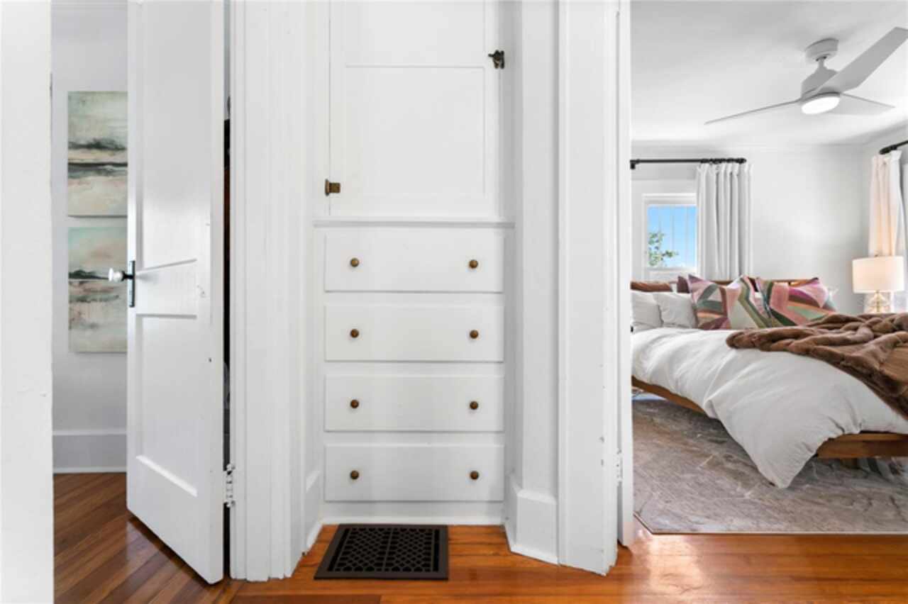 Built-in Features, Ceiling Fans(s), Crown Molding, PrimaryBedroom Upstairs, Solid Surface Counters, Solid Wood Cabinets, Stone Counters, Thermostat, Walk-In Closet(s), Window Treatments