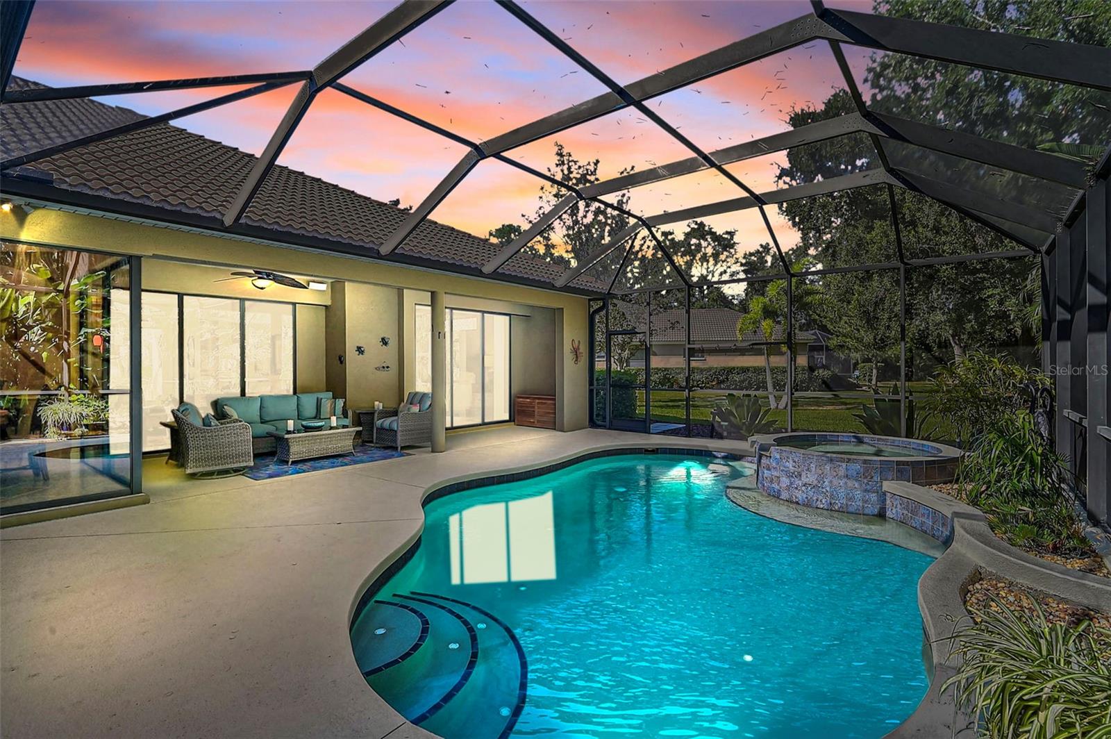 Experience Florida living at its finest in this exceptional Lee Wetherington 4-bedroom, 3-bath executive home plus office, complete with a 3-car garage and set on a private preserve lot in the coveted Savannah Lakes section of River Wilderness Golf & Country Club. Meticulously maintained and beautifully upgraded, this residence blends timeless elegance with modern comfort. The open-concept layout showcases upscale finishes throughout, including 10” crown molding, tray ceilings, Plantation shutters, rich hardwood floors, granite countertops, and stainless steel appliances. The gourmet kitchen flows effortlessly into the living and dining spaces—perfect for everyday living or entertaining guests. Step outside and enjoy your own private oasis. The expansive lanai features a heated pool and spa, a custom-built outdoor kitchen with a Memphis wood pellet grill, live-edge bar, and granite countertops, and a West Coast custom awning for shaded comfort. Recent enhancements include new pool equipment, heater, and filter system (2021–2025), no-see-um re-screening, updated lanai surface and lighting, and upgraded outdoor landscape and accent lighting to set the perfect evening ambiance. Inside, thoughtful improvements continue with a new refrigerator (2022), dishwasher (2021), upgraded lighting fixtures throughout, and custom tile and shelving in the primary bath shower. Discover refined living where comfort, style, and quality craftsmanship come together in one of Parrish’s most desirable communities. River Wilderness offers a lifestyle of comfort and security with a 24-hour manned guard gate, community boat ramp on the Manatee River, and optional memberships for Golf, Tennis, Athletic, and Social activities—all without mandatory fees. With the Ft. Hamer Bridge providing easy access to Lakewood Ranch, you’ll enjoy the best of both privacy and convenience. This home is move-in ready and waiting for its next owner to enjoy all that River Wilderness has to offer.