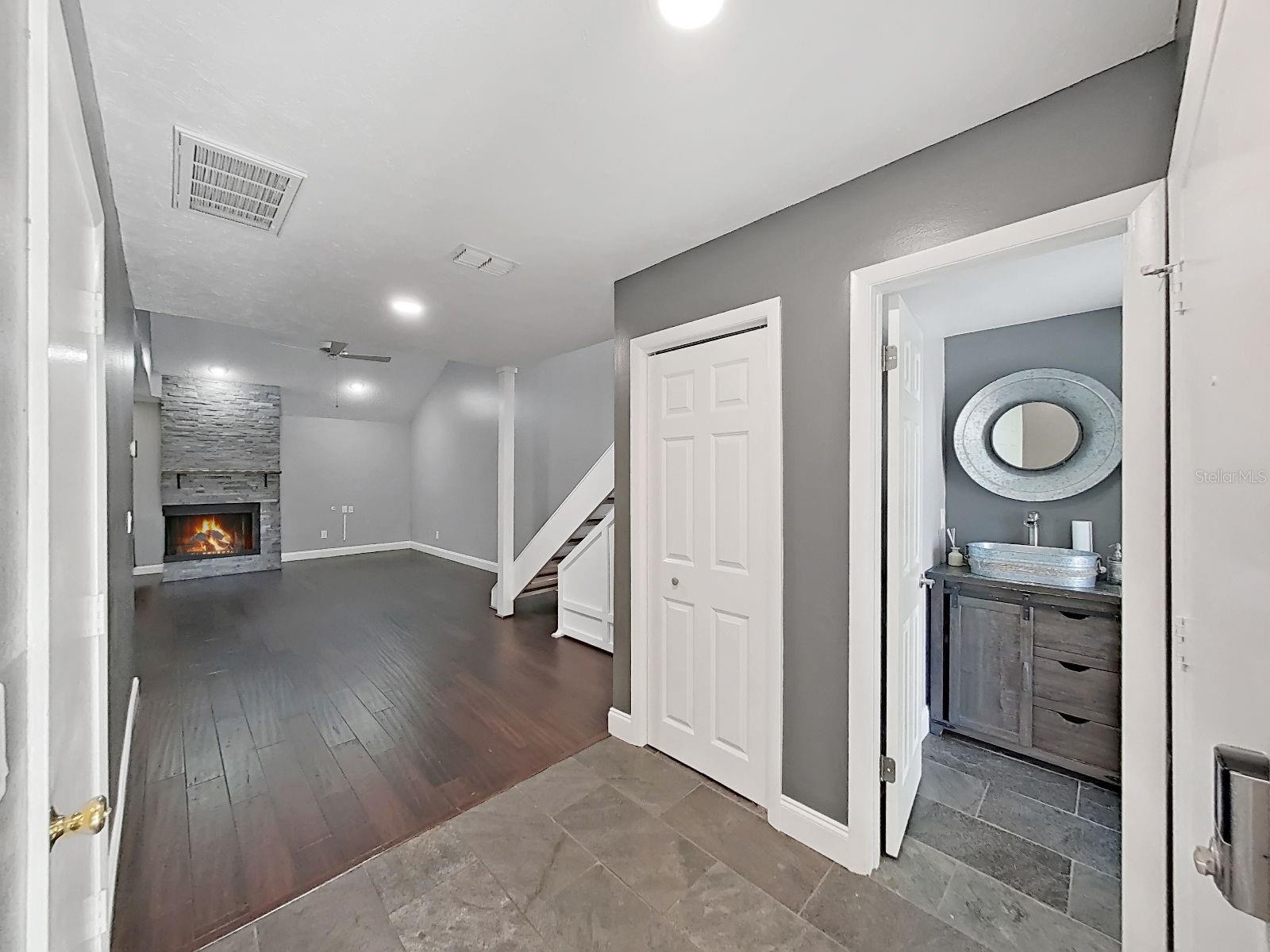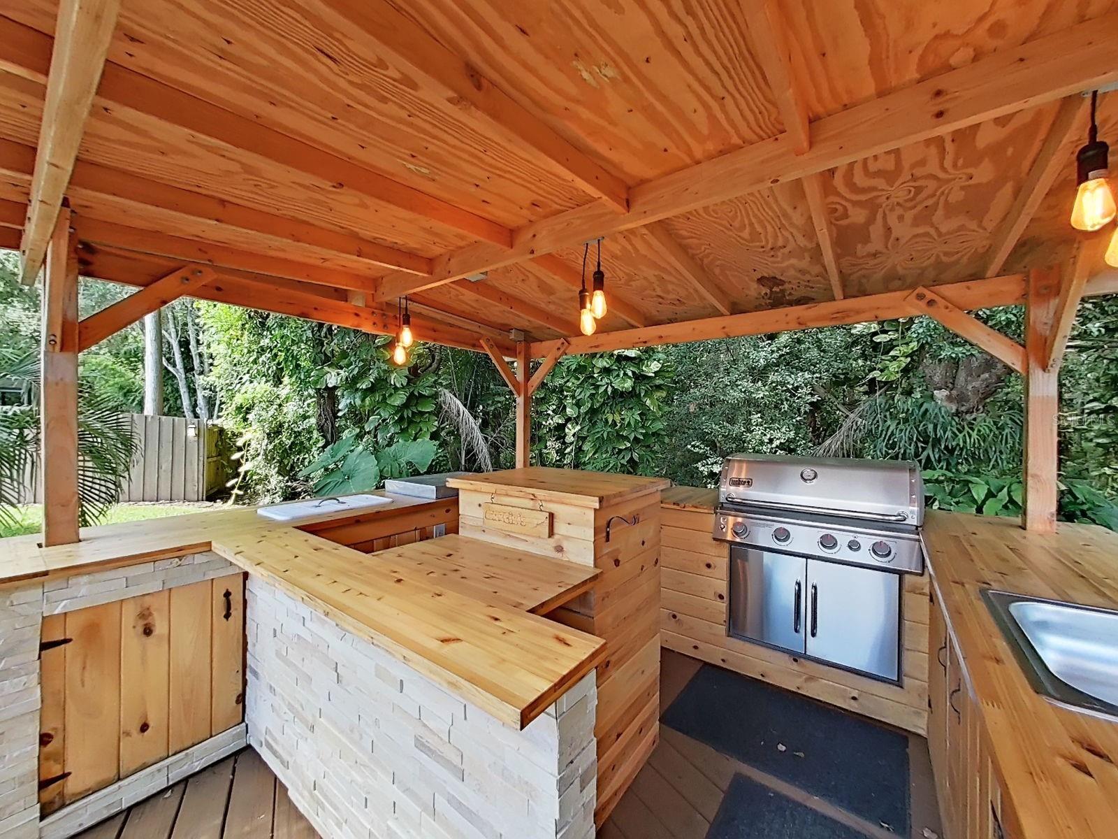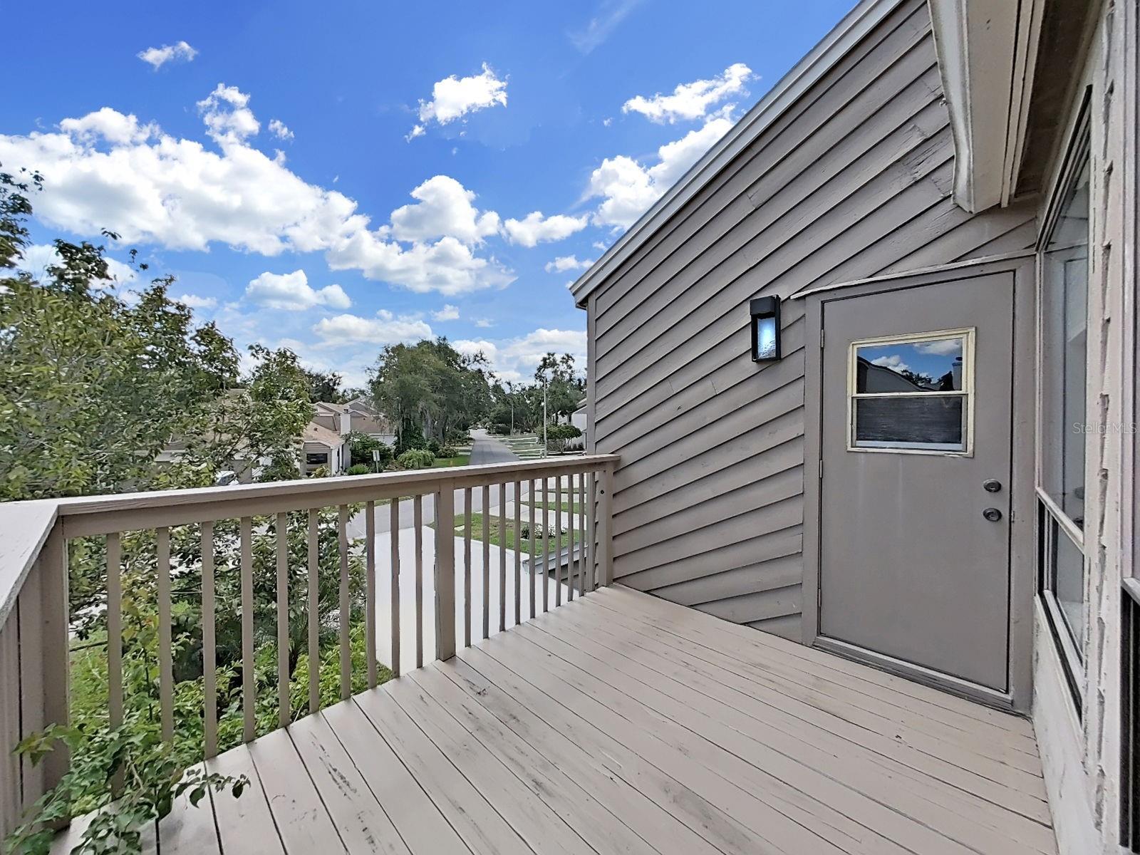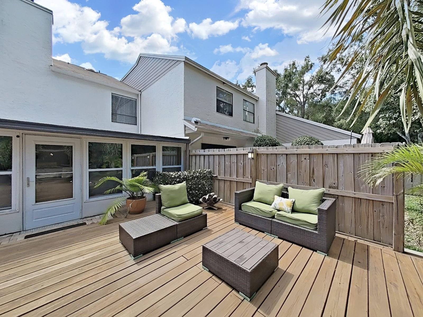 One-of-a-Kind Modern Townhome with Stunning Outdoor Oasis. Discover this completely updated and move-in-ready 2-bedroom, 2-bath townhome with loft, game room, and 1-car garage, perfectly situated in the desirable Galleria Townhome community. Nestled on a quiet conservation lot with no rear neighbors, this home offers exceptional privacy and beautiful wooded views The open floor plan features soaring ceilings, transom windows, a modern stone fireplace, fresh paint, and designer finishes throughout. The kitchen is a chef’s delight with stainless-steel appliances, a state-of-the-art French door refrigerator, a large pantry, and opens to dining area with Sliding glass doors that lead to the enclosed 384-sq-ft porch, currently set up as a game room with its own A/C unit—perfect for entertaining year-round. Upstairs, you’ll find 2 spacious en-suite bedrooms and a versatile loft ideal for an office, media, or den. The primary suite impresses with a dual-sink vanity, large walk-in closet, and private balcony. Step outside to your outdoor paradise to a 762-sq-ft wood deck designed for ultimate Florida living. Enjoy multiple seating areas surrounded by palm trees and ambient outdoor lighting. The fully equipped outdoor kitchen cabana features built-in gas burners, grill, flat grill, ice cooler, sink, and a bar area—all beneath a unique retractable roof with integrated lighting and electrical hookups. This exceptional property combines modern updates, flexible living spaces, and resort-style outdoor amenities—all in a prime central location. This unique property will not last long. Schedule your tour today.