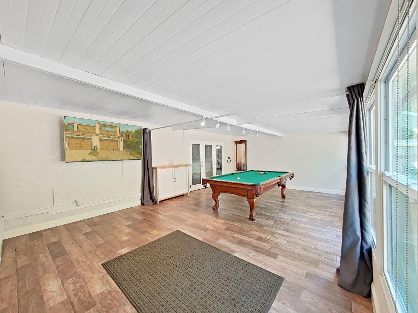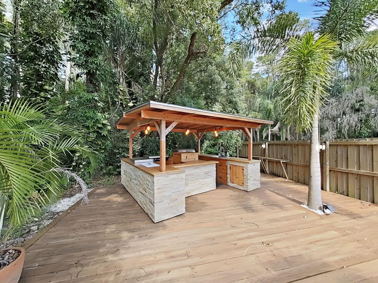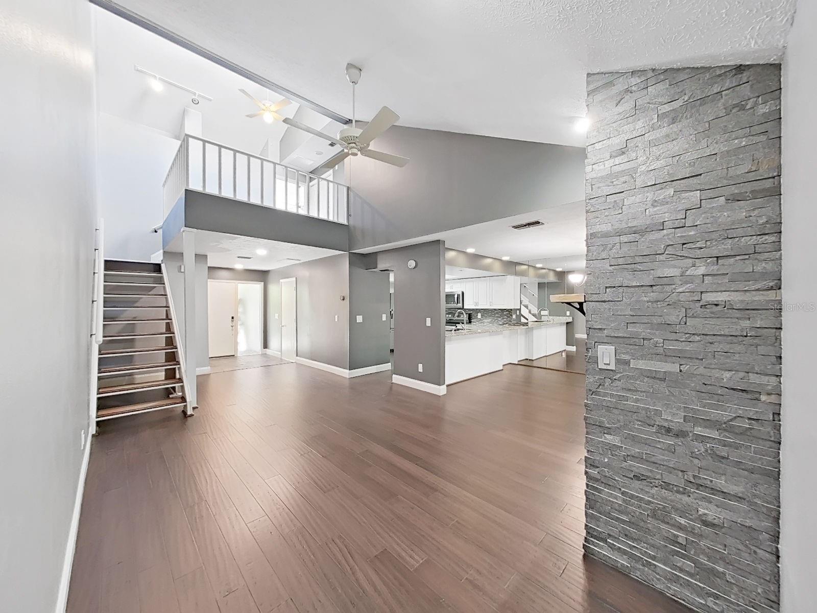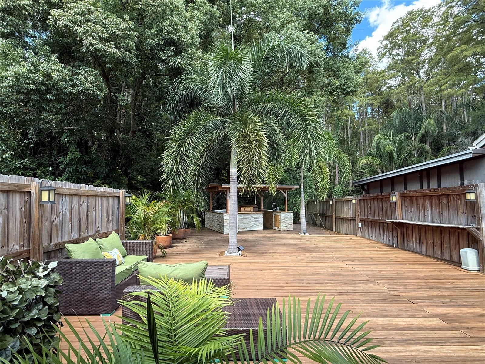 One-of-a-Kind Modern Townhome with Stunning Outdoor Oasis. Discover this completely updated and move-in-ready 2-bedroom, 2-bath townhome with loft, game room, and 1-car garage, perfectly situated in the desirable Galleria Townhome community. Nestled on a quiet conservation lot with no rear neighbors, this home offers exceptional privacy and beautiful wooded views The open floor plan features soaring ceilings, transom windows, a modern stone fireplace, fresh paint, and designer finishes throughout. The kitchen is a chef’s delight with stainless-steel appliances, a state-of-the-art French door refrigerator, a large pantry, and opens to dining area with Sliding glass doors that lead to the enclosed 384-sq-ft porch, currently set up as a game room with its own A/C unit—perfect for entertaining year-round. Upstairs, you’ll find 2 spacious en-suite bedrooms and a versatile loft ideal for an office, media, or den. The primary suite impresses with a dual-sink vanity, large walk-in closet, and private balcony. Step outside to your outdoor paradise to a 762-sq-ft wood deck designed for ultimate Florida living. Enjoy multiple seating areas surrounded by palm trees and ambient outdoor lighting. The fully equipped outdoor kitchen cabana features built-in gas burners, grill, flat grill, ice cooler, sink, and a bar area—all beneath a unique retractable roof with integrated lighting and electrical hookups. This exceptional property combines modern updates, flexible living spaces, and resort-style outdoor amenities—all in a prime central location. This unique property will not last long. Schedule your tour today.