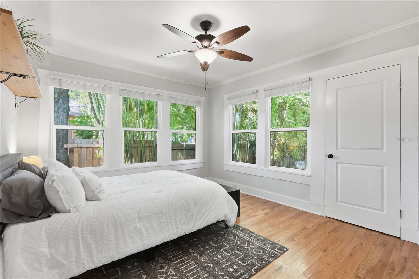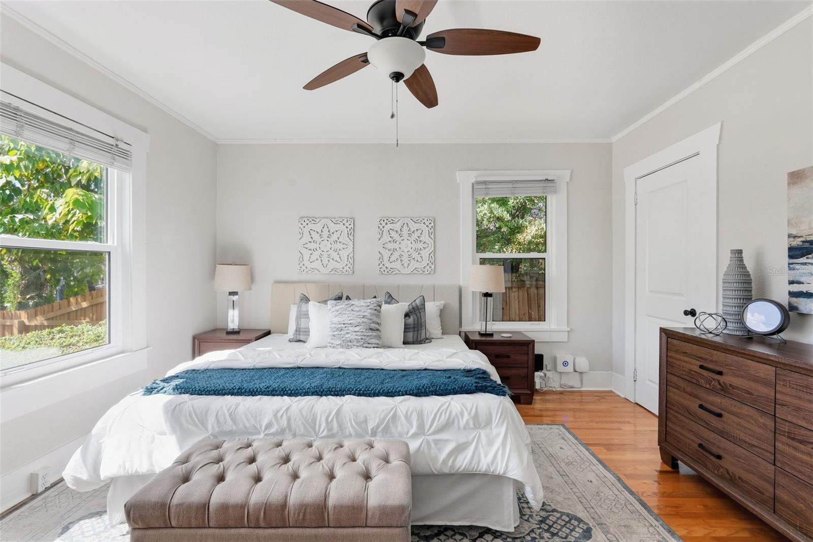 Ceiling Fans(s), Chair Rail, Crown Molding, Primary Bedroom Main Floor, Stone Counters, Window Treatments