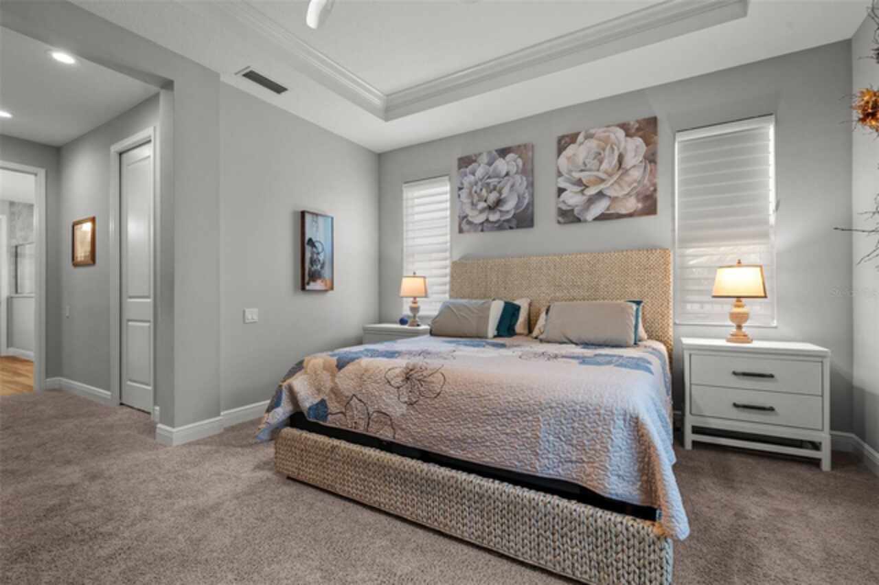Ceiling Fans(s), Coffered Ceiling(s), Crown Molding, Eat-in Kitchen, High Ceilings, In Wall Pest System, Kitchen/Family Room Combo, Open Floorplan, Primary Bedroom Main Floor, Solid Wood Cabinets, Stone Counters, Thermostat, Tray Ceiling(s), Walk-In Closet(s), Window Treatments