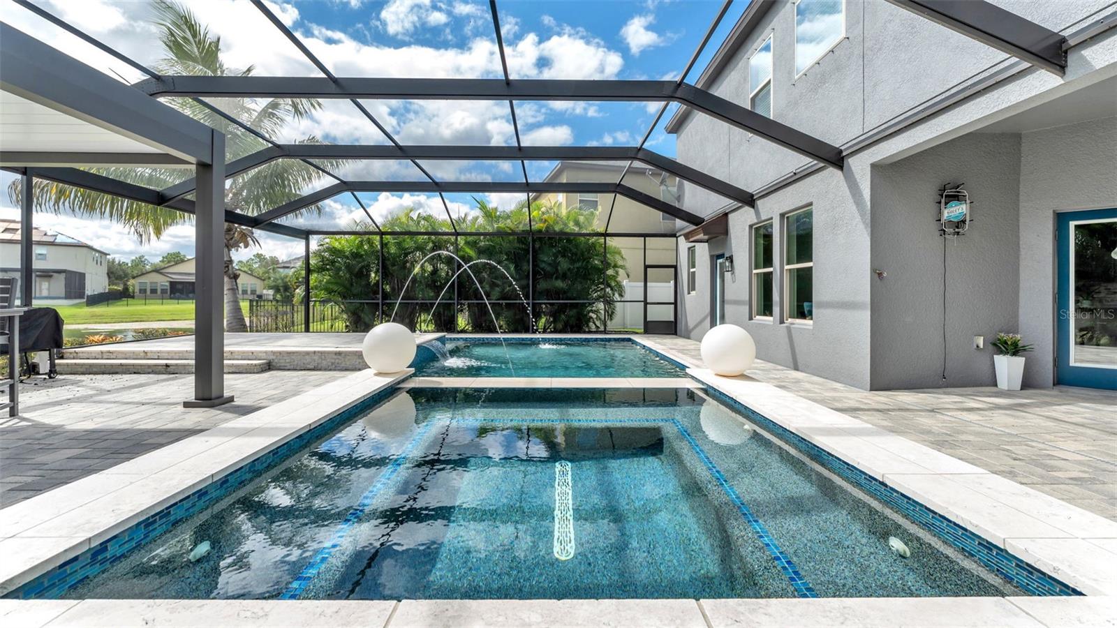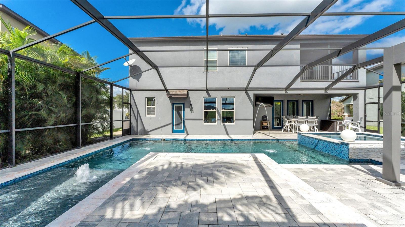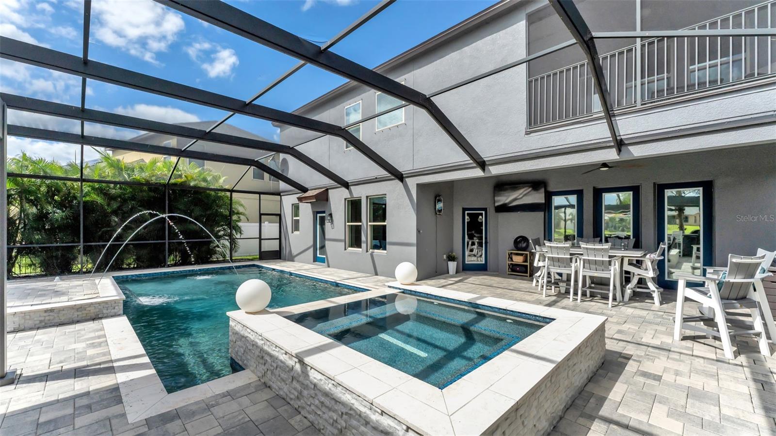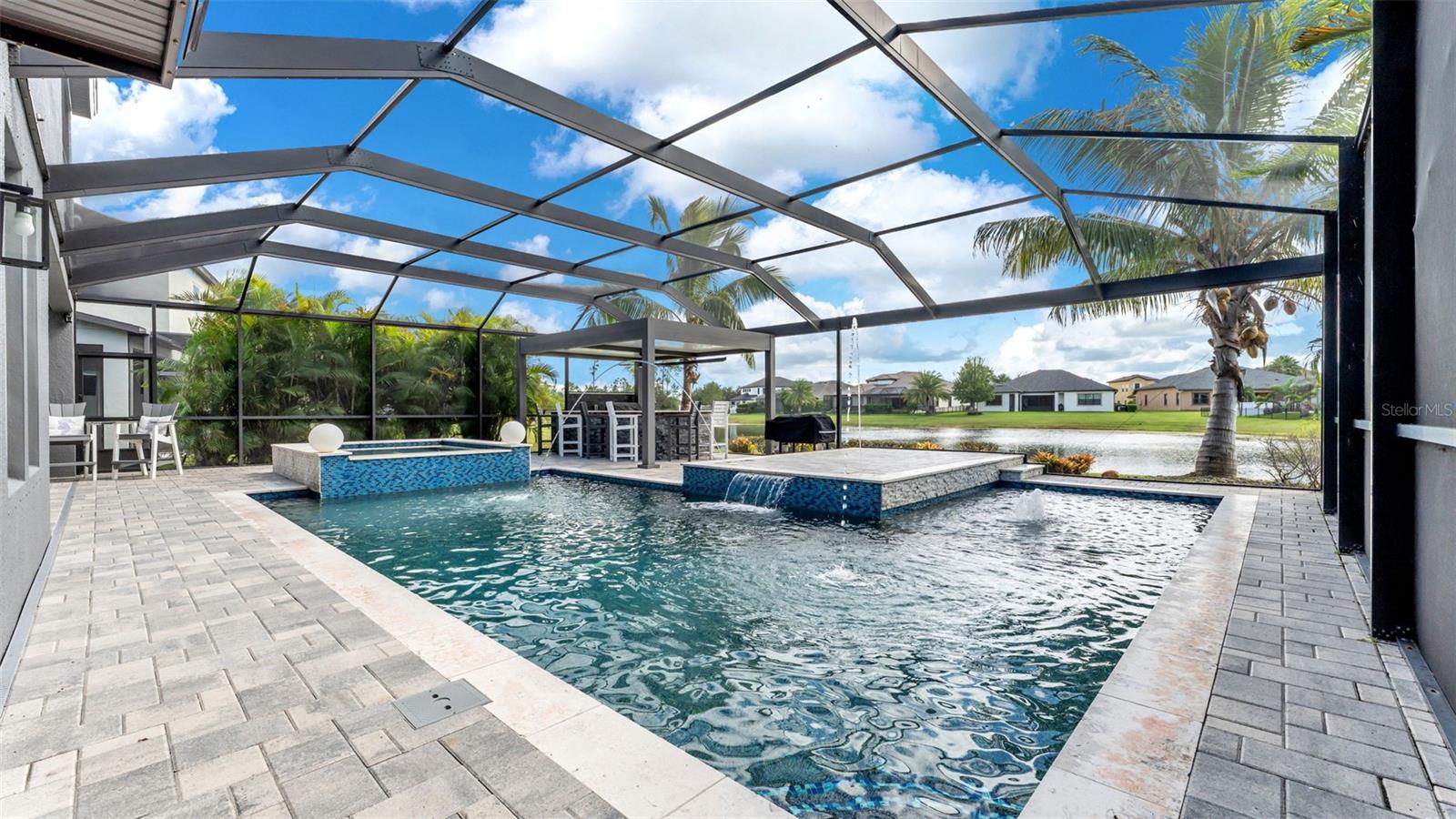 Welcome to this extraordinary residence in the highly sought-after, gated community of WATERLEAF, where luxury living meets resort-style comfort. From the moment you enter the grand two-story foyer with a drop-down chandelier, custom wainscoting, and an elegant wooden staircase, you’ll feel the sophistication that flows throughout the home. The open-concept design seamlessly connects the expansive great room, formal dining area, and gourmet kitchen, creating an ideal setting for both entertaining and everyday living. Designer accents include a custom mirrored feature wall in the dining room, built-in cabinetry and accent wall in the great room, a dry bar with wine refrigerator, upgraded lighting, and custom window treatments in every room, adding a refined, model-quality finish. French doors lead you to a breathtaking outdoor oasis unlike anything else in the community. The fully screened lanai showcases an oversized saltwater sport pool with shallow ends and a six-foot center, complete with waterfall, splash pad, fountain, and evening Lumineers for dramatic ambiance. A 14-person spa with dedicated heater flows into the pool, while a full outdoor kitchen—featuring a Blaze grill, refrigerator, ice maker, beverage cooler, and built-in storage—sets the stage for unforgettable gatherings. All of this is sheltered beneath an Azenco electric pergola with automated louvers, rain and wind sensors, smart-controlled lighting, ceiling fans, and multiple access points overlooking a tranquil pond. This outdoor space is larger than any other lot approved by the HOA, offering extended dimensions for unmatched entertaining potential. Inside, the luxury continues with a spacious primary suite that offers a private balcony with serene water views, a spa-like bathroom, and a generous walk-in closet. The home features five bedrooms, four full bathrooms, and a massive loft, offering flexible space Thoughtfully upgraded with a brand-new roof installed in April 2025 with a transferable warranty, 2022 A/C, spray foam insulation, insulated garage doors, two high-efficiency water heaters, Low-E3 windows, whole-home smart security and lighting, indoor-outdoor speakers, in-wall pest control, and garage ceiling storage racks, this home delivers both luxury and efficiency. Residents of Waterleaf enjoy ultra-fast WiFi and cable included, along with resort-style amenities such as a community pool, clubhouse, basketball courts, playgrounds, dog parks, and scenic walking trails. With close proximity to top-rated schools, dining, shopping, and easy access to I-75, this home offers the ultimate blend of elegance, convenience, and modern living. More than move-in ready, this property is truly unforgettable—an exceptional opportunity to own one of Waterleaf’s finest homes.