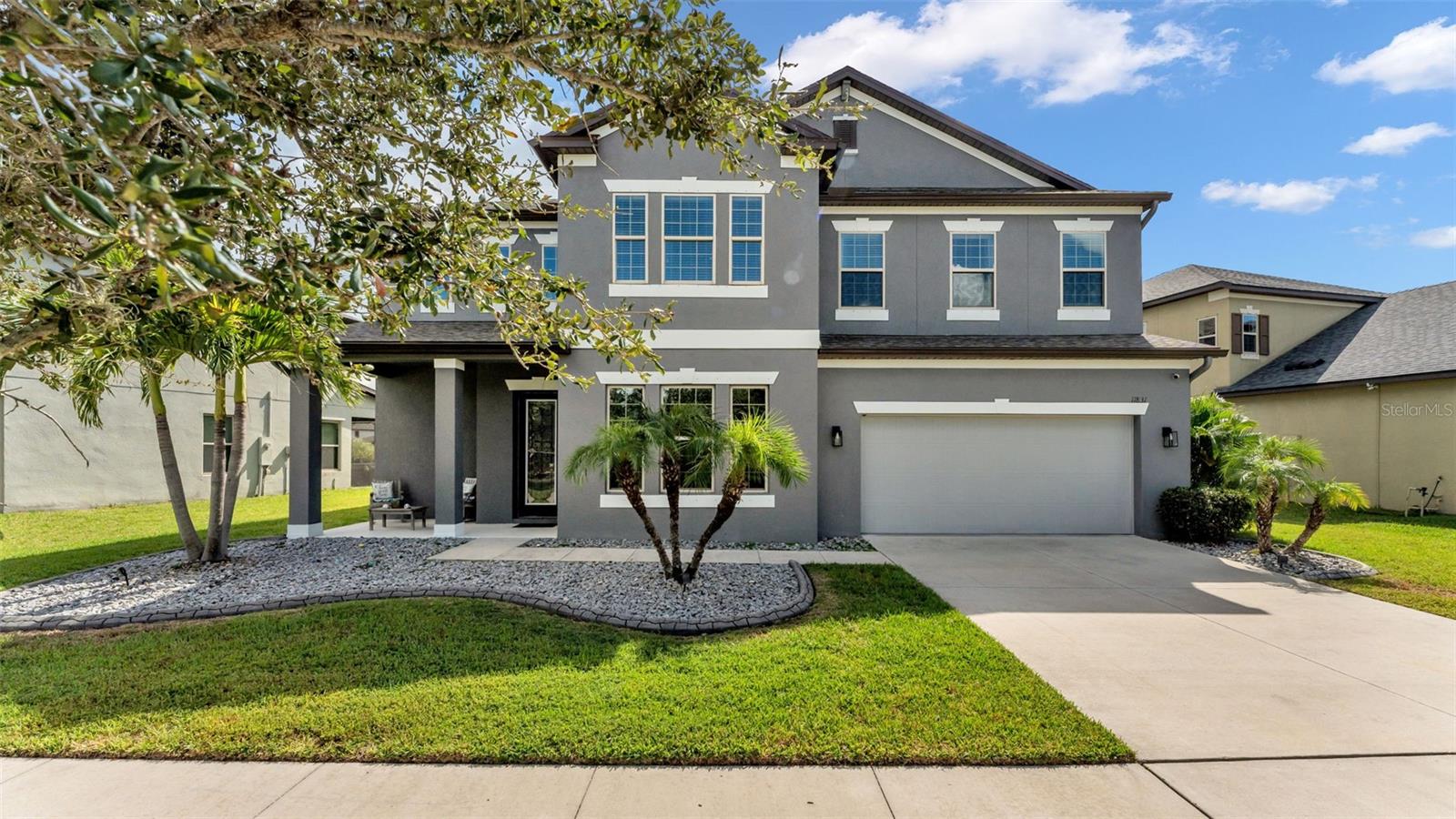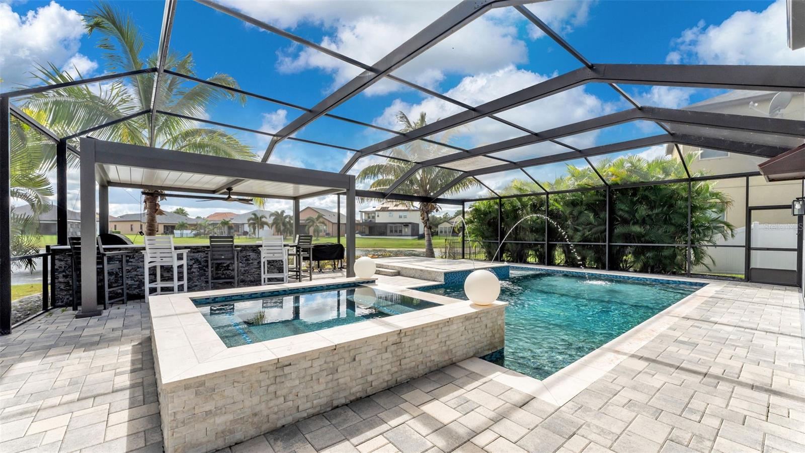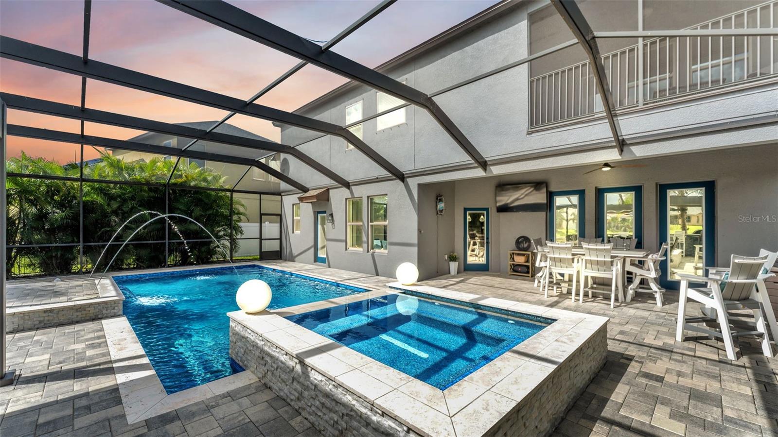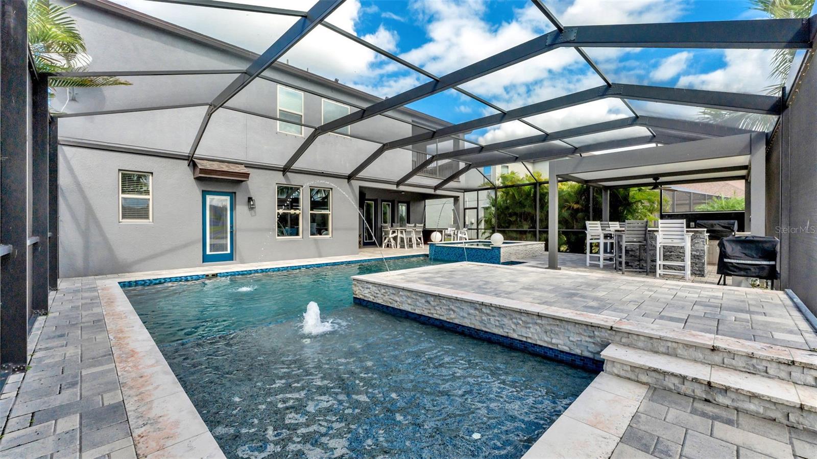 Welcome to this extraordinary residence in the highly sought-after, gated community of WATERLEAF, where luxury living meets resort-style comfort. From the moment you enter the grand two-story foyer with a drop-down chandelier, custom wainscoting, and an elegant wooden staircase, you’ll feel the sophistication that flows throughout the home. The open-concept design seamlessly connects the expansive great room, formal dining area, and gourmet kitchen, creating an ideal setting for both entertaining and everyday living. Designer accents include a custom mirrored feature wall in the dining room, built-in cabinetry and accent wall in the great room, a dry bar with wine refrigerator, upgraded lighting, and custom window treatments in every room, adding a refined, model-quality finish. French doors lead you to a breathtaking outdoor oasis unlike anything else in the community. The fully screened lanai showcases an oversized saltwater sport pool with shallow ends and a six-foot center, complete with waterfall, splash pad, fountain, and evening Lumineers for dramatic ambiance. A 14-person spa with dedicated heater flows into the pool, while a full outdoor kitchen—featuring a Blaze grill, refrigerator, ice maker, beverage cooler, and built-in storage—sets the stage for unforgettable gatherings. All of this is sheltered beneath an Azenco electric pergola with automated louvers, rain and wind sensors, smart-controlled lighting, ceiling fans, and multiple access points overlooking a tranquil pond. This outdoor space is larger than any other lot approved by the HOA, offering extended dimensions for unmatched entertaining potential. Inside, the luxury continues with a spacious primary suite that offers a private balcony with serene water views, a spa-like bathroom, and a generous walk-in closet. The home features five bedrooms, four full bathrooms, and a massive loft, offering flexible space Thoughtfully upgraded with a brand-new roof installed in April 2025 with a transferable warranty, 2022 A/C, spray foam insulation, insulated garage doors, two high-efficiency water heaters, Low-E3 windows, whole-home smart security and lighting, indoor-outdoor speakers, in-wall pest control, and garage ceiling storage racks, this home delivers both luxury and efficiency. Residents of Waterleaf enjoy ultra-fast WiFi and cable included, along with resort-style amenities such as a community pool, clubhouse, basketball courts, playgrounds, dog parks, and scenic walking trails. With close proximity to top-rated schools, dining, shopping, and easy access to I-75, this home offers the ultimate blend of elegance, convenience, and modern living. More than move-in ready, this property is truly unforgettable—an exceptional opportunity to own one of Waterleaf’s finest homes.