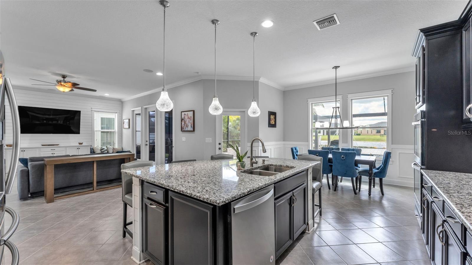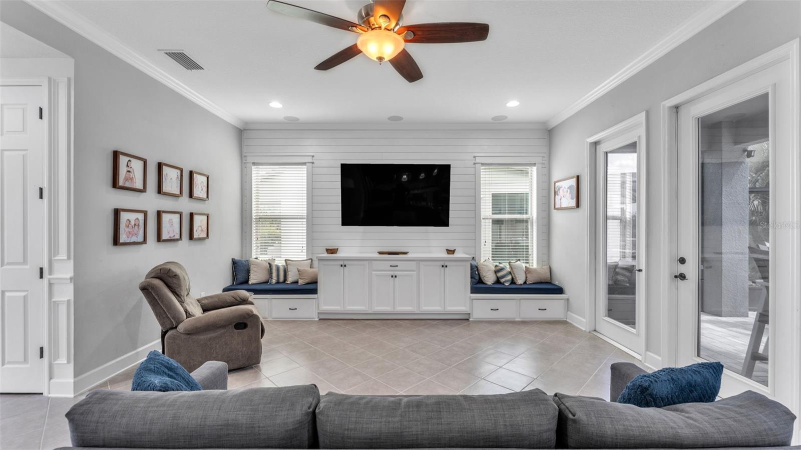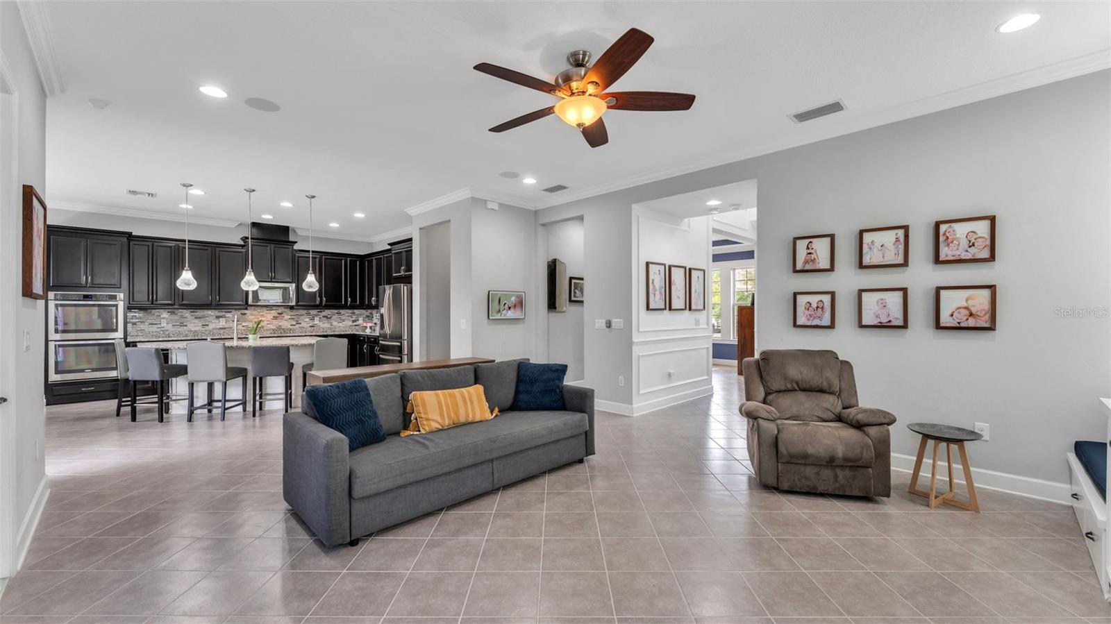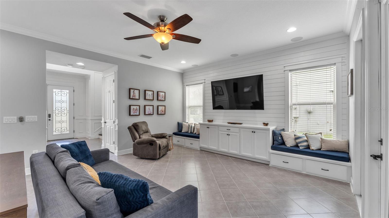 Built-in Features, Ceiling Fans(s), Crown Molding, Eat-in Kitchen, High Ceilings, In Wall Pest System, Kitchen/Family Room Combo, Open Floorplan, PrimaryBedroom Upstairs, Stone Counters, Tray Ceiling(s), Walk-In Closet(s), Window Treatments