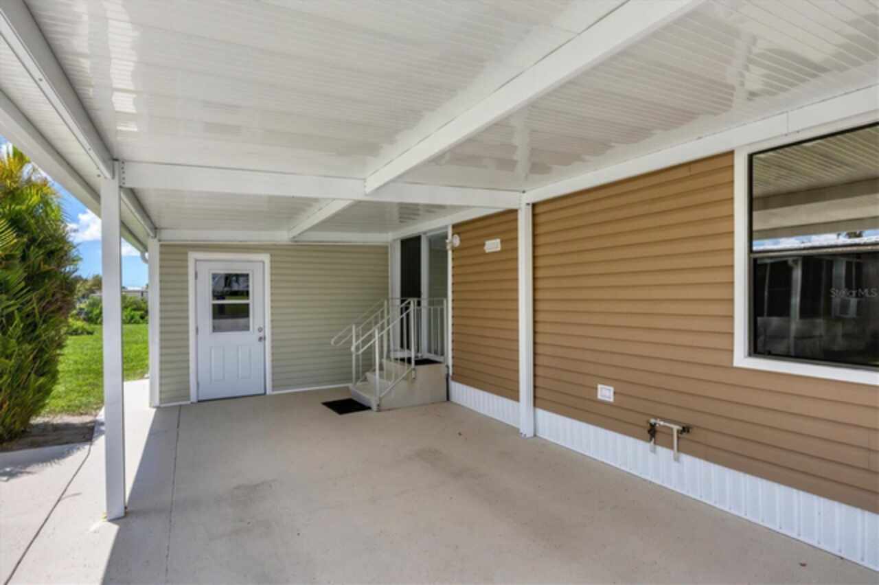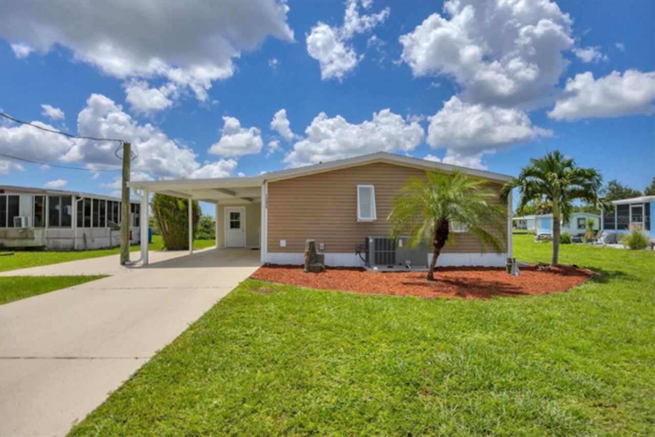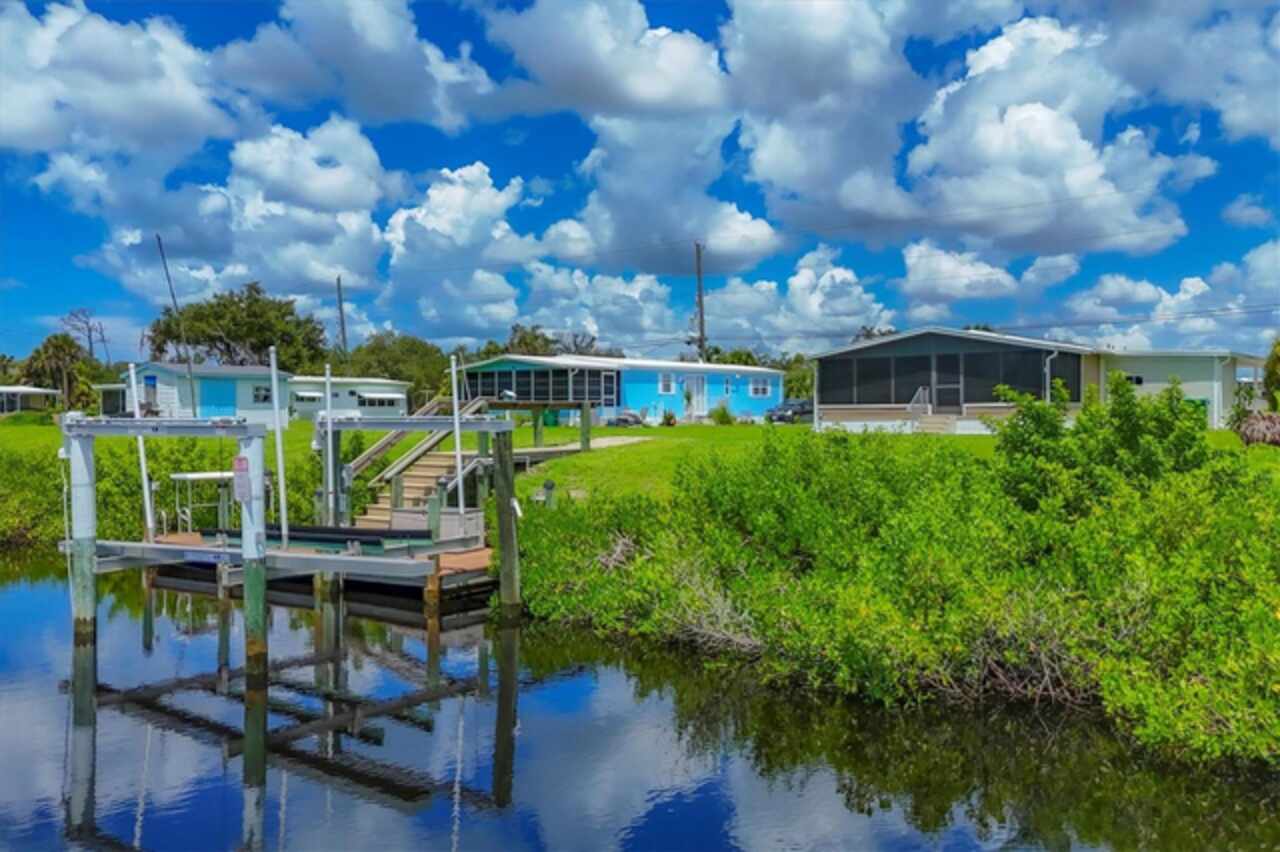 Boating before dawn. Sunsets before sleeping. Jump right into your boat and head out to open water right from your own backyard. Live your story or write your book in the comfort of this 3- bedroom, 2 bath, double wide mobile home on this stunning saltwater canal leading to the Gulf. The 16x28-6, 000 lb. boat lift is just the perfect size and features a remote control for the lift, 2 water stations, a fish cleaning station and electricity. You will have great Peace of Mind having a NEW roof, NEW carport, NEW vapor barrier and NEW insultation. The home has many improvements such as freshly painted interiors, the 24x12 Florida room has a new COASTAL look with freshly painted beadboard walls, vinyl sliding windows, screens and Sunblock roll down shades as well as soothing indoor-outdoor carpet. Additional notable improvements are the BEAUTIFUL Pergo Outlast wood flooring in the living and bedroom areas. Easy to care for tile in the kitchen, indoor laundry room and bathrooms. New remote controlled ceiling fans in the Living and Primary rooms. The 10x12 outdoor shed has lighting and electricity and gives you plenty of room to store extra items. Just about every inch of this fabulous home has been touched up. Built in 1985, this 1040 SQ.FT., double wide home also comes with assumable flood insurance. Holiday Mobile Estates is now Manatee Cove, a friendly, active 55 plus community in the heart of Englewood surrounded by shopping centers, local restaurants, unique boutiques and only 5 minutes to Englewood Beach.