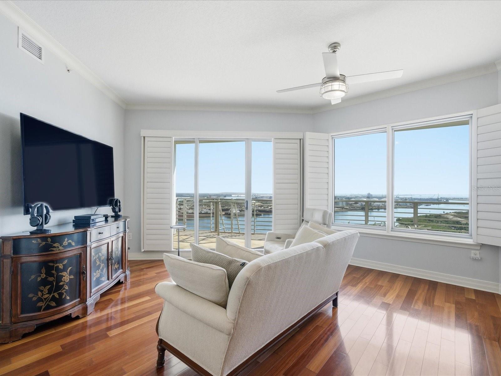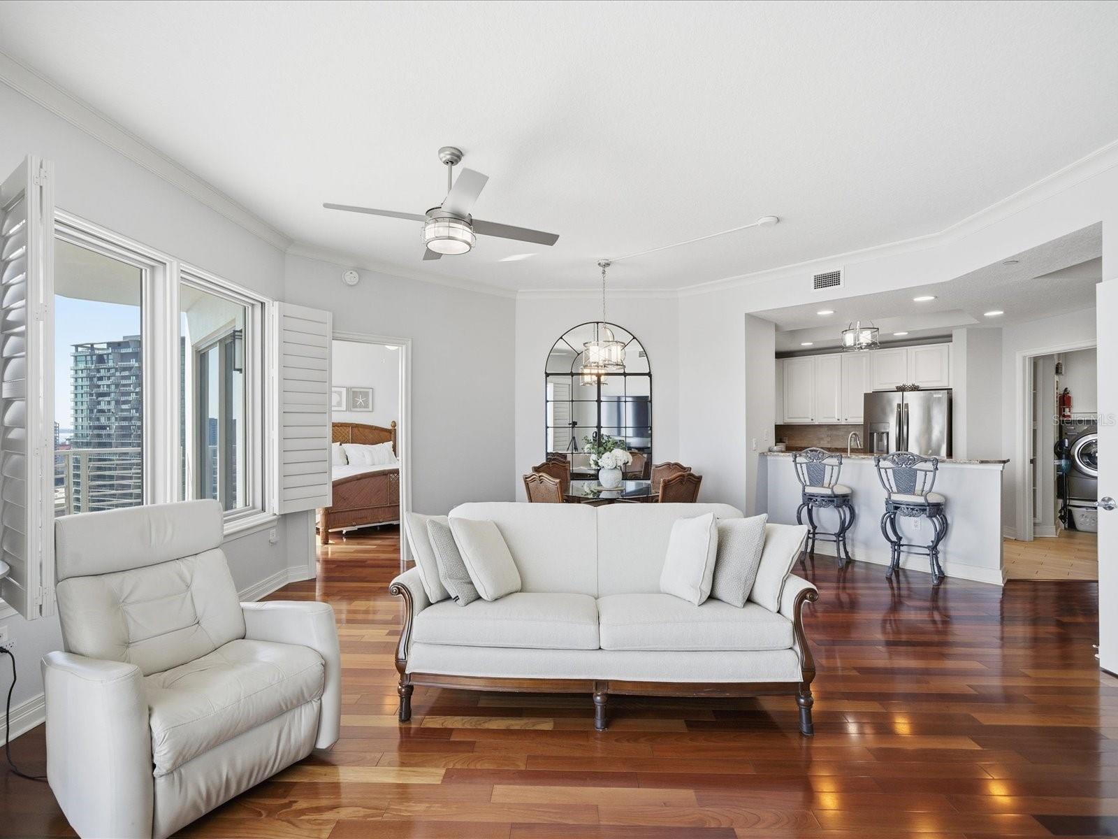 We are pleased to present this beautiful property in the Towers of Channelside, located in Tampa's Channel District! A spacious unit with SPECTACULAR VIEWS of Garrison Channel, Sparkman Channel, Sparkman Wharf and Harbour Island, this 2 bedroom, 2.1 bath, 1, 165 sq. ft. condominium features a light and bright open floor plan with neutral decor! Upon arriving at the property, you will notice a home that has been impeccably maintained. Features include: an inviting great room well suited for entertaining and with access to a sizeable tiled balcony with gorgeous views; an updated kitchen with newer appliances (refrigerator, microwave, and dishwasher) and granite counter tops; HARDWOOD FLOORS, CROWN MOLDING, AND PLANTATION SHUTTERS; new flooring in the kitchen, foyer, and laundry room; NEW LIGHT FIXTURES; ceiling fans in both bedrooms and in the great room; WALL MOUNTED TV'S; custom built ins; laundry room (not a closet laundry) with raised, full size washer and dryer; recent INTERIOR PAINT; two interior storage closets; custom built office space; TWO ASSIGNED GARAGE PARKING SPACES AND TWO BUILDING STORAGE SPACES; immaculate condition and more! The Towers of Channelside offers 24 hour security, an enormous RESORT STYLE POOL with spa, rock waterfall, and grill station, designated dog walk areas, and SPACIOUS CLUBHOUSE. With easy access to Sparkman's Wharf, Harbour Island, and the Water Street District, Towers of Channelside offers a convenient location for dining, shopping, entertainment, fitness centers, work and more, a fantastic place to call home!