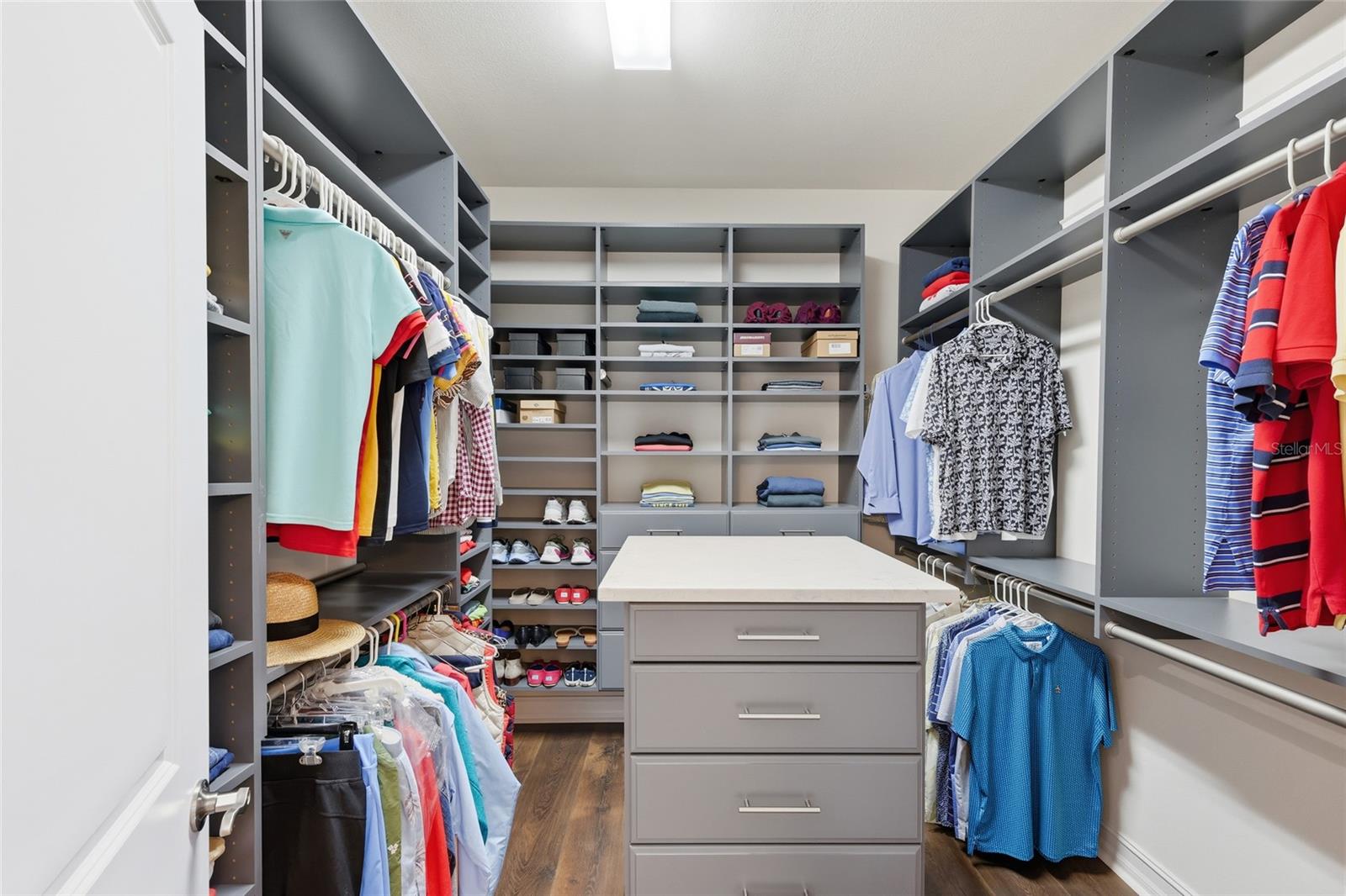 Built-in Features, Ceiling Fans(s), Coffered Ceiling(s), Crown Molding, Eat-in Kitchen, High Ceilings, In Wall Pest System, Kitchen/Family Room Combo, Open Floorplan, Pest Guard System, Primary Bedroom Main Floor, Solid Surface Counters, Solid Wood Cabinets, Split Bedroom, Stone Counters, Thermostat, Tray Ceiling(s), Walk-In Closet(s), Window Treatments