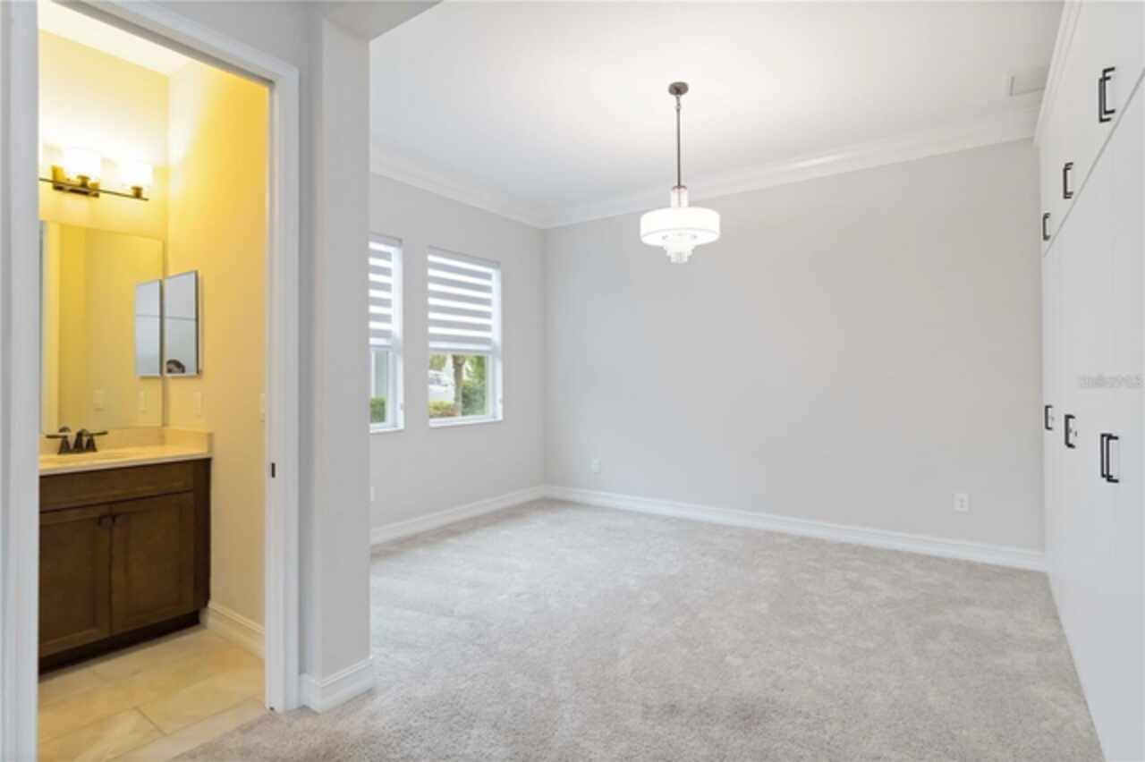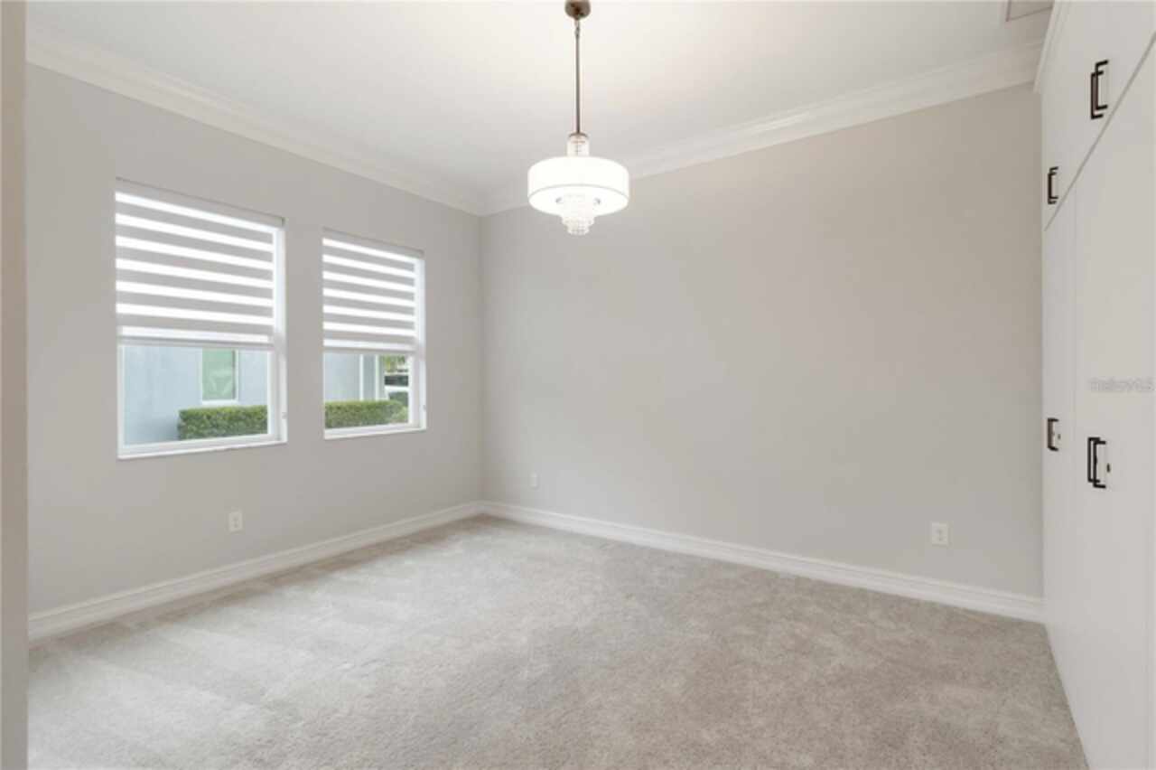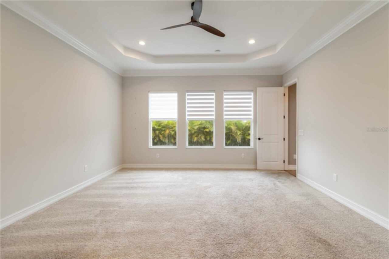 Built-in Features, Ceiling Fans(s), Coffered Ceiling(s), Crown Molding, Eat-in Kitchen, High Ceilings, In Wall Pest System, Kitchen/Family Room Combo, Living Room/Dining Room Combo, Open Floorplan, Pest Guard System, Primary Bedroom Main Floor, Solid Surface Counters, Solid Wood Cabinets, Split Bedroom, Stone Counters, Thermostat, Tray Ceiling(s), Walk-In Closet(s), Window Treatments