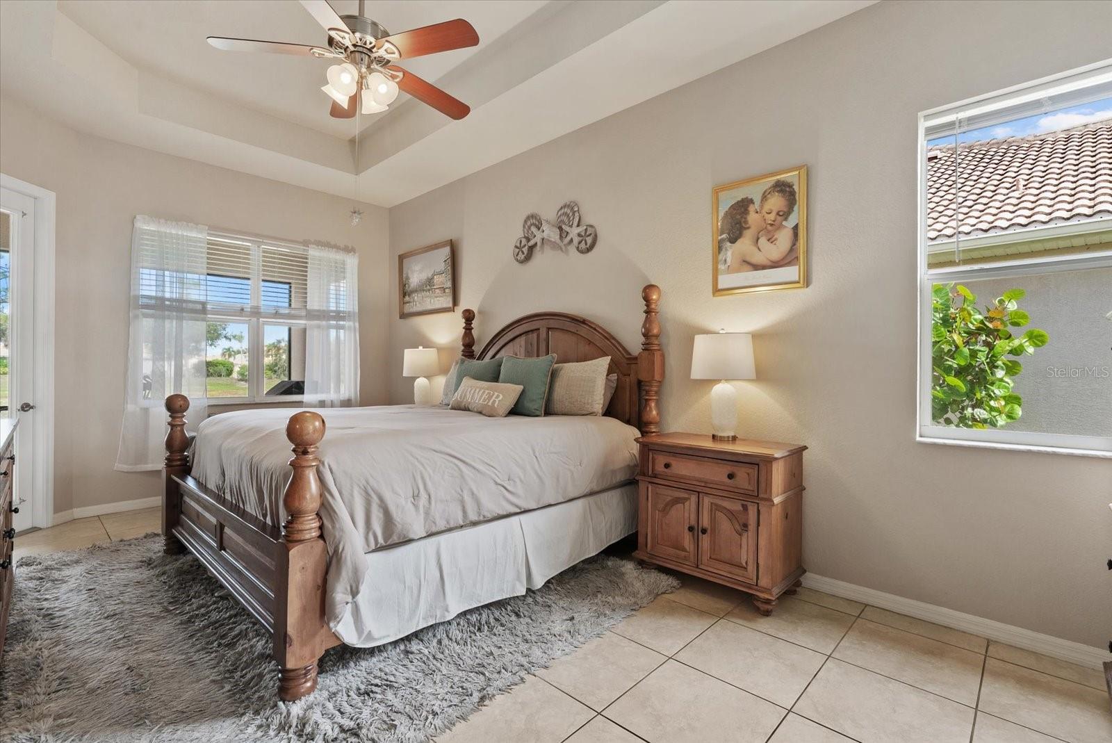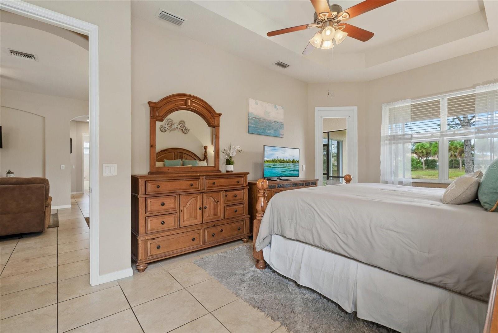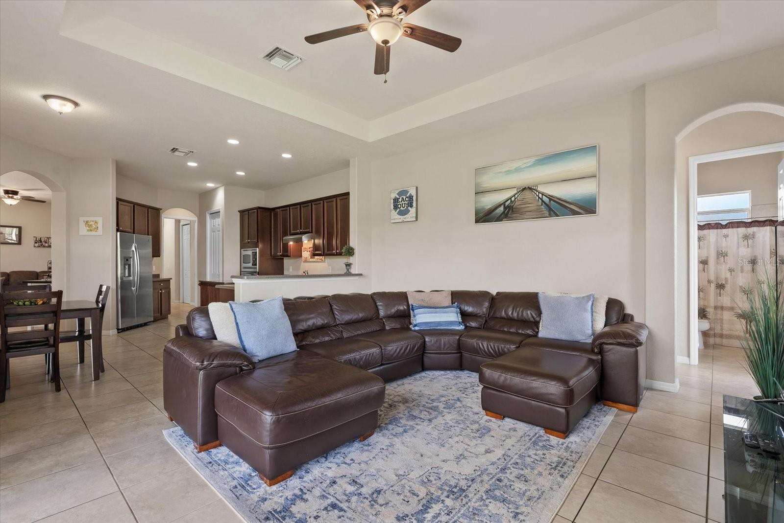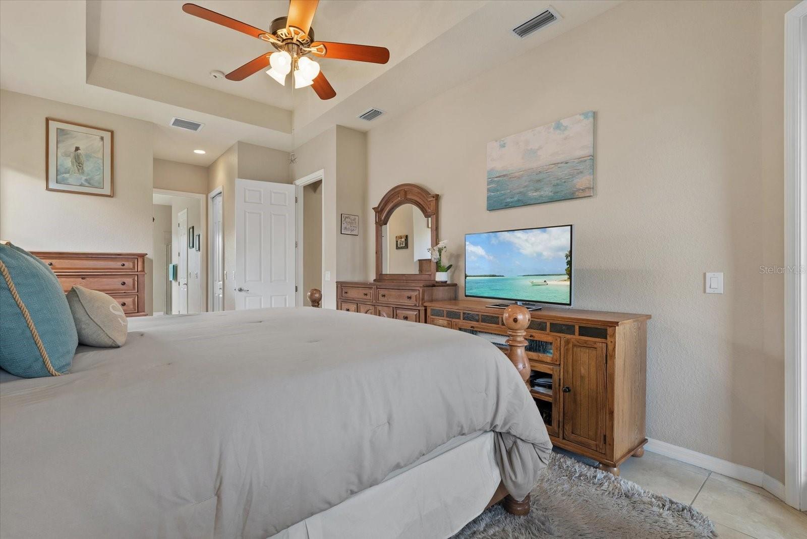 Ceiling Fans(s), Eat-in Kitchen, High Ceilings, Kitchen/Family Room Combo, Living Room/Dining Room Combo, Open Floorplan, Primary Bedroom Main Floor, Solid Surface Counters, Solid Wood Cabinets, Split Bedroom, Tray Ceiling(s), Walk-In Closet(s)