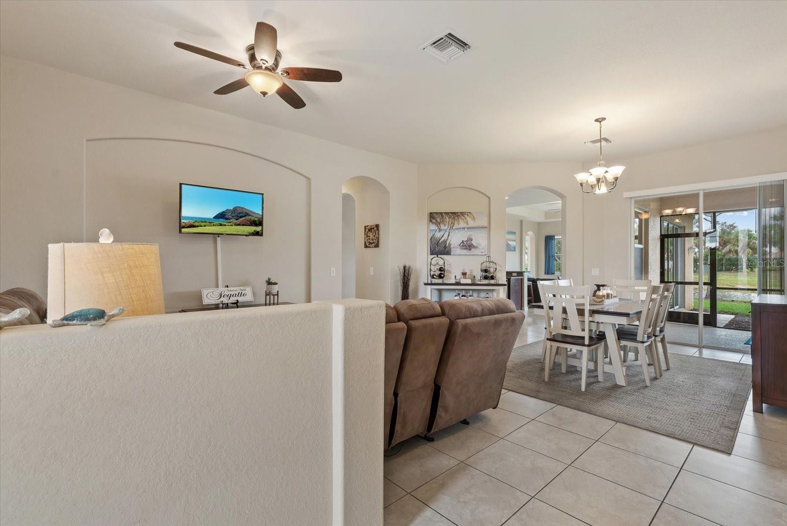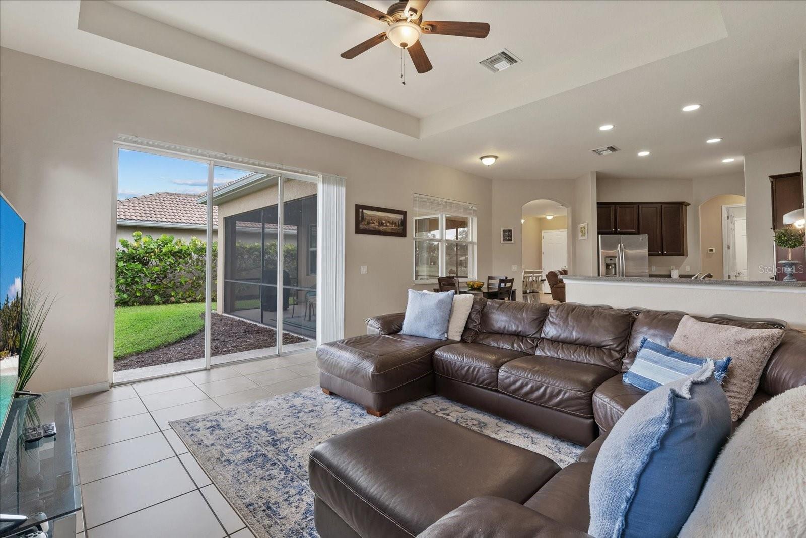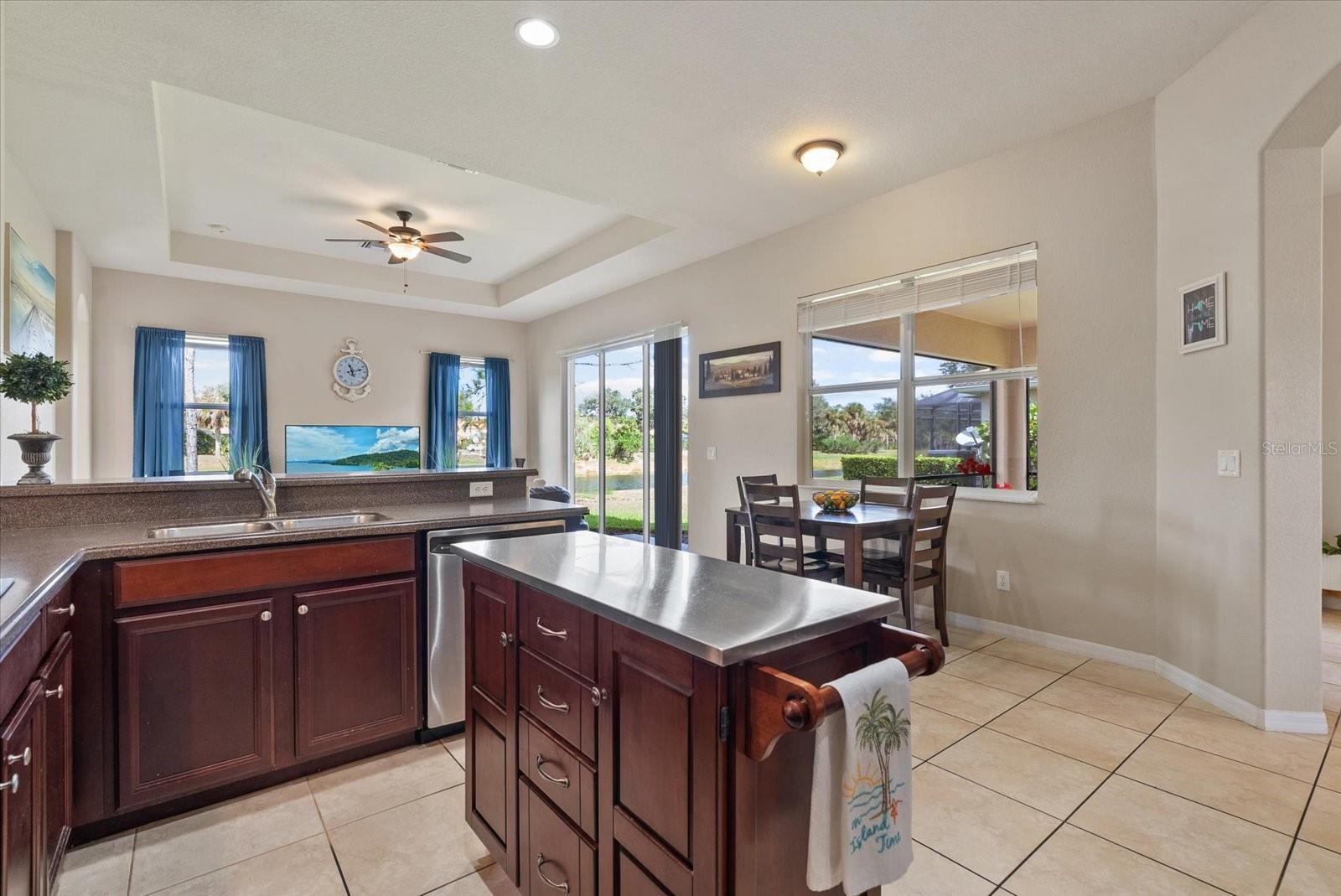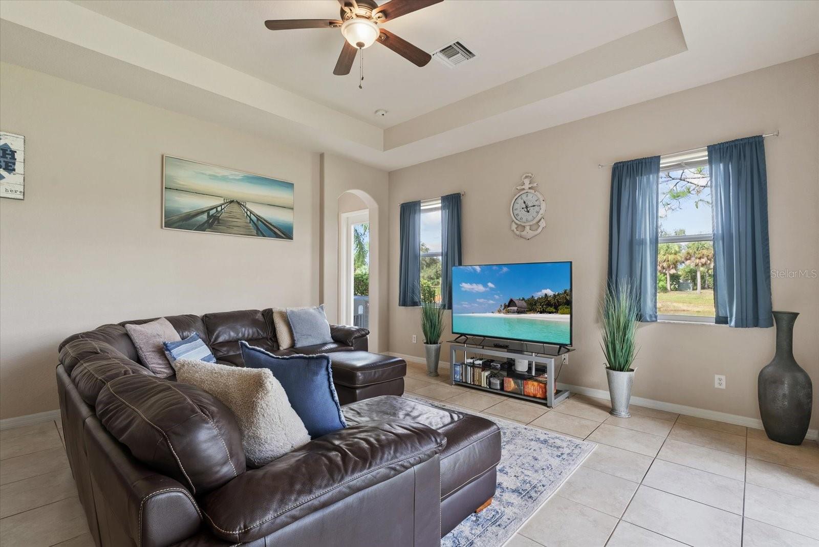 Ceiling Fans(s), Eat-in Kitchen, High Ceilings, Kitchen/Family Room Combo, Living Room/Dining Room Combo, Open Floorplan, Primary Bedroom Main Floor, Solid Surface Counters, Solid Wood Cabinets, Split Bedroom, Tray Ceiling(s), Walk-In Closet(s)