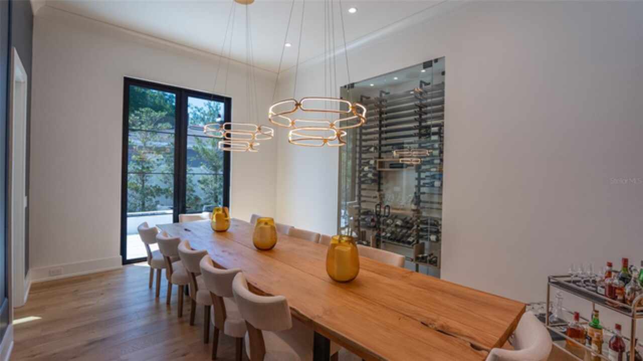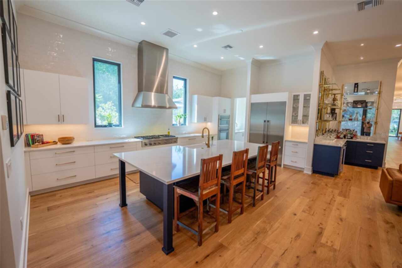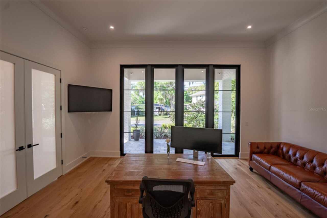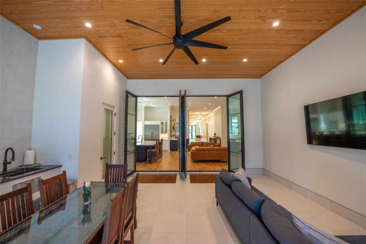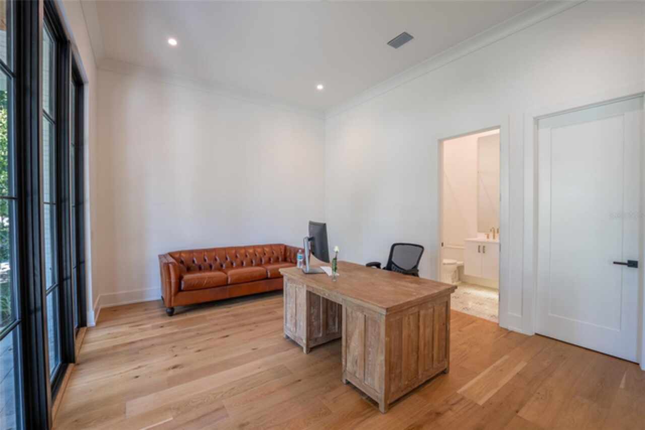 This Modern, Contemporary single-story home, built by FG Schaub Custom Homes, is 4, 389 SF under air plus a 434 SF transitional room, creating 4823 SF of living space all on one floor. This urban retreat features 5 bedrooms, 5 en suite bathrooms, 2 half bathrooms, a formal dining room, and a 60’ by 9’ Gallery, with 12’ ceilings throughout. The home is custom-designed to fit on the 14, 360 SF lot. It is situated in the Delaney Park neighborhood of Downtown Orlando. Built in 2023, this home has a meticulous design and high-quality fixtures. The 12’ ceilings are an inspiring accompaniment to the Anderson 10’ external double doors throughout the home. Adorned with 5 LED Chandiliers, the Gallery is a centerpiece of the home. The Formal Dining room sits off the Gallery, encased in glass, and the room can hold 12 dinner guests. The Formal Dining room includes a 200-bottle glass-enclosed wine wall. Through the Formal Dining room, you will find 10’ glass doors leading to the dining lanai featuring the custom-built stone firepit. The Brass and Glass Bar stands at the end of the Gallery. The centerpiece of your entertaining. The Chef’s Kitchen provides the space and equipment to indulge your culinary dreams. The island seats 8, allowing the entire family to enjoy the chef’s display. Thermador appliances include a 48” range top with flat grill, a combined 48” double column refrigerator freezer, and a wall oven and microwave. The Butlers Pantry is adjacent to the walk-in Pantry and Formal Dining room. The Great Room provides living space adjacent to both the bar, the chef’s kitchen, and the transitional room. The Great Room’s brick-accented main wall provides an ideal focal point for enjoying entertainment. Two sets of 10’ double doors lead from the Great Room to the Transitional Room. The Transitional Room houses the Summer Kitchen and Pool Bath. The Transitional Room provides a resort living, as an automated screen separates the room from the expansive pool deck. The Primary Suite sits off the Great Room and has direct access to the pool deck through 10’ double doors, which are draped with 12’ ceiling-mounted custom shear drapes. The sizable Primary suite allows room for a desk, bookcase, seating area, and exercise equipment, in addition to a king-size bed. The Primary Bathroom offers a large space including 72” freestanding tub, 7’ shower w/ 4’ wide bench, and single vanities. The Primary Bathroom leads to the Primary Dressing Room with built-in closet fixtures, which provide ample wardrobe space. Opposite the Primary Suite, we have the Guest Suite, which is only accessible from the pool deck, providing an in-law suite effect. The Guest Suite has 10’ double doors providing direct access to the pool deck. The Guest Suite Bathroom provides a roll-in shower to accommodate family members of all ages. Two bedrooms sit off the Gallery and are situated in the center of the house, away from both the Primary and Guest Suites. One Bedroom as a shower with floor-to-ceiling tile, while the other has a bathtub shower combo to accommodate anyone's needs. The home office sits at the front of the home and can double as a 5th bedroom. The Pool Deck measures approximately 1600 SF with a sumptuous 38’ X 12’ (450 SF) heated swimming pool. Mature landscape adorns the perimeter of the backyard, providing a true urban oasis feel. No HOA.