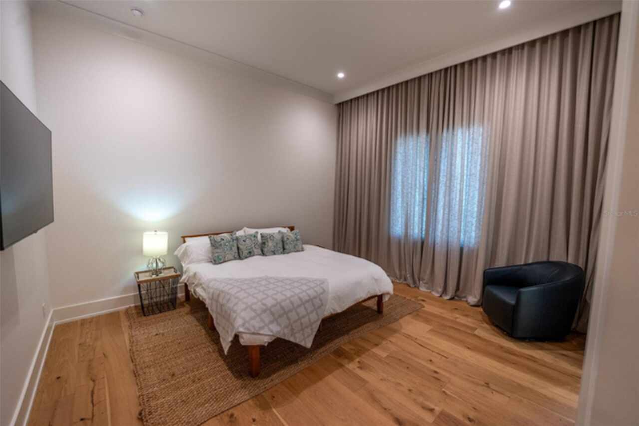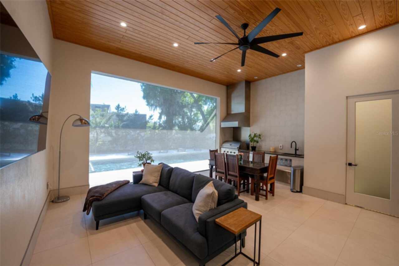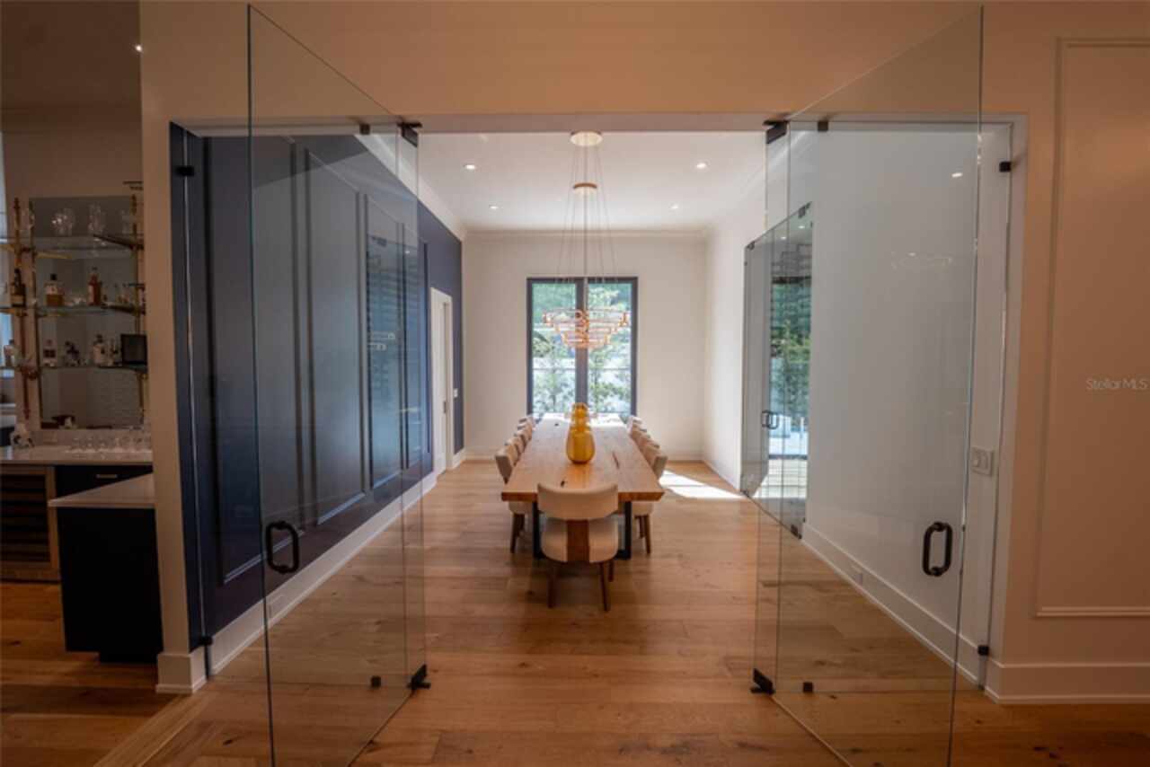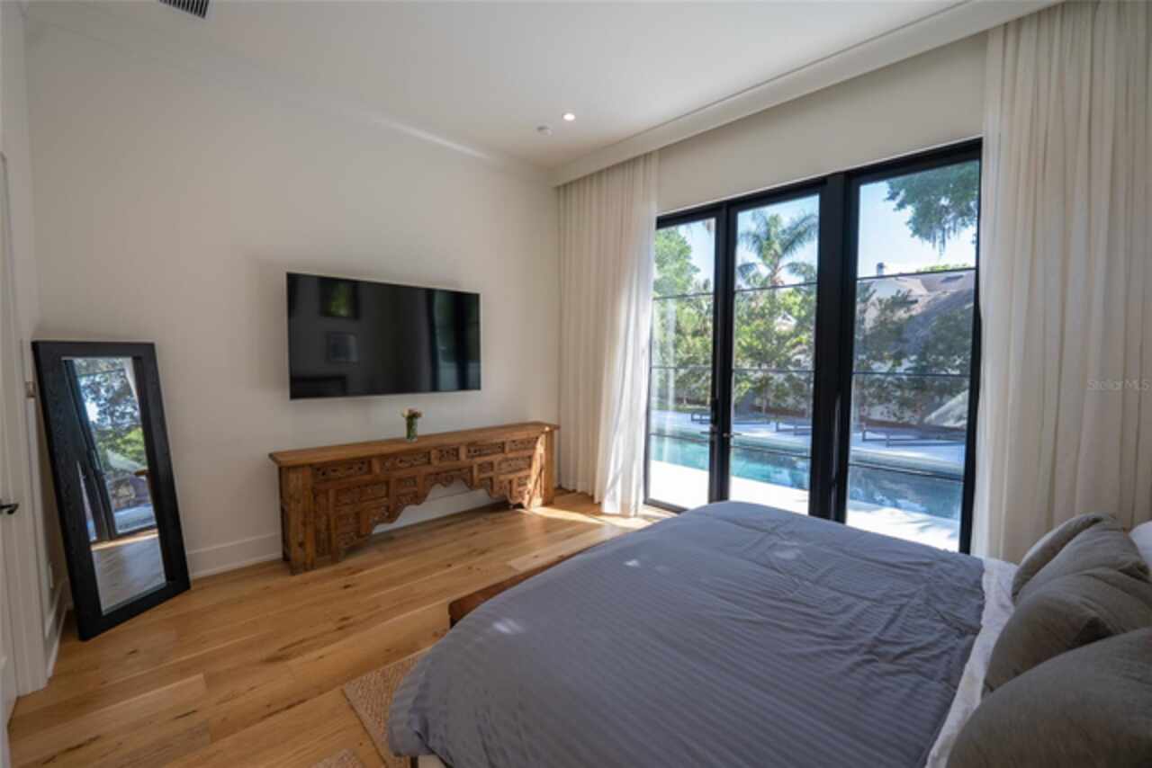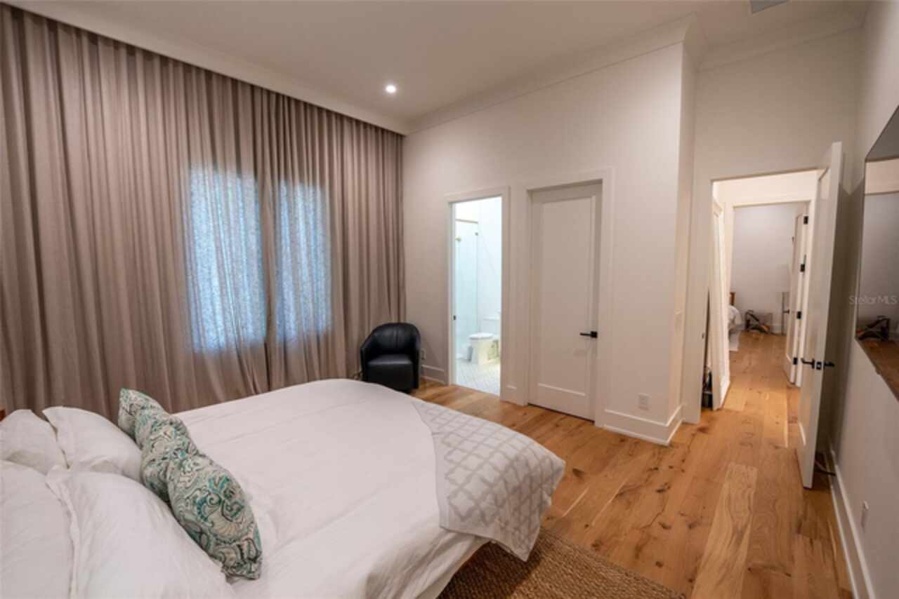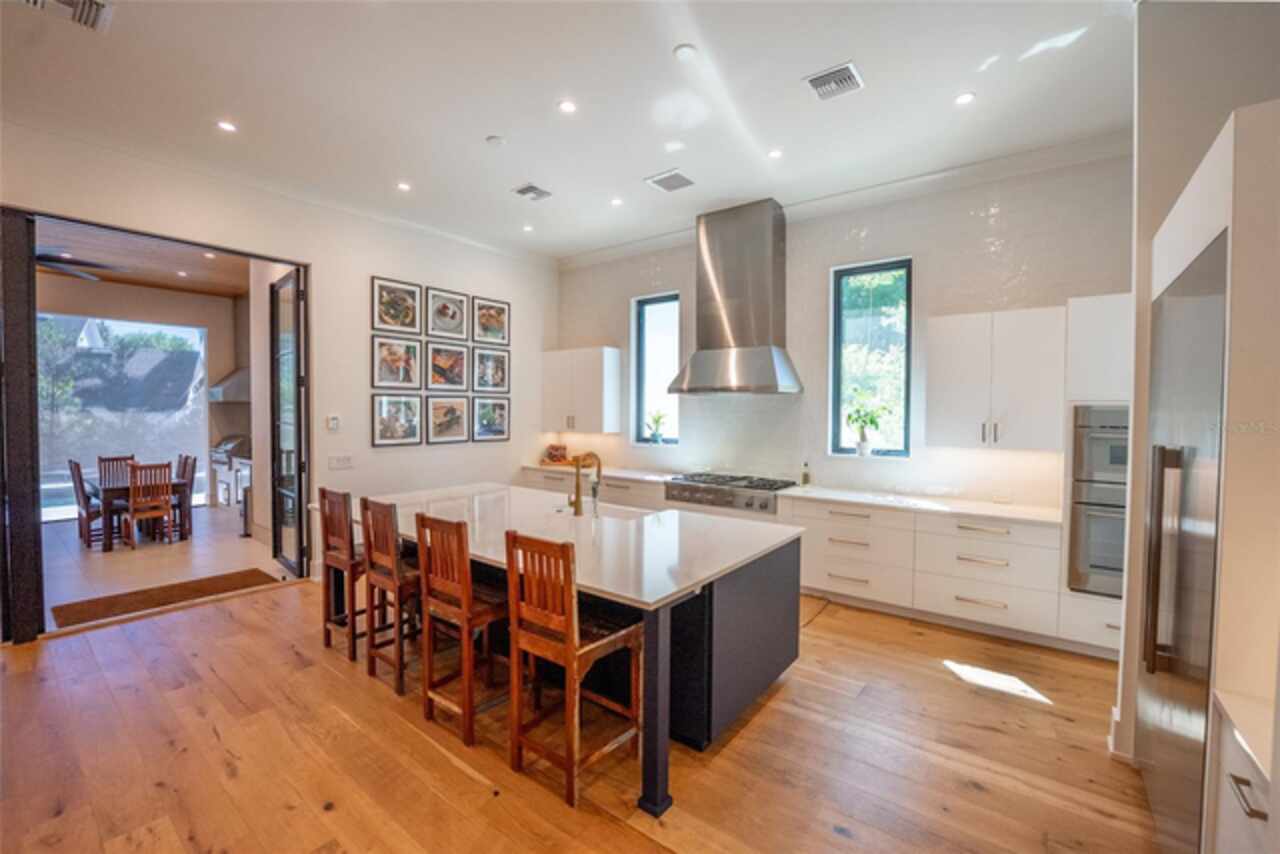 This Modern, Contemporary single-story home, built by FG Schaub Custom Homes, is 4, 389 SF under air plus a 434 SF transitional room, creating 4823 SF of living space all on one floor. This urban retreat features 5 bedrooms, 5 en suite bathrooms, 2 half bathrooms, a formal dining room, and a 60’ by 9’ Gallery, with 12’ ceilings throughout. The home is custom-designed to fit on the 14, 360 SF lot. It is situated in the Delaney Park neighborhood of Downtown Orlando. Built in 2023, this home has a meticulous design and high-quality fixtures. The 12’ ceilings are an inspiring accompaniment to the Anderson 10’ external double doors throughout the home. Adorned with 5 LED Chandiliers, the Gallery is a centerpiece of the home. The Formal Dining room sits off the Gallery, encased in glass, and the room can hold 12 dinner guests. The Formal Dining room includes a 200-bottle glass-enclosed wine wall. Through the Formal Dining room, you will find 10’ glass doors leading to the dining lanai featuring the custom-built stone firepit. The Brass and Glass Bar stands at the end of the Gallery. The centerpiece of your entertaining. The Chef’s Kitchen provides the space and equipment to indulge your culinary dreams. The island seats 8, allowing the entire family to enjoy the chef’s display. Thermador appliances include a 48” range top with flat grill, a combined 48” double column refrigerator freezer, and a wall oven and microwave. The Butlers Pantry is adjacent to the walk-in Pantry and Formal Dining room. The Great Room provides living space adjacent to both the bar, the chef’s kitchen, and the transitional room. The Great Room’s brick-accented main wall provides an ideal focal point for enjoying entertainment. Two sets of 10’ double doors lead from the Great Room to the Transitional Room. The Transitional Room houses the Summer Kitchen and Pool Bath. The Transitional Room provides a resort living, as an automated screen separates the room from the expansive pool deck. The Primary Suite sits off the Great Room and has direct access to the pool deck through 10’ double doors, which are draped with 12’ ceiling-mounted custom shear drapes. The sizable Primary suite allows room for a desk, bookcase, seating area, and exercise equipment, in addition to a king-size bed. The Primary Bathroom offers a large space including 72” freestanding tub, 7’ shower w/ 4’ wide bench, and single vanities. The Primary Bathroom leads to the Primary Dressing Room with built-in closet fixtures, which provide ample wardrobe space. Opposite the Primary Suite, we have the Guest Suite, which is only accessible from the pool deck, providing an in-law suite effect. The Guest Suite has 10’ double doors providing direct access to the pool deck. The Guest Suite Bathroom provides a roll-in shower to accommodate family members of all ages. Two bedrooms sit off the Gallery and are situated in the center of the house, away from both the Primary and Guest Suites. One Bedroom as a shower with floor-to-ceiling tile, while the other has a bathtub shower combo to accommodate anyone's needs. The home office sits at the front of the home and can double as a 5th bedroom. The Pool Deck measures approximately 1600 SF with a sumptuous 38’ X 12’ (450 SF) heated swimming pool. Mature landscape adorns the perimeter of the backyard, providing a true urban oasis feel. No HOA.