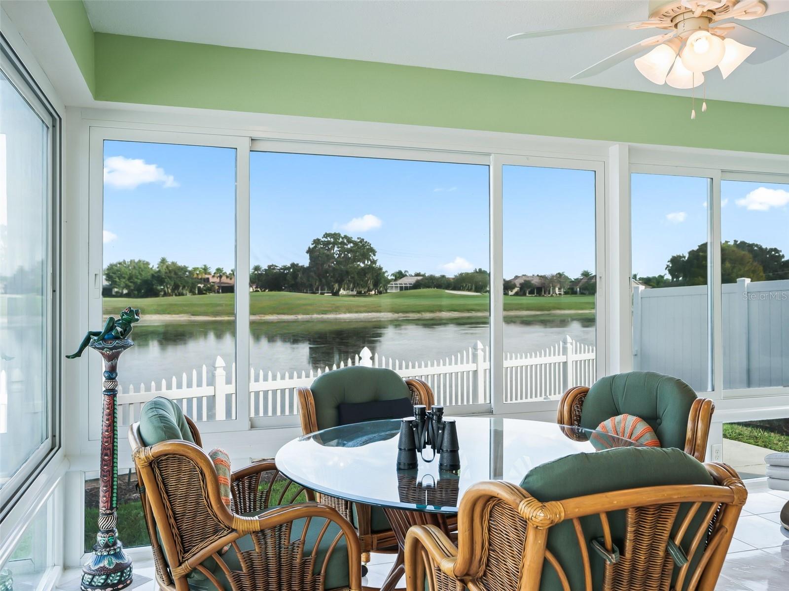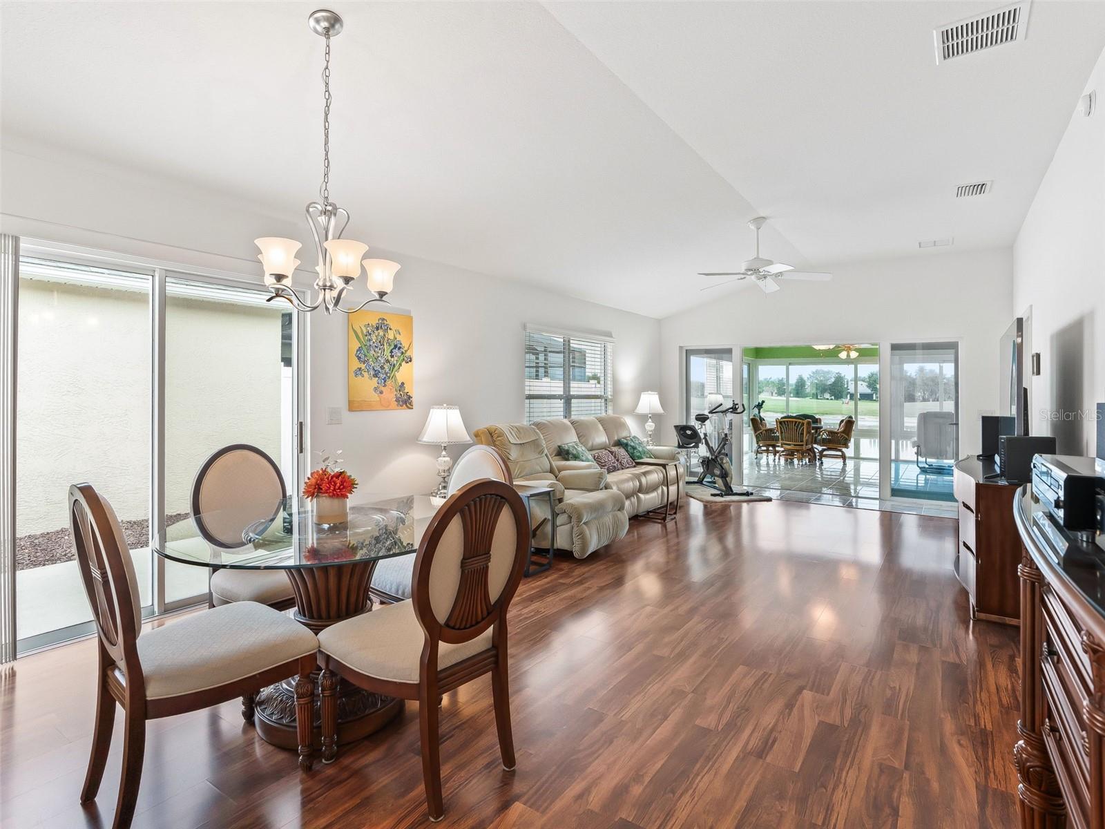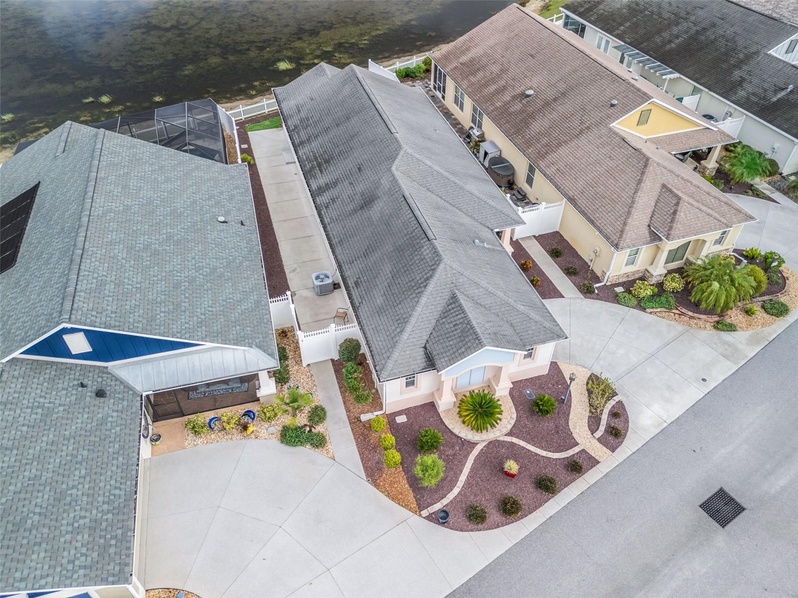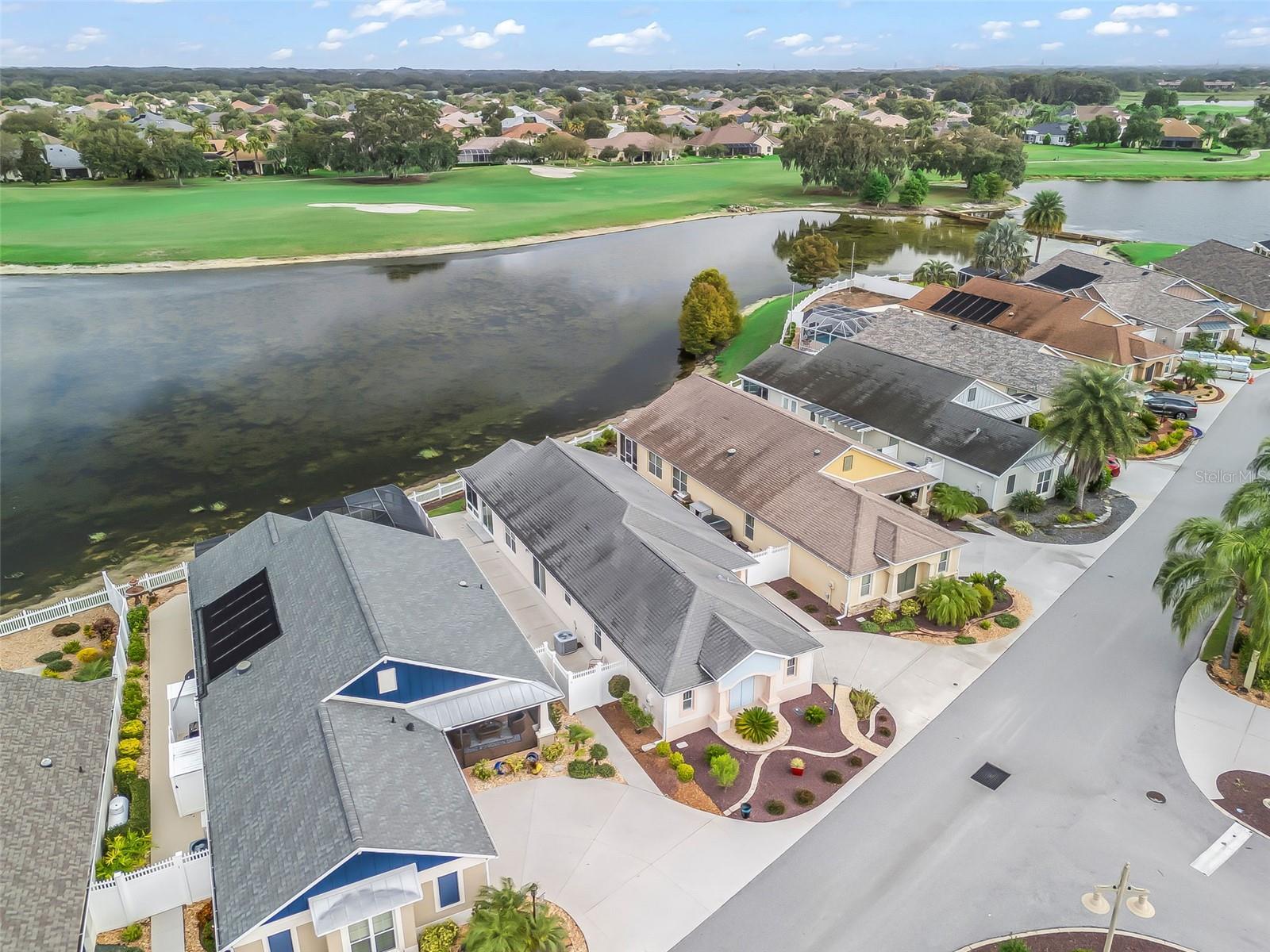 Spectacular WATERFRONT & GOLF-FRONT home – Steps to Lake Sumter Landing! This one-of-a-kind property at EDGEWATER BUNGALOWS offers the perfect blend of location, lifestyle, and comfort. Situated on a premier waterfront and golf front site, this residence showcases sweeping views of LAKE SUMTER and a serene setting. Inside, you’ll find an open floor plan with soaring high ceilings, creating a bright and spacious atmosphere. The kitchen featuring maple cabinetry includes LG stainless steel appliances (2023), Bosch Dishwasher (2025) and an open floor plan - open to the main living areas. A climate-controlled, SPACIOUS, enclosed lanai with high-end glass windows and screens, adds square footage and invites you to relax or entertain year-round while enjoying the beautiful backdrop. No carpet throughout this lovely home featuring tile and laminate floors- this versatile layout is designed for easy living. Just a short walk to Lake Sumter Landing’s entertainment, dining, and shopping - this location can’t be beat. This home has NO BOND! New landscaping installed in 2023.