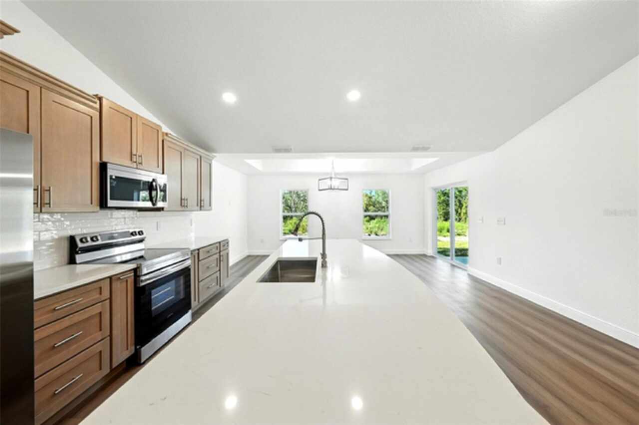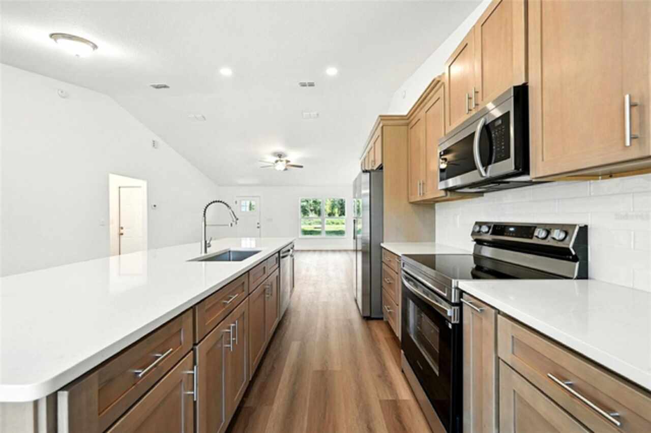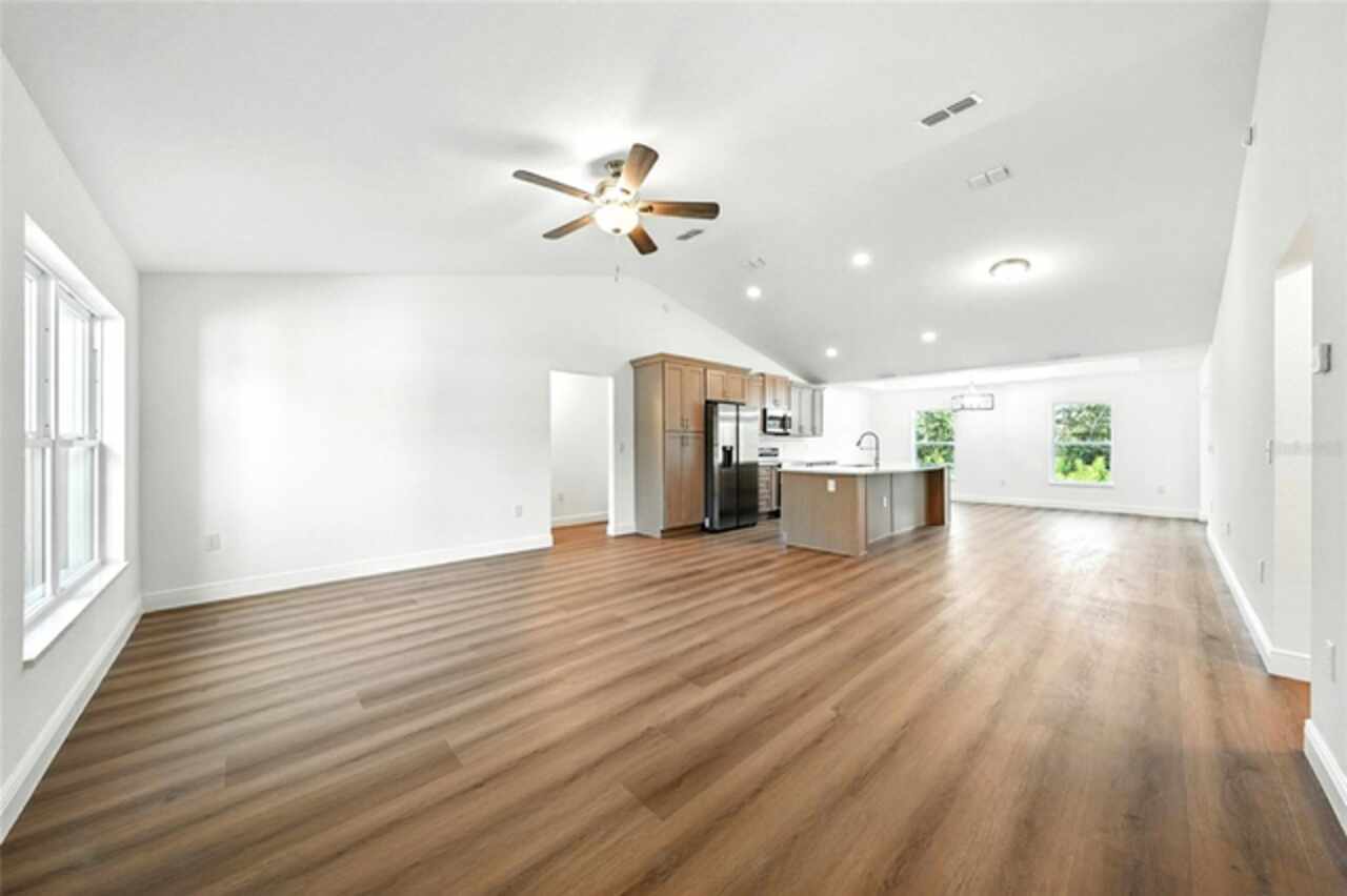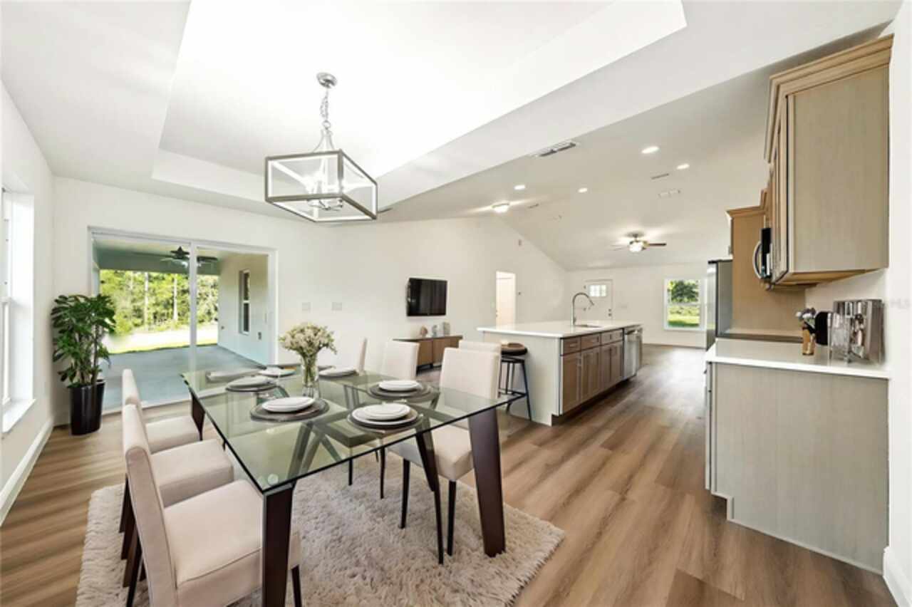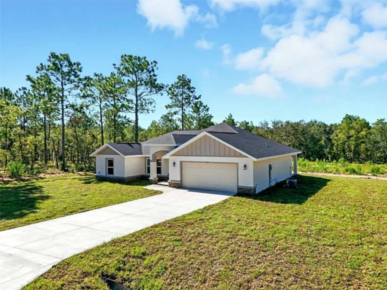Under contract-accepting backup offers. BRAND NEW construction 3 bedroom, 2 bathroom home with a 2 car garage on 1 ACRE fully cleared in Rolling Hills! Construction is complete, CO is issued and home is ready for immediate occupancy! NO HOA and NO Flood Zone! Upon entering, you'll encounter the spacious open concept living room with cathedral ceilings and beautiful kitchen equipped with all stainless steel appliances, solid wood soft-close cabinets, large center island and upgraded quartz countertops. This home offers a split bedroom floor plan and owner's suite featuring a tray ceiling, large walk-in closet, and ensuite bathroom with dual sinks and large walk-in shower with a bench. There are several upgraded options selected for this home including luxury vinyl plank flooring throughout, upgraded quartz countertops and backsplash, upgraded baseboards, tray ceilings in the dining room and primary bedroom, and exterior stone and hardie board accents providing an elevated curb appeal. The large covered back patio overlooks your private, cleared 1 acre lot. This home provides the perfect space ideal for entertainment and relaxation in a quiet, yet growing Central Florida community. Closing cost assistance and lender incentives may be provided if using the seller's preferred lender.