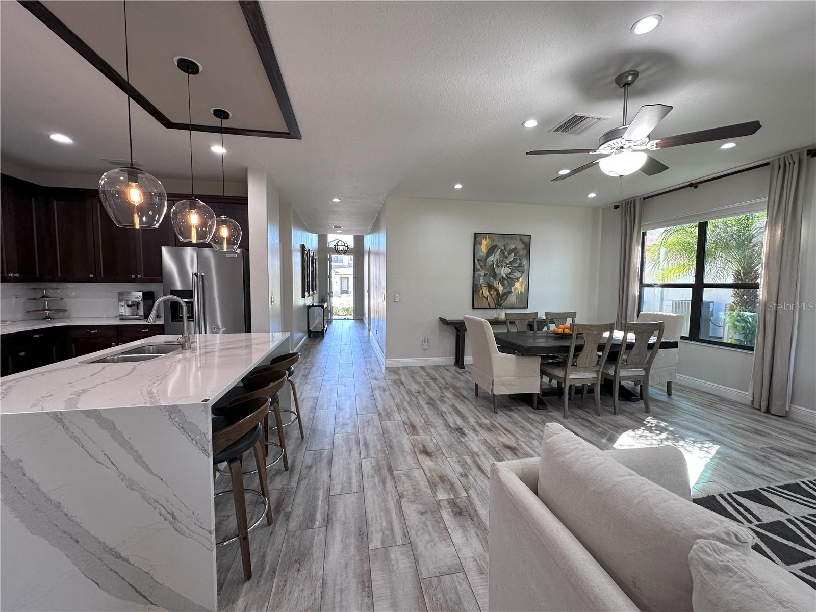 Dont miss your c hance to see this Wonderful modern home, located at Rose Haven, a gated community with NO CDD FEE. The exterior has fantastic curb appeal, including a bay window, soaring arched front porch, stone accents, and and 8 foot fiberglass door with satin glass insert. You'll fall in love with your first step inside. The foyer is stunning, with upgraded tile that runs throughout the great room and kitchen. The kitchen features an island bar with dual sinks, and a beautiful quartz countertop that "waterfalls" on both sides. 42 inch upper cabinets with crown molding, GE Energystar appliances, a Moen® Arbor Brushed Nickel single-lever faucet with pull out sprayer, and a closet pantry all included. The kitchen opens to the spacious great room with sliders overlooking the green space and community pool. The master suite features dual walk-in closets, and the master bath has a walk in shower with full, seamless glass walls and upgraded wall pebble detail in the tile. There are three additional bedrooms, including one with it's own en suite bathroom ideal for an "in-law" suite. Lots of extra lighting in this model, puck can lights, pendant lights, and under cabinet lights in the kitchen. The kitchen cabinets and all bathroom cabinets have been upgraded, and all the bathrooms have granite countertops. You even get a ceiling rainfall shower head in the Master Suite. All bedrooms have waterproof luxury vinyl. The Rose Haven community has a gated entry, with a beautiful lakeside boardwalk, and community pool and cabana. As mentioned above there is NO CDD FEE, and a low HOA fee of $128 a month. This fee not only covers the pool, cabana, boardwalk, and entry gate, but also covers your trash pick up and basic cable. Conveniently located just a few miles from the Suncoast Parkway for quick commute to Tampa, it is also close to shopping, parks, restaurants, and beaches. So make sure this home is on your list to see, and come today!! please check the video tour