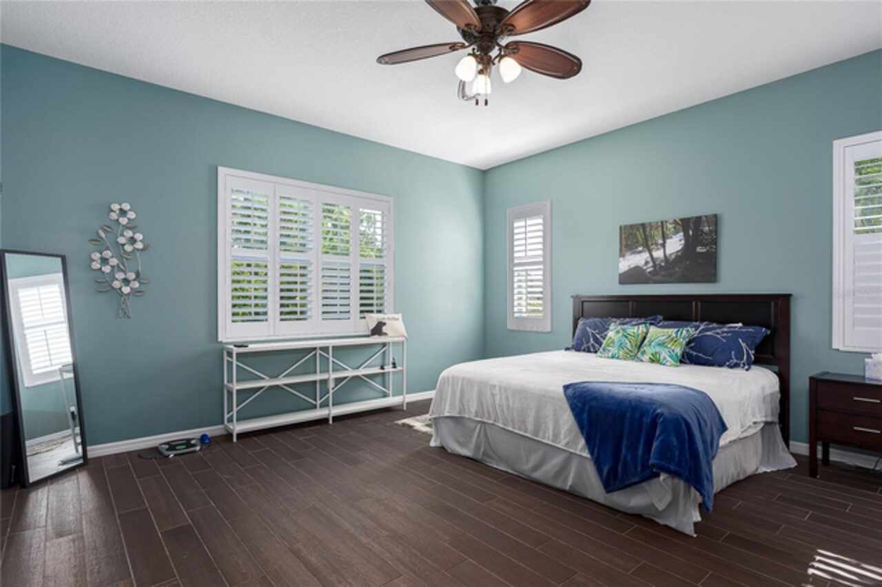Ceiling Fans(s), Eat-in Kitchen, High Ceilings, Kitchen/Family Room Combo, Open Floorplan, Primary Bedroom Main Floor, Solid Surface Counters, Solid Wood Cabinets, Split Bedroom, Walk-In Closet(s), Window Treatments