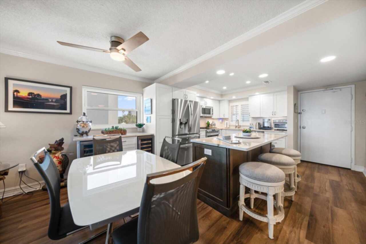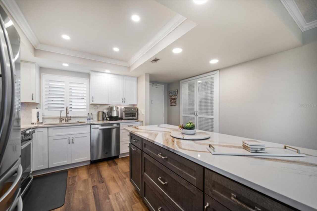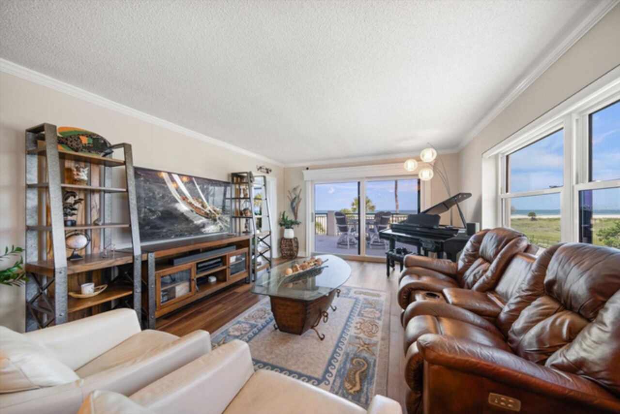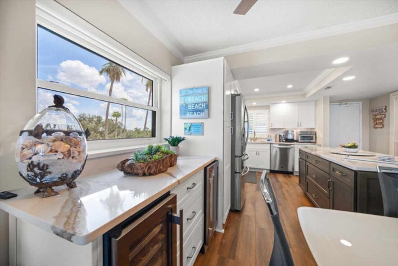 This corner unit isn’t just another condo—it’s one of the rarest offerings you’ll find on Sand Key, and truly one of a kind in gated, secure, and FULLY FUNDED Harbour Light Towers. At 1, 208 square feet, it’s the largest individual condo in the building, and one of only six like it. What sets this completely renovated unit apart even further is the 495-square-foot veranda—this expansive space is unique to the third-floor end units. Ideal for creating unforgettable memories and enjoying postcard perfect sunsets unlike anywhere else. Inside, luxury vinyl plank flooring runs throughout, accented by tall baseboards, crown molding, and custom cornices above both sliders. The attention to detail is obvious, starting with a beautifully remodeled kitchen that’s so striking it was featured on the design consultant’s website. It includes Cambria quartz countertops, custom Fabuwood cabinetry with soft-close doors, LG appliances including a French door refrigerator that makes craft ice, an induction range, a water softener and osmosis system, and even a cleverly hidden laundry closet—an extremely rare feature in this building. The kitchen opens to a dining area with a built-in cabinet housing two wine coolers. The light-filled family room is a peaceful retreat, where walls of glass frame the expansive veranda and draw your eyes straight to the shimmering Gulf beyond. With soft natural light filtering in and unobstructed views of sand, sea, and sky, it’s a space that invites you to unwind and simply take it all in. The spacious primary bedroom offers a custom walk-in closet and an ensuite with a walk-in shower and quartz counters. The additional bedroom is filled with natural light and a walk-in closet with a beautifully renovated full bathroom across the hall. All windows and sliders are top-quality PGT impact windows . Located at the far end of the third floor—well above flood zones—this unit offers complete privacy and convenient access to your assigned parking just one flight down via the stairwell just outside your front door. Enjoy the peace of mind that comes from a completed Milestone Inspection, Fully funded HOA, completed exterior renovations, common area weather decking, new roof, entry doors brick entrance, security system, cameras, parking areas repaved and 24 hour security! Simply put—this condo doesn’t compare to anything else currently available, here or anywhere nearby. If you’ve been waiting for something truly special, you’ve found it.
