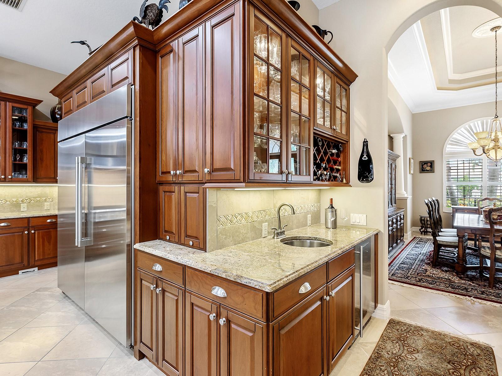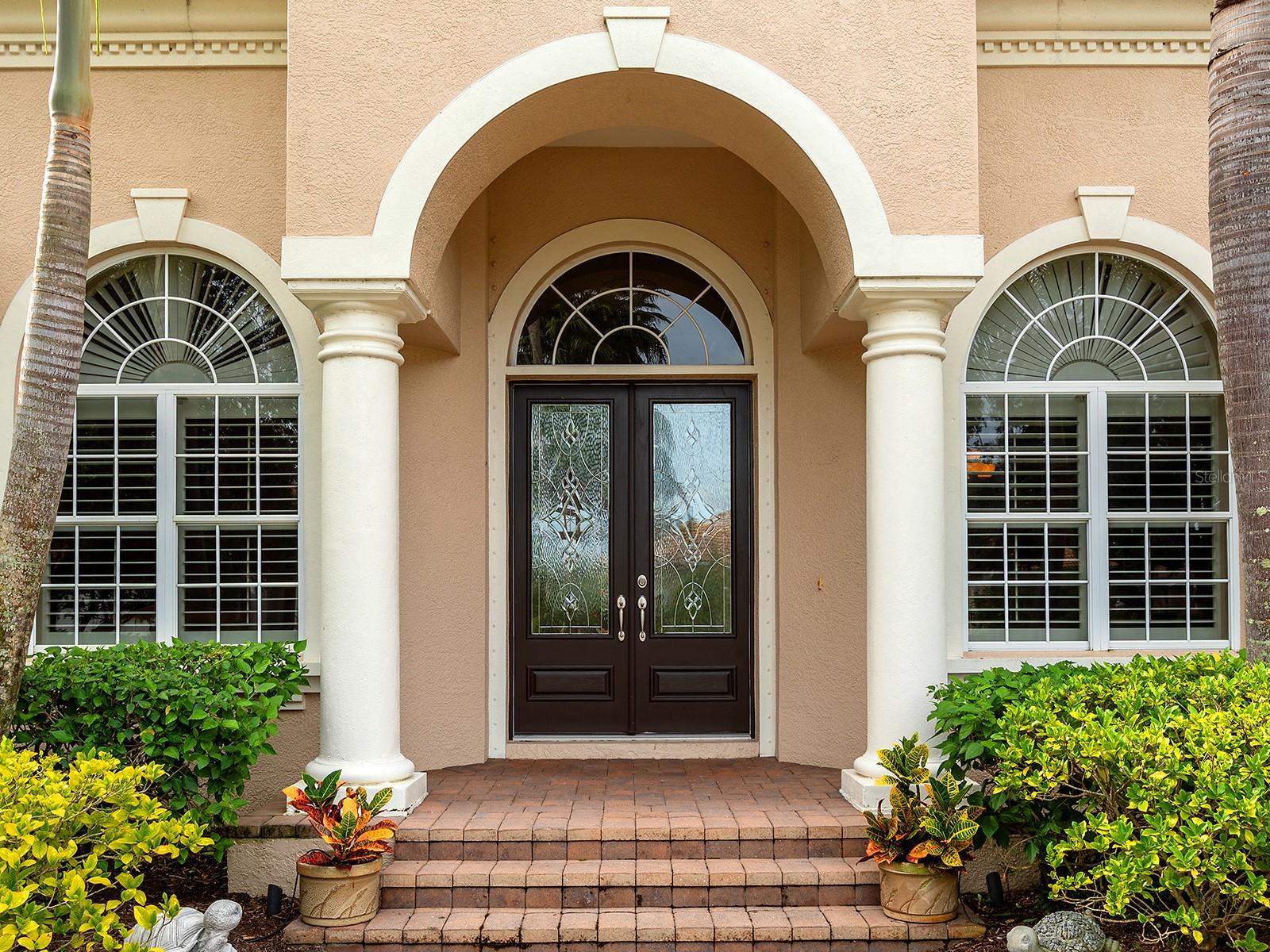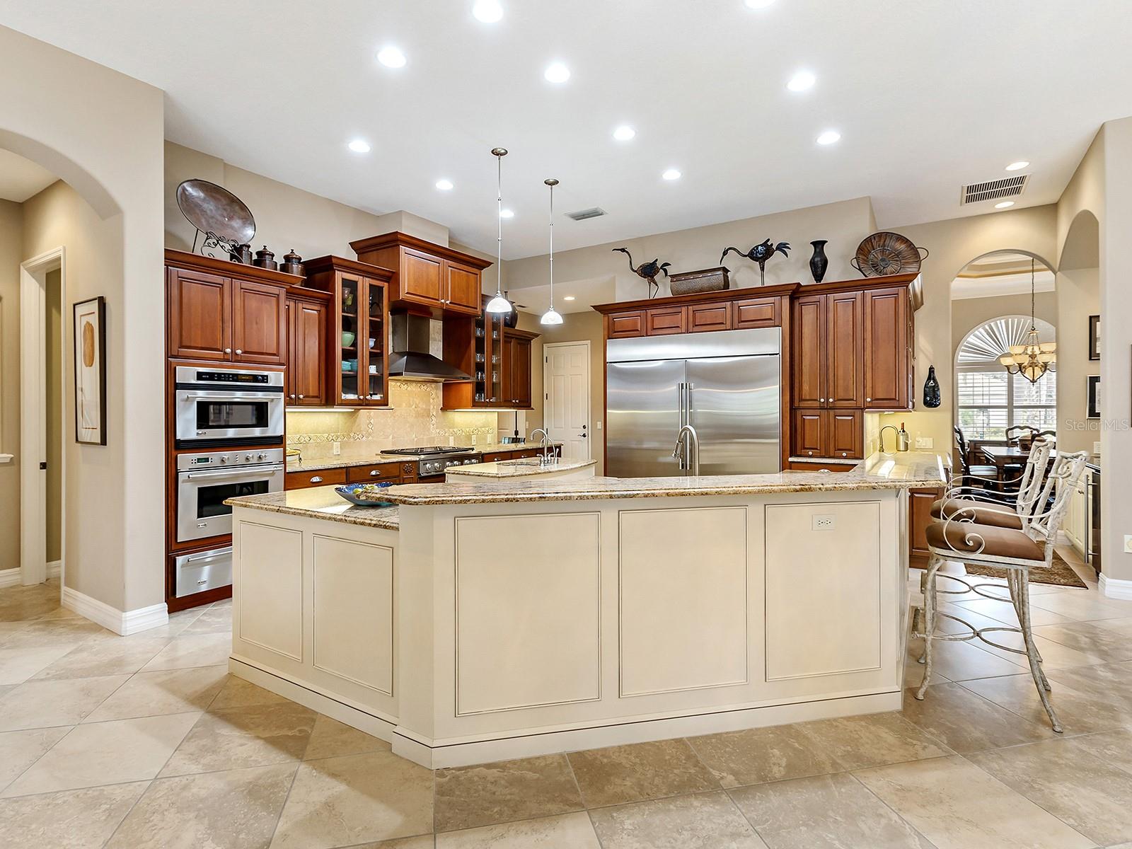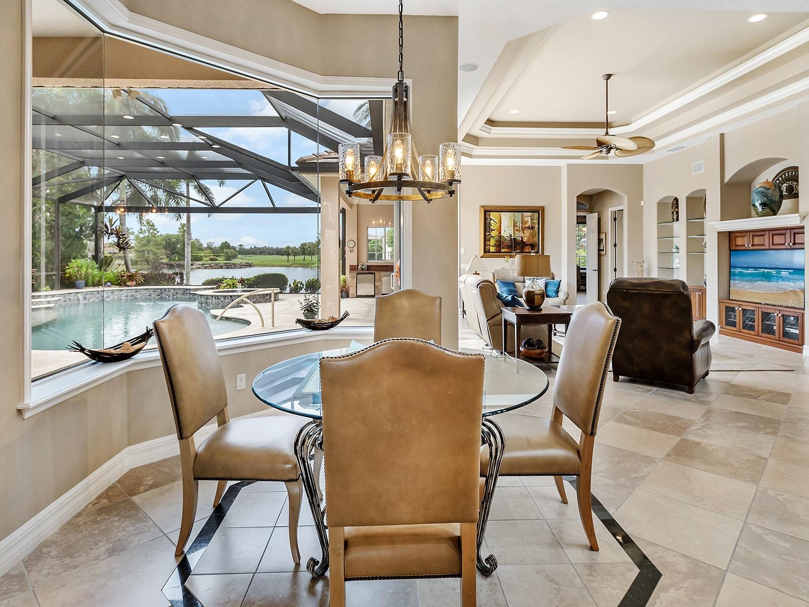 Under contract-accepting backup offers. Set on a private cul-de-sac with sweeping fairway and water views, 12714 Deacons Place offers thoughtfully designed living spaces that blend everyday comfort with refined detail. A circular paver drive and manicured landscaping establish the home’s stately curb appeal, while coach lighting and elegant columns frame the entry. A brand new roof will be installed in October of 2025. Inside, 20-inch porcelain tile with granite inlay sets the tone in a foyer that leads seamlessly into light-filled gathering spaces. The kitchen was created with functionality and design in mind, appointed with granite countertops, Brookhaven® cherry wood cabinetry, a floating prep island with an instant-hot faucet, and top-tier appliances. Appliances include a GE Monogram refrigerator and freezer, Bosch dishwasher, GE wall oven with microwave and warming drawer, a six-burner GE gas cooktop, and a Thermador vent hood that vents to the exterior. A spacious walk-in pantry, art niche, and breakfast nook framed by an aquarium window enhance both function and charm. Just beyond, a butler’s pantry and wet bar connect to the dining room, which is accented by columns, a chandelier medallion, and a tray ceiling with uplighting. The home’s main living areas are designed for effortless living. In the living room, a coffered ceiling and gas fireplace are flanked by custom built-ins, while sliders open to the lanai. The family room features layered tray ceilings, glass shelving, and lanai access zero-corner sliders that dissolve the boundary between indoors and out. A large bonus room with lanai access offers flexibility as a media retreat, additional bedroom, or creative space, complete with surround sound and lake views. The primary suite is a private retreat, entered through double doors into a sitting alcove framed by bay windows with lanai access. The suite offers two walk-in closets, one of which is exceptionally spacious and features custom built-ins with a center island. The en-suite bath is richly appointed with marble floors, a glass-block walk-in shower with multiple shower heads, a Jacuzzi tub, dual vanities with marble tops, and a makeup station. Two sizable guest suites each provide generously sized closets and access to beautifully finished baths, while two half baths and a pool bath serve family and visitors with ease. Outdoor living is a focal point of the residence. The expansive lanai, finished in travertine, offers two covered areas, surround sound, and a vaulted cabana-style ceiling with custom trim. A full outdoor kitchen with granite counters, stainless cabinetry, and a Lynx grill anchors one side, while a fireplace with a cast-stone mantle adds warmth and elegance. The Pebble Tec pool with sun shelf, spa, and cascading water feature is framed by lush landscaping that ensures privacy. Additional features include a three-car garage with storage, central vacuum, surround sound in the living room, family room, bonus room, and lanai. TVs and media equipment also convey. From its architectural details to its inviting indoor-outdoor flow, this residence is equally suited to relaxed living and sophisticated entertaining. With the recent expansion to include a fourth golf course, Lakewood Ranch Golf and Country Club offers unmatched access to premier golfing. Residents can choose from a variety of membership options. Ideally just minutes from The UTC, Waterside, and LWR Main Street. The home is also within easy reach of dining, shopping, and renowned beaches.